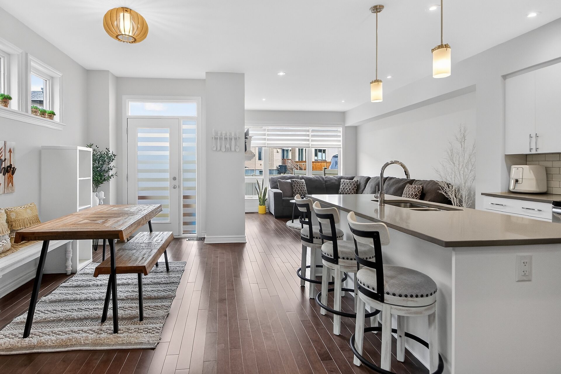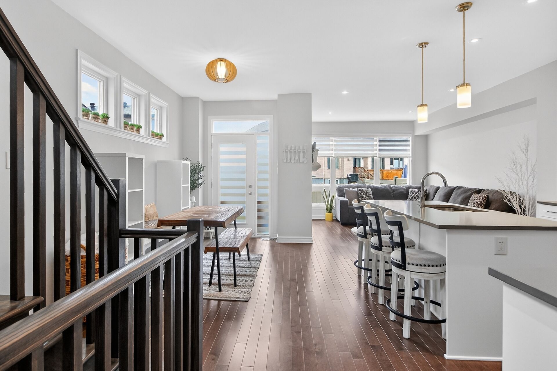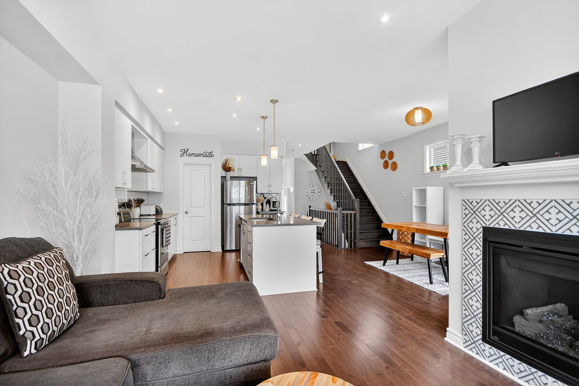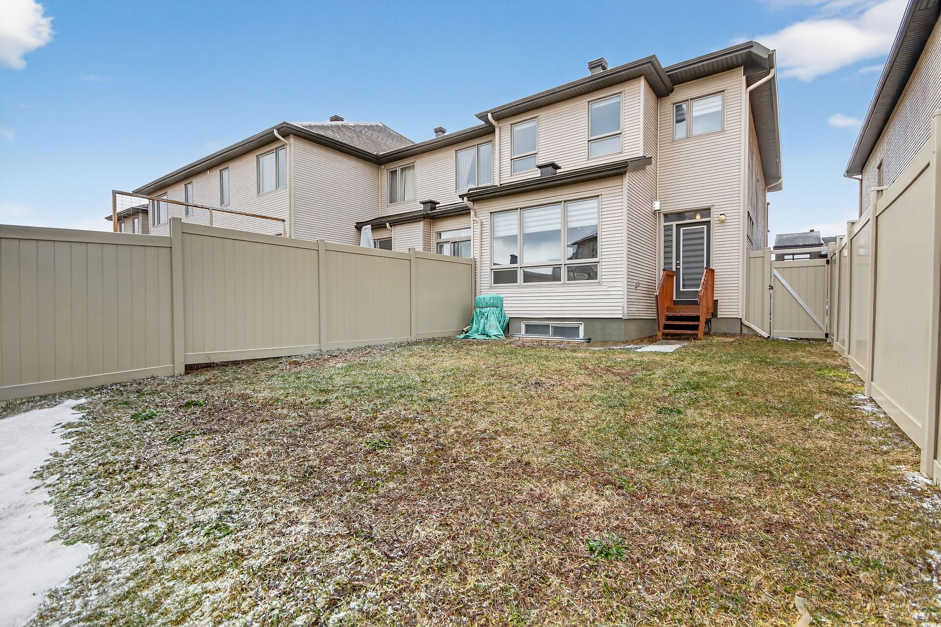 Beautifully maintained 3-bedroom townhome in sought-after riverside south that shows like a new home, offering over $45,000 in upgrades and a premium lot backing onto a pie-shaped yard, providing added privacy. The main floor features 9 foot ceilings, a stunning kitchen with quartz countertops, a large island, ample counter space, generous cabinetry, and a spacious pantry, flowing into a bright dining area with a door leading to the large fully fenced backyard. The inviting living room is filled with natural light from large windows, features a beautiful gas fireplace, and includes custom blinds. A welcoming foyer with professionally done wood panel accent wall and convenient powder room complete this level. Upstairs, the spacious primary bedroom is filled with natural light and features a luxurious 5-piece ensuite with double sinks, stand alone shower, and a large soaker tub, along with a sizeable walk-in closet. Two additional well-sized bedrooms, a stylish main bathroom, and a conveniently located laundry room complete the upper level. The finished basement offers additional living space, bathroom rough in along with plenty of storage. Located close to parks, schools, shopping, recreation facilities, trails, the lrt, and the scenic rideau river, as well as the airport. 24 hours irrevocable on all offers.