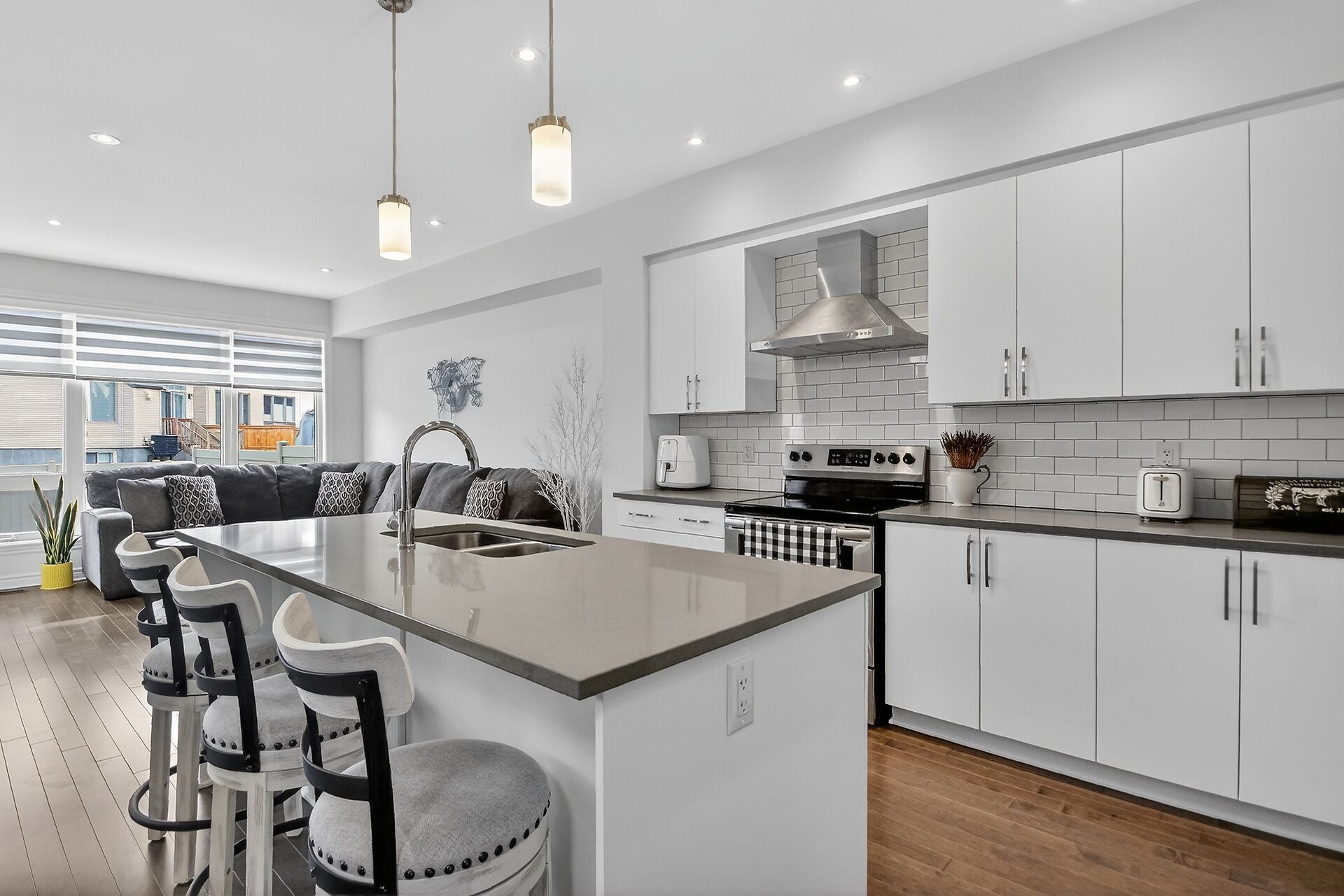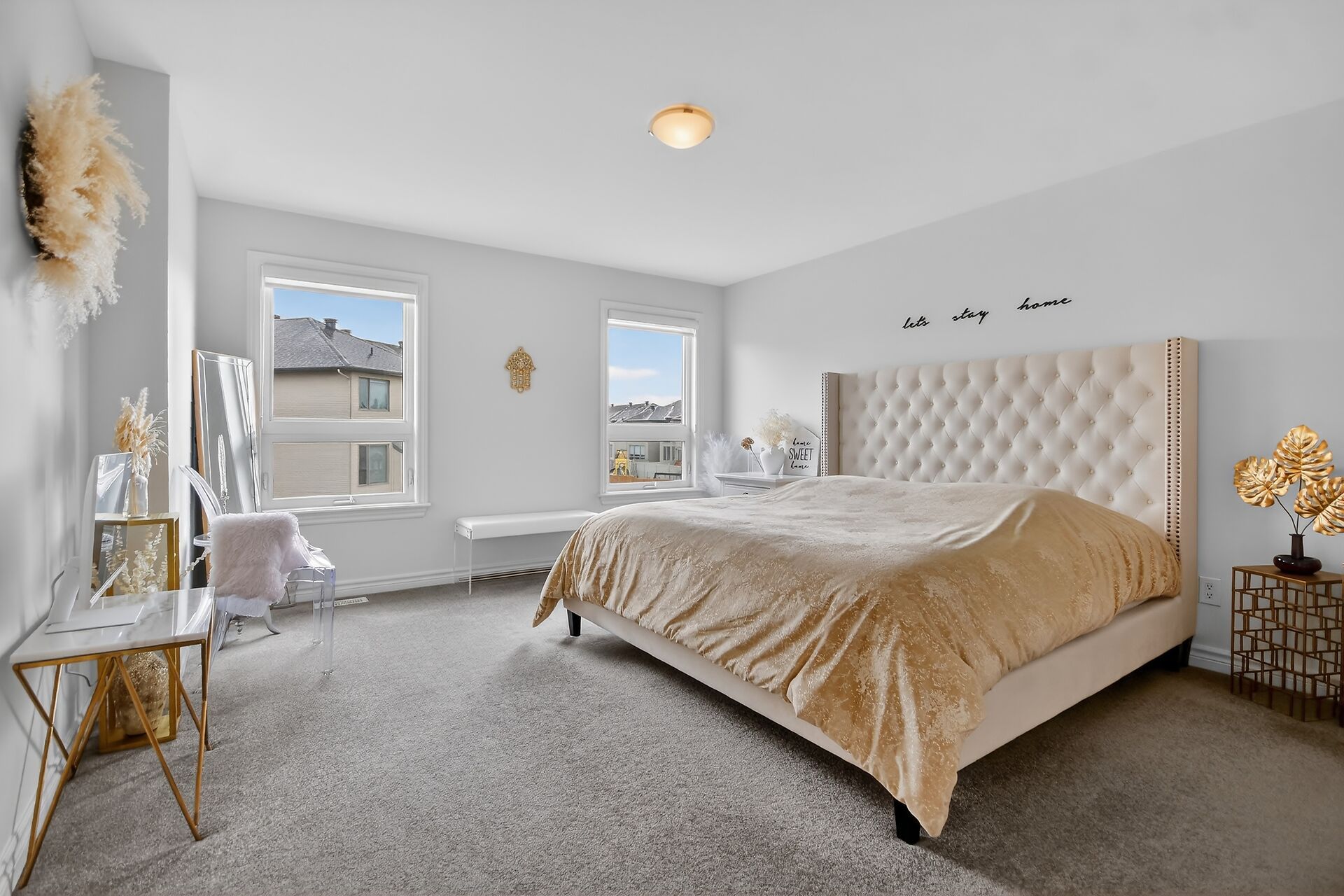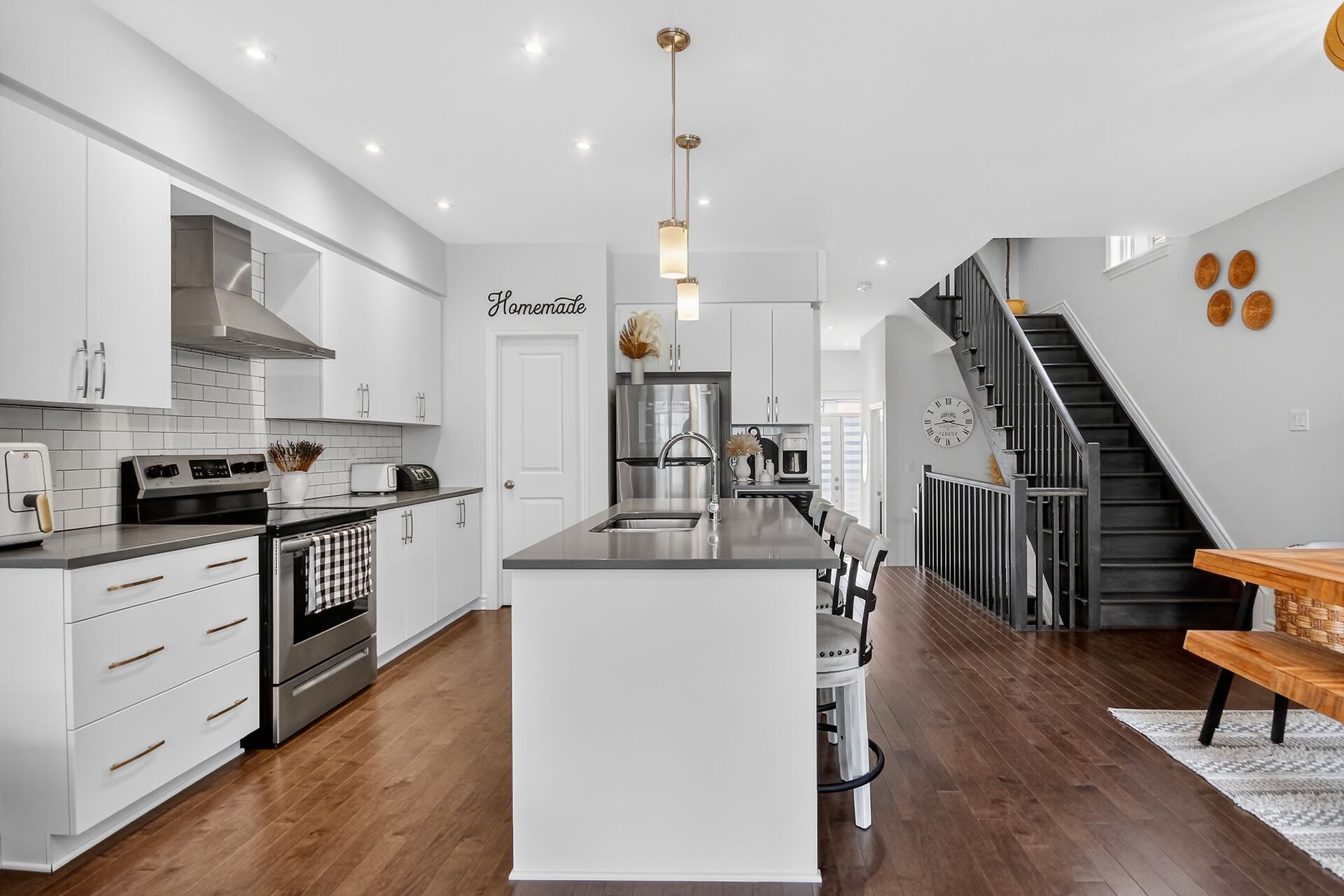 Beautifully maintained 3-bedroom townhome in sought-after riverside south that shows like a new home, offering over $45,000 in upgrades and a premium lot backing onto a pie-shaped yard, providing added privacy. The main floor features 9 foot ceilings, a stunning kitchen with quartz countertops, a large island, ample counter space, generous cabinetry, and a spacious pantry, flowing into a bright dining area with a door leading to the large fully fenced backyard. The inviting living room is filled with natural light from large windows, features a beautiful gas fireplace, and includes custom blinds. A welcoming foyer with professionally done wood panel accent wall and convenient powder room complete this level. Upstairs, the spacious primary bedroom is filled with natural light and features a luxurious 5-piece ensuite with double sinks, stand alone shower, and a large soaker tub, along with a sizeable walk-in closet. Two additional well-sized bedrooms, a stylish main bathroom, and a conveniently located laundry room complete the upper level. The finished basement offers additional living space, bathroom rough in along with plenty of storage. Located close to parks, schools, shopping, recreation facilities, trails, the lrt, and the scenic rideau river, as well as the airport. 24 hours irrevocable on all offers.