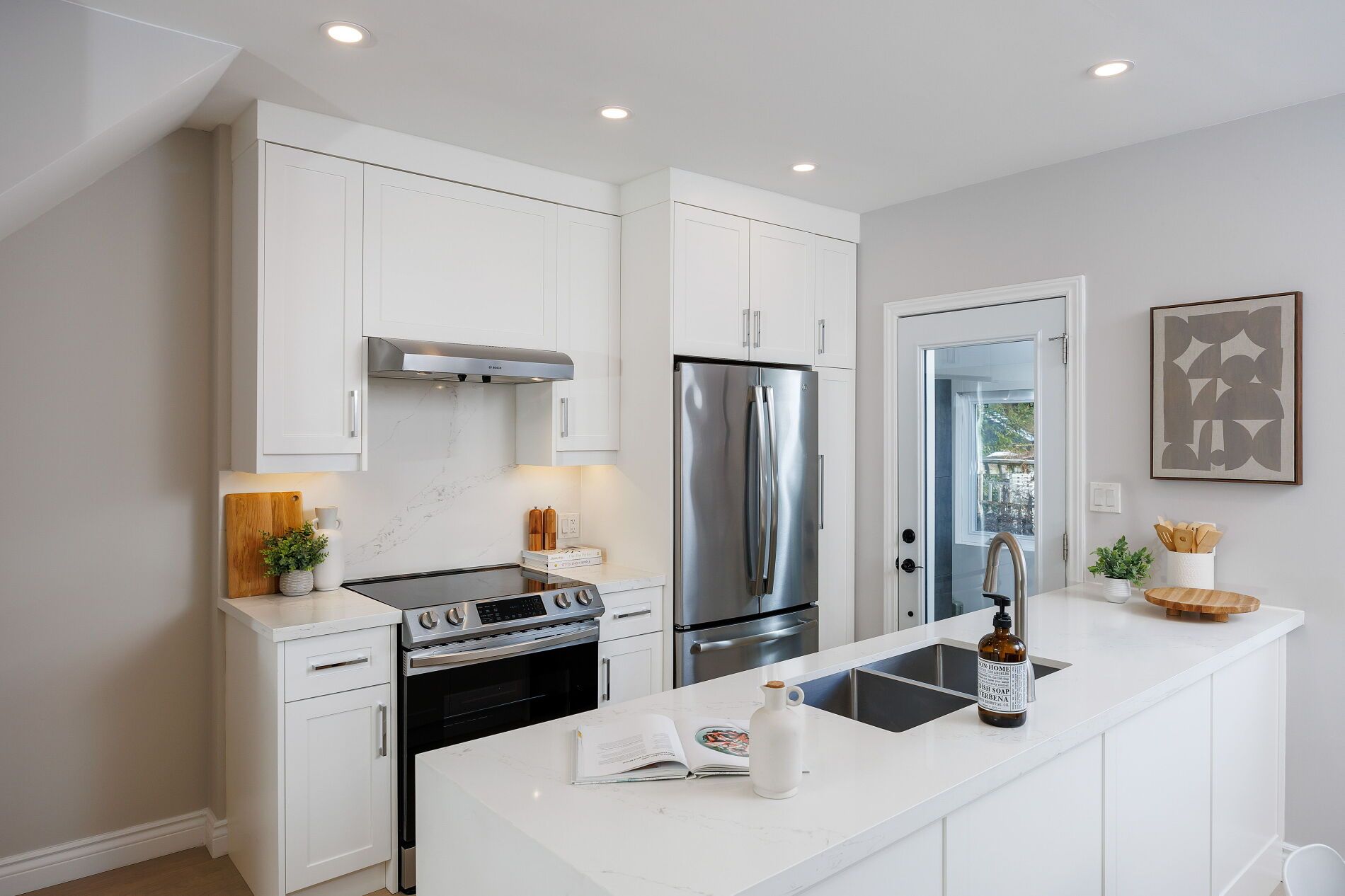 • Designer eat-in kitchen with quartz countertops and high-end appliances.