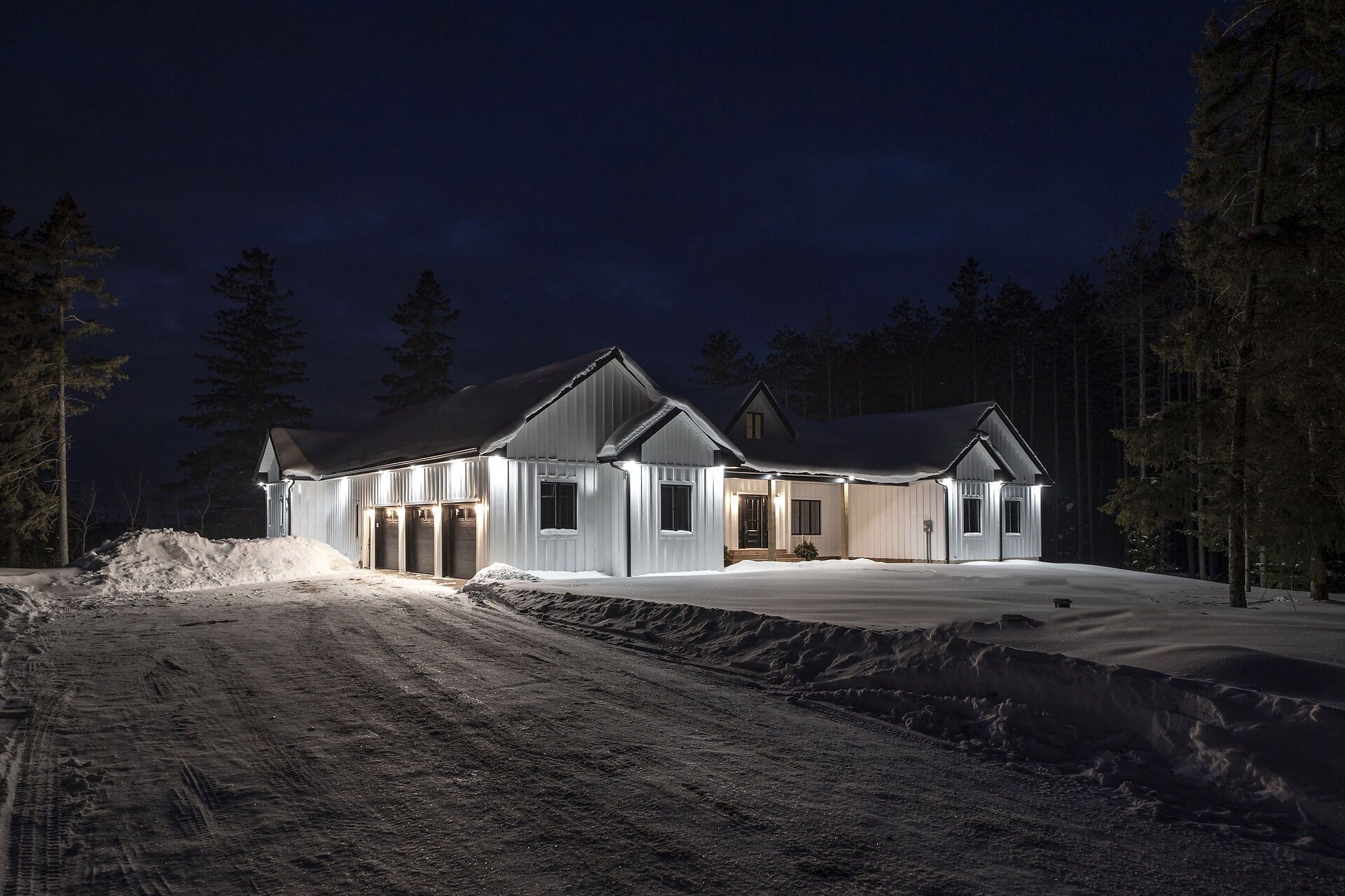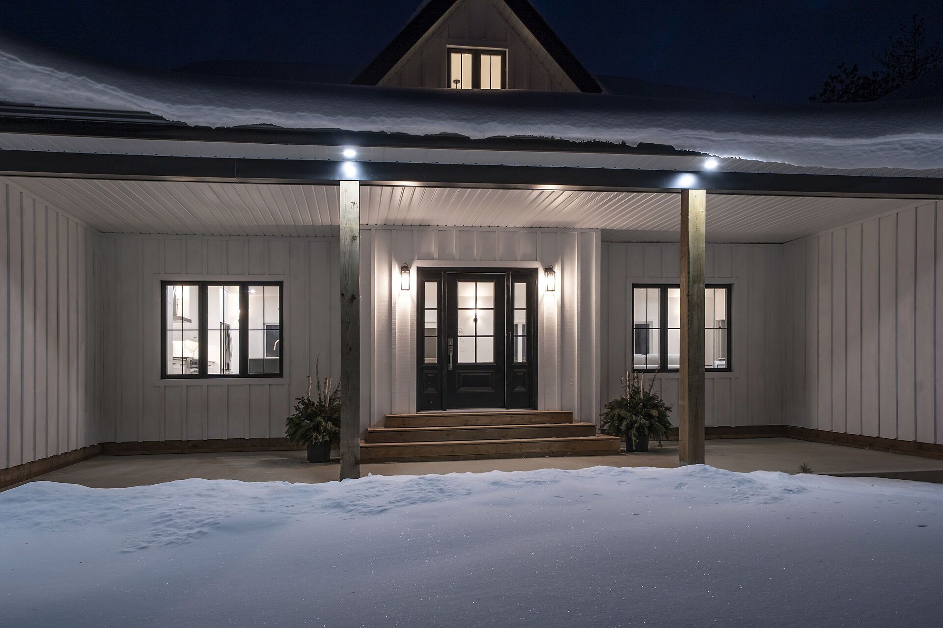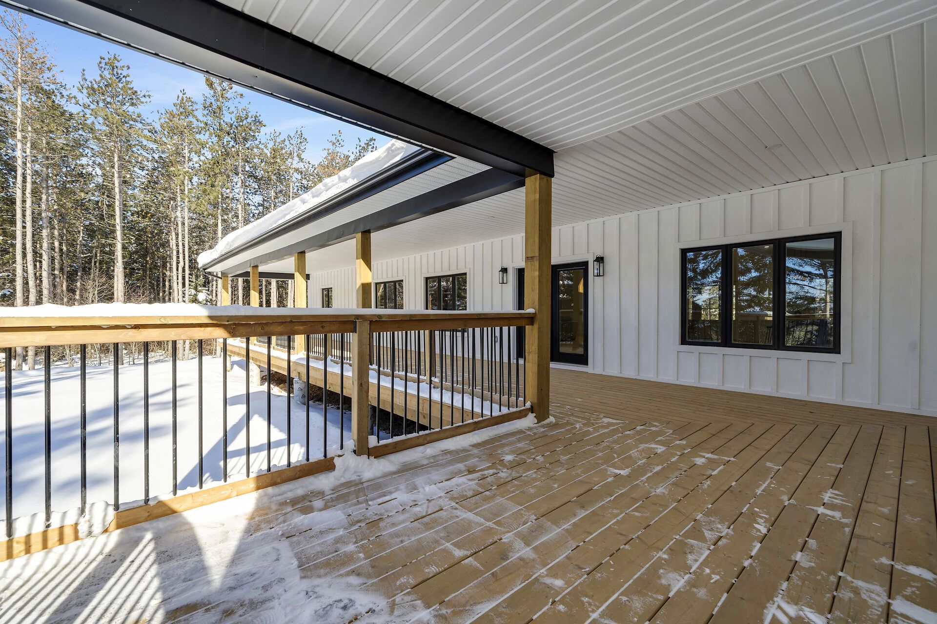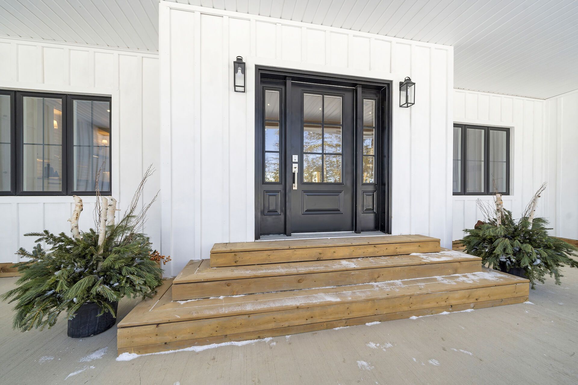 When modern farm house is touched with elegance and sophistication you are presented with 5450 fifth line. This nearly 3000 sq ft custom bungalow is crafted to ensure the exterior meets the interior. Relaxed country warmth, with clean lines, soaring ceilings and thoughtful finishes throughout. You'll be captivated by the 1300 sq foot great room with 21' cathedral ceiling plus living, dining and kitchen all blended in harmony. The floor to ceiling fireplace focal point, is wrapped with built-ins and a hemlock barn beam mantle. The white oak engineered hardwood in soft neutral tones, flows throughout this masterpiece. The kitchen features a 11' island with seating for 5 and an under counter farm house sink showing off the quartz countertop. High end 6 burner gas 4' stove/oven combo with thoughtfully placed pull out pantry drawers and a functional pot filler. Just off the entry from the 3-car garage is a generous mudroom, laundry and powder room to keep daily life organized. The primary suite is tucked away, offering a quiet retreat with views of the trees and a walkout to the 65' wrap around deck. Get ready for the ensuite with 2 partner vanities, freestanding soaker tub and double walkway into the natural light shower. Then meander into the huge walk-in closet all ready for your inspiration. Additional bedrooms are thoughtfully separated with their own jack and jill bathroom, and the 4th with its own ensuite, giving it so many uses. The basement with its soaring 9' ceilings and large windows is a canvas ready for your creativity. On the outside you will celebrate a 2-acre treed lot, where you are able to breathe, create gardens or that backyard oasis, complete with pool and outdoor kitchen, surrounded by the covered deck. It is close to town, but you are able to watch the sun rise with your morning coffee and the sun set with your glass of shiraz. This bungalow offers 'everything you need' today, while remaining practical and timeless for years to come.