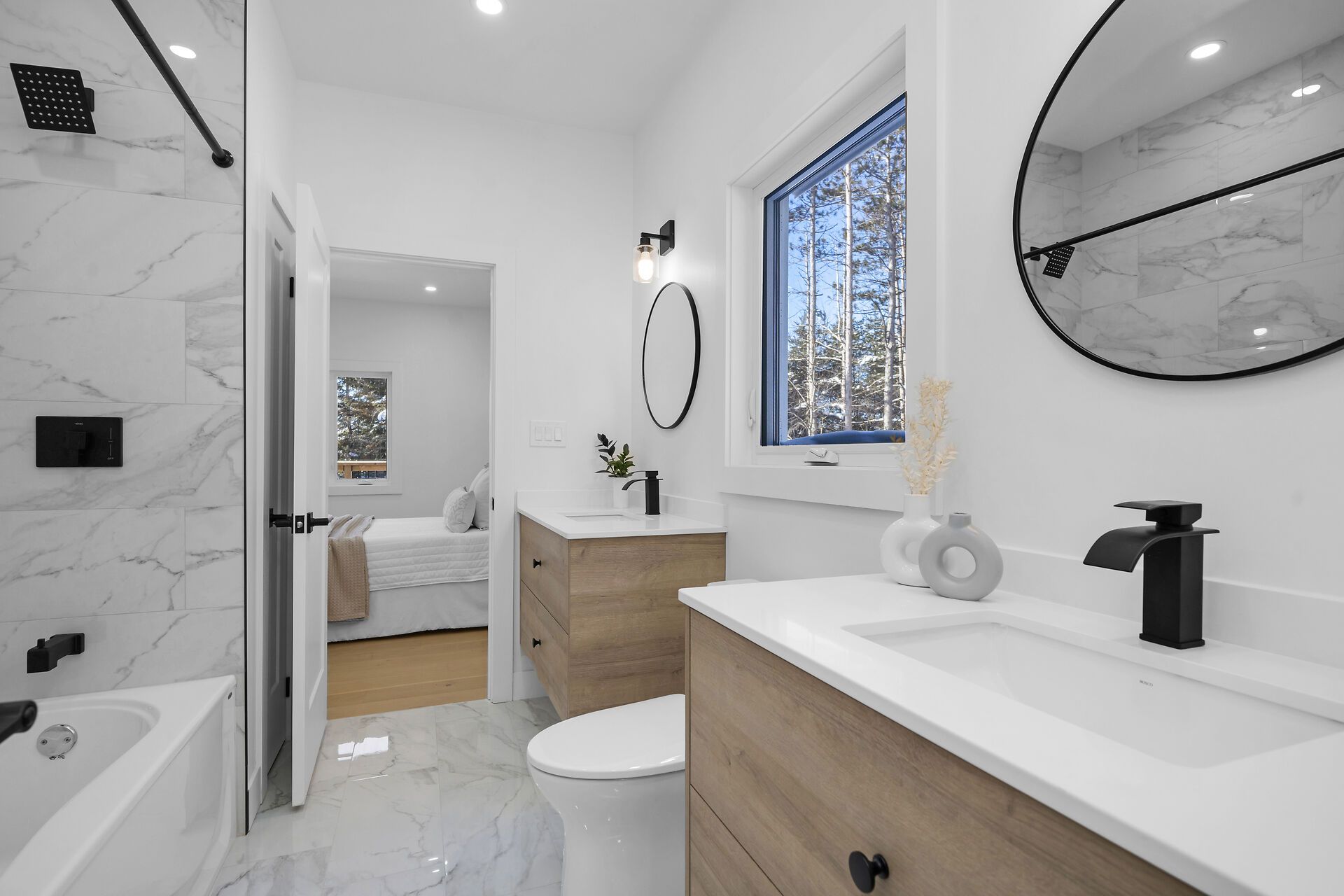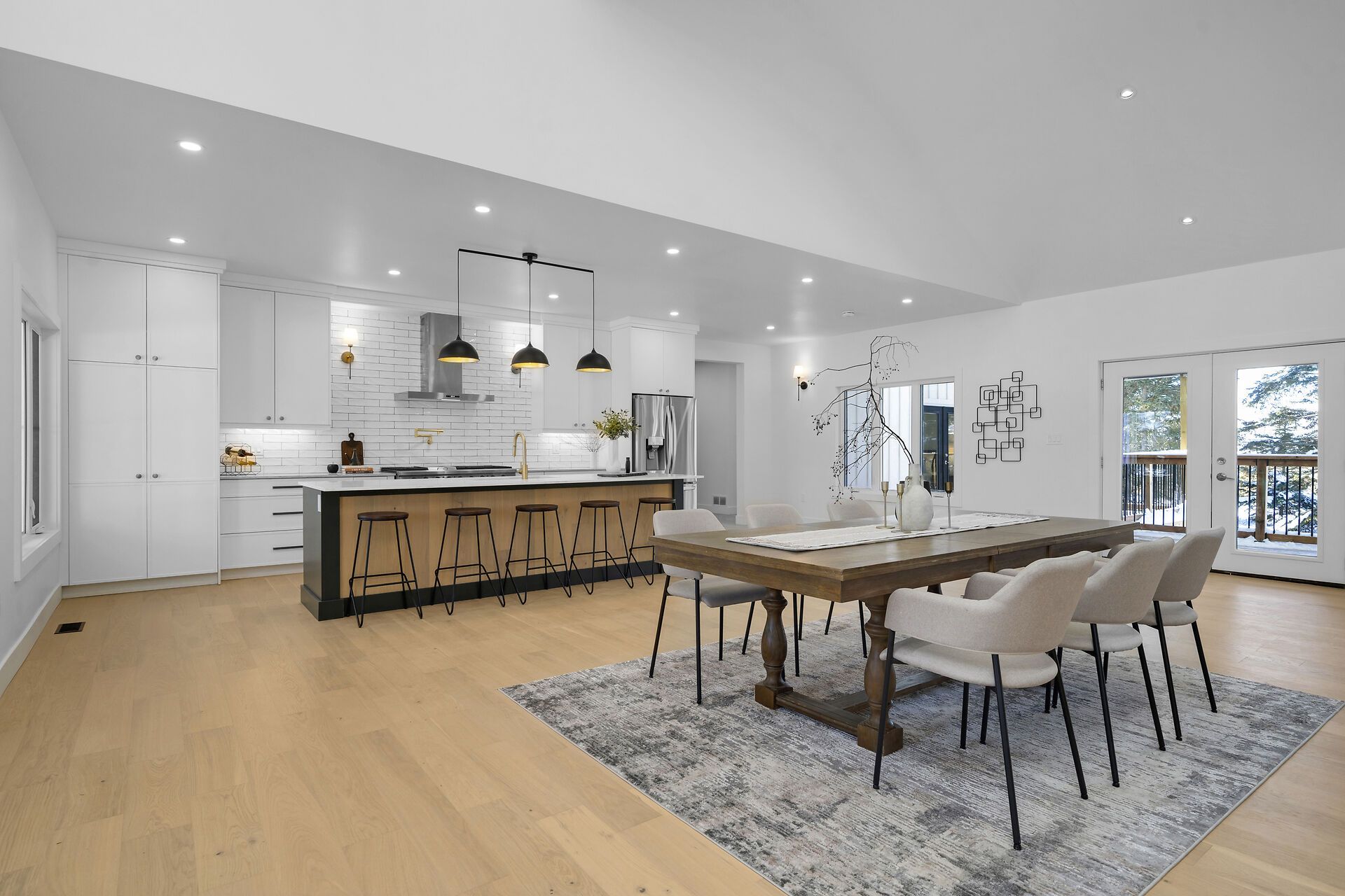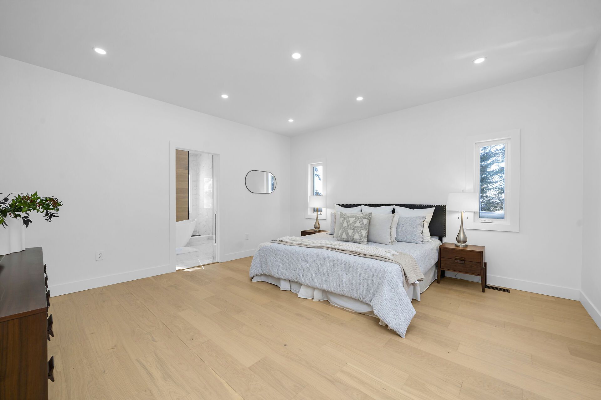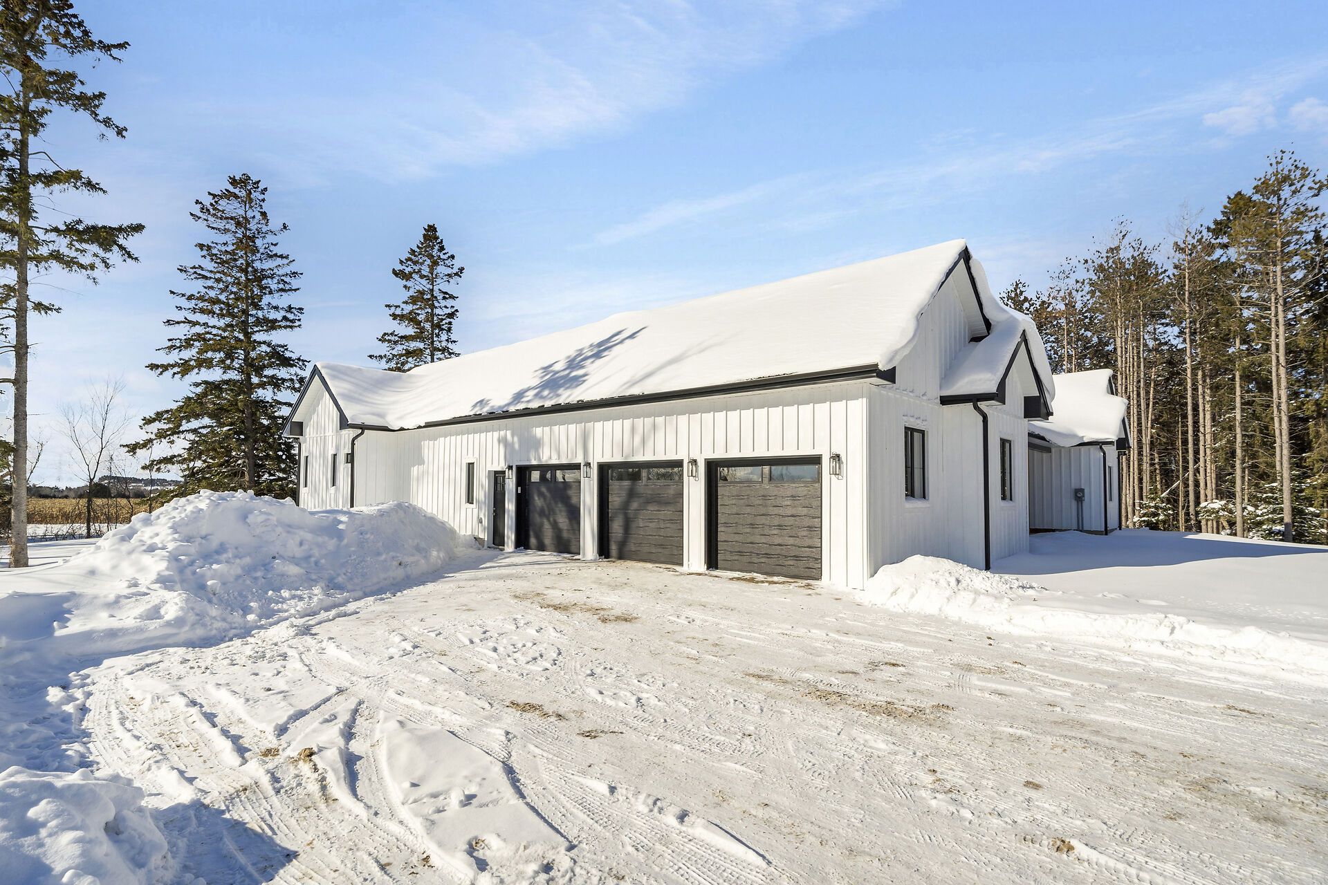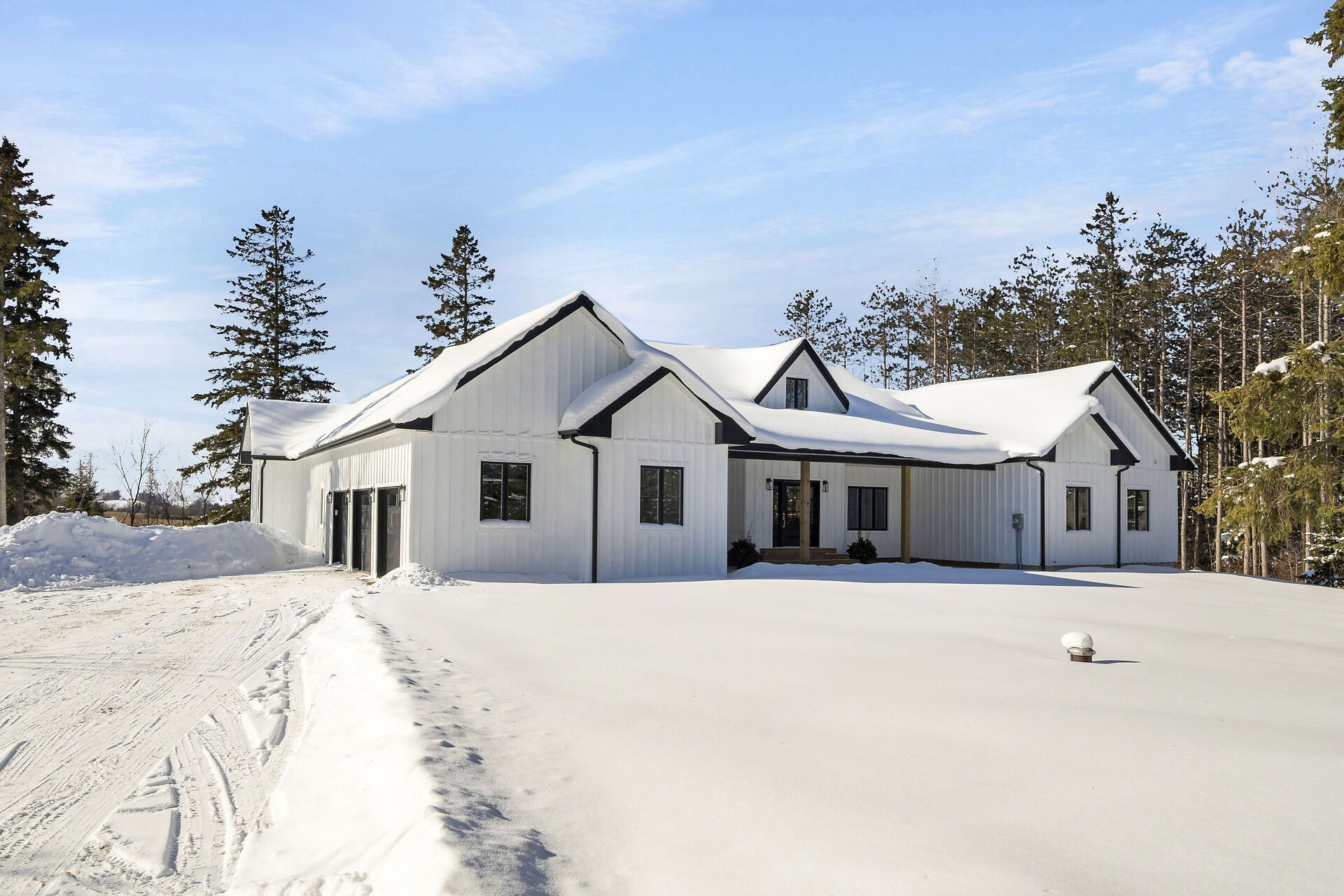 When modern farm house is touched with elegance and sophistication you are presented with 5450 fifth line. This nearly 3000 sq ft custom bungalow is crafted to ensure the exterior meets the interior. Relaxed country warmth, with clean lines, soaring ceilings and thoughtful finishes throughout. You'll be captivated by the 1300 sq foot great room with 21' cathedral ceiling plus living, dining and kitchen all blended in harmony. The floor to ceiling fireplace focal point, is wrapped with built-ins and a hemlock barn beam mantle. The white oak engineered hardwood in soft neutral tones, flows throughout this masterpiece. The kitchen features a 11' island with seating for 5 and an under counter farm house sink showing off the quartz countertop. High end 6 burner gas 4' stove/oven combo with thoughtfully placed pull out pantry drawers and a functional pot filler. Just off the entry from the 3-car garage is a generous mudroom, laundry and powder room to keep daily life organized. The primary suite is tucked away, offering a quiet retreat with views of the trees and a walkout to the 65' wrap around deck. Get ready for the ensuite with 2 partner vanities, freestanding soaker tub and double walkway into the natural light shower. Then meander into the huge walk-in closet all ready for your inspiration. Additional bedrooms are thoughtfully separated with their own jack and jill bathroom, and the 4th with its own ensuite, giving it so many uses. The basement with its soaring 9' ceilings and large windows is a canvas ready for your creativity. On the outside you will celebrate a 2-acre treed lot, where you are able to breathe, create gardens or that backyard oasis, complete with pool and outdoor kitchen, surrounded by the covered deck. It is close to town, but you are able to watch the sun rise with your morning coffee and the sun set with your glass of shiraz. This bungalow offers 'everything you need' today, while remaining practical and timeless for years to come.