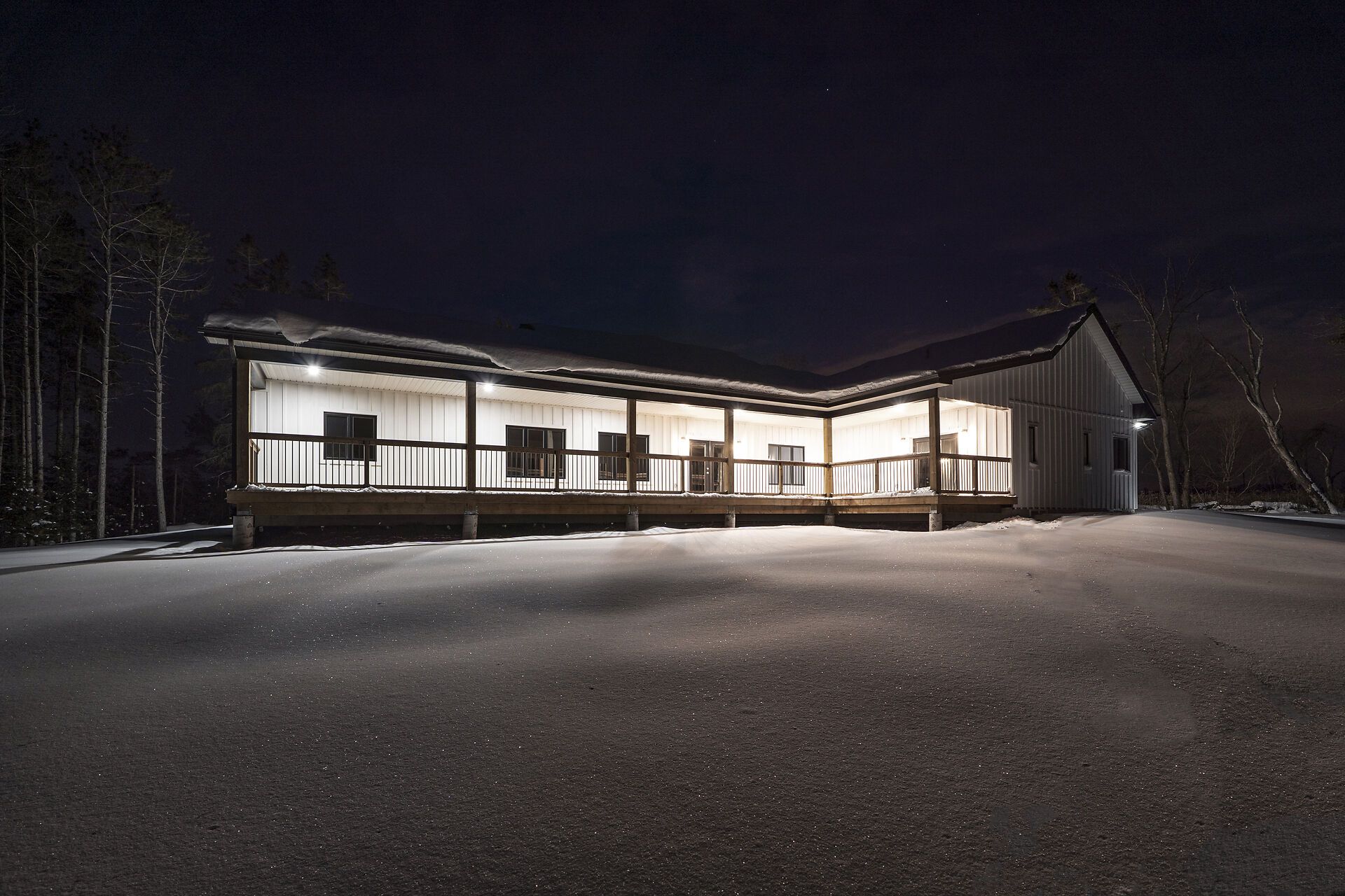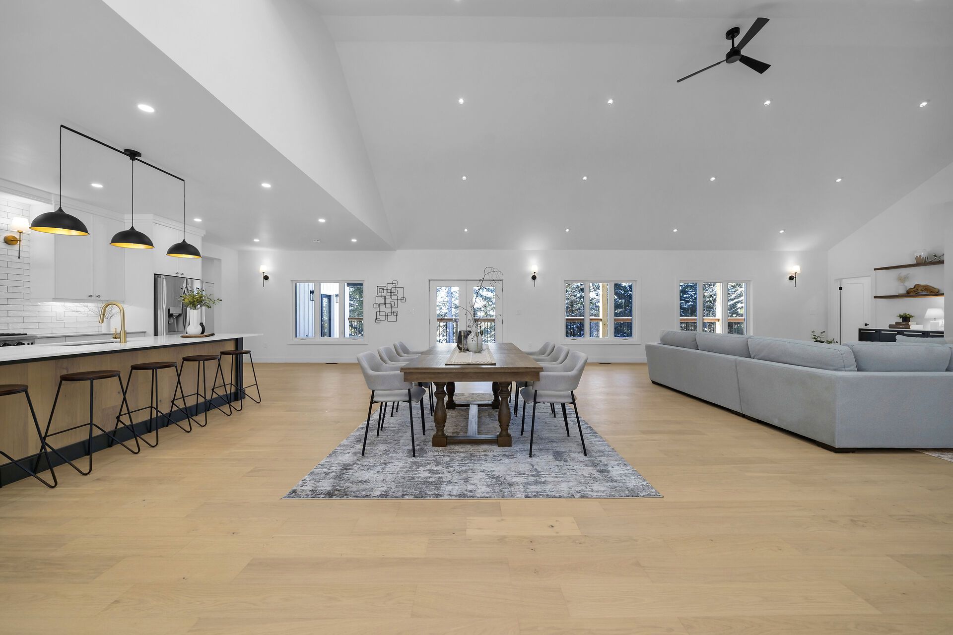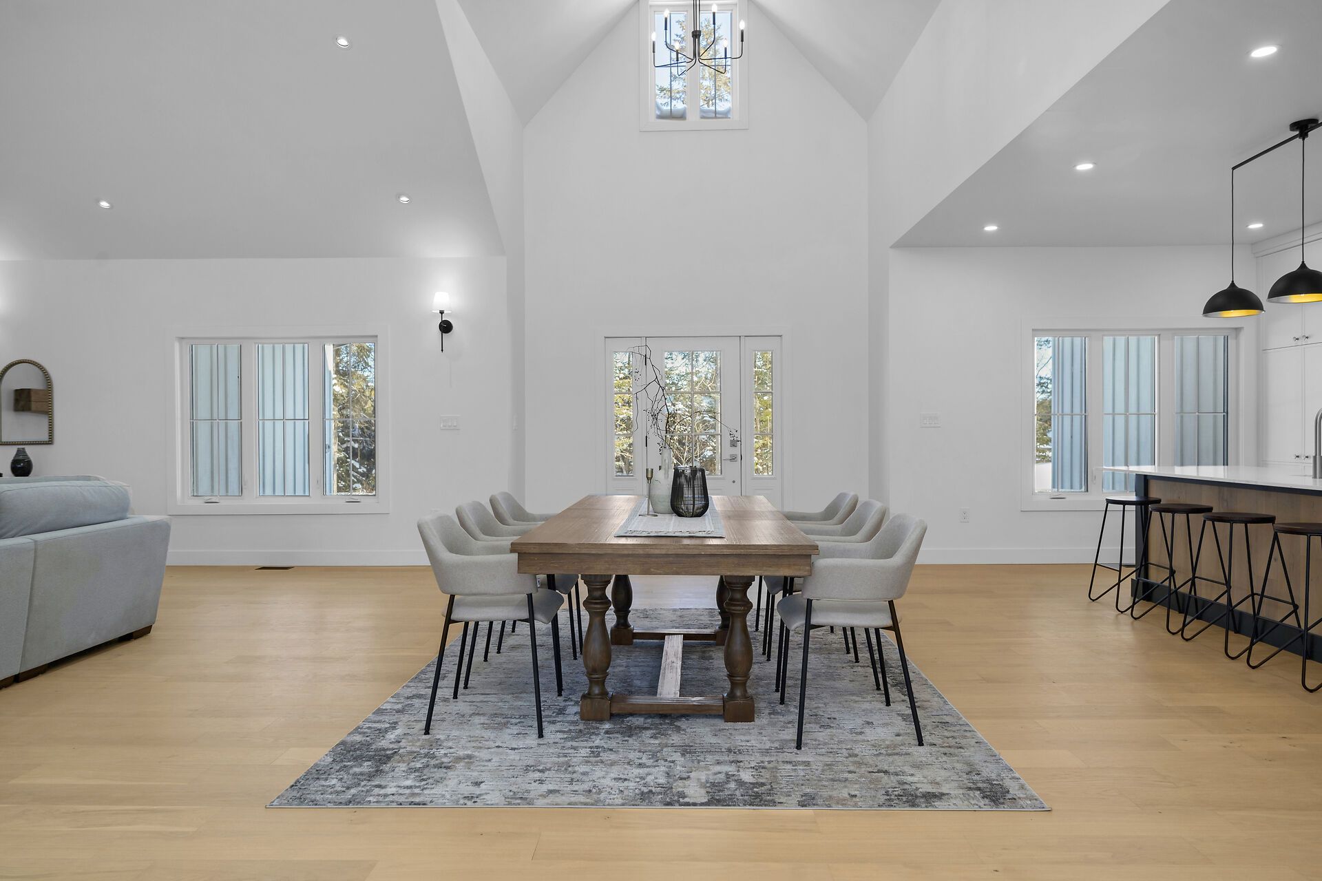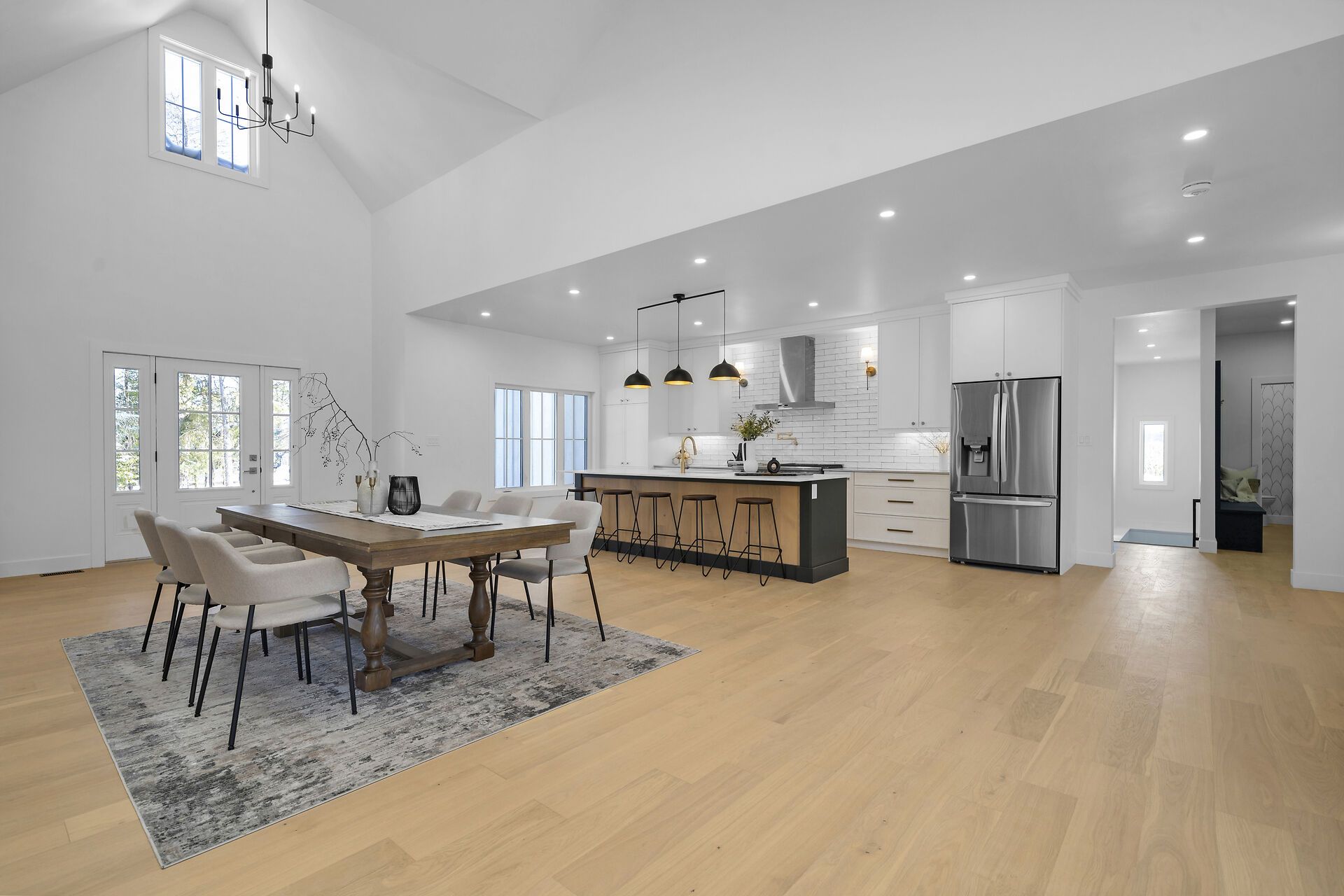 When modern farm house is touched with elegance and sophistication you are presented with 5450 fifth line. This nearly 3000 sq ft custom bungalow is crafted to ensure the exterior meets the interior. Relaxed country warmth, with clean lines, soaring ceilings and thoughtful finishes throughout. You'll be captivated by the 1300 sq foot great room with 21' cathedral ceiling plus living, dining and kitchen all blended in harmony. The floor to ceiling fireplace focal point, is wrapped with built-ins and a hemlock barn beam mantle. The white oak engineered hardwood in soft neutral tones, flows throughout this masterpiece. The kitchen features a 11' island with seating for 5 and an under counter farm house sink showing off the quartz countertop. High end 6 burner gas 4' stove/oven combo with thoughtfully placed pull out pantry drawers and a functional pot filler. Just off the entry from the 3-car garage is a generous mudroom, laundry and powder room to keep daily life organized. The primary suite is tucked away, offering a quiet retreat with views of the trees and a walkout to the 65' wrap around deck. Get ready for the ensuite with 2 partner vanities, freestanding soaker tub and double walkway into the natural light shower. Then meander into the huge walk-in closet all ready for your inspiration. Additional bedrooms are thoughtfully separated with their own jack and jill bathroom, and the 4th with its own ensuite, giving it so many uses. The basement with its soaring 9' ceilings and large windows is a canvas ready for your creativity. On the outside you will celebrate a 2-acre treed lot, where you are able to breathe, create gardens or that backyard oasis, complete with pool and outdoor kitchen, surrounded by the covered deck. It is close to town, but you are able to watch the sun rise with your morning coffee and the sun set with your glass of shiraz. This bungalow offers 'everything you need' today, while remaining practical and timeless for years to come.