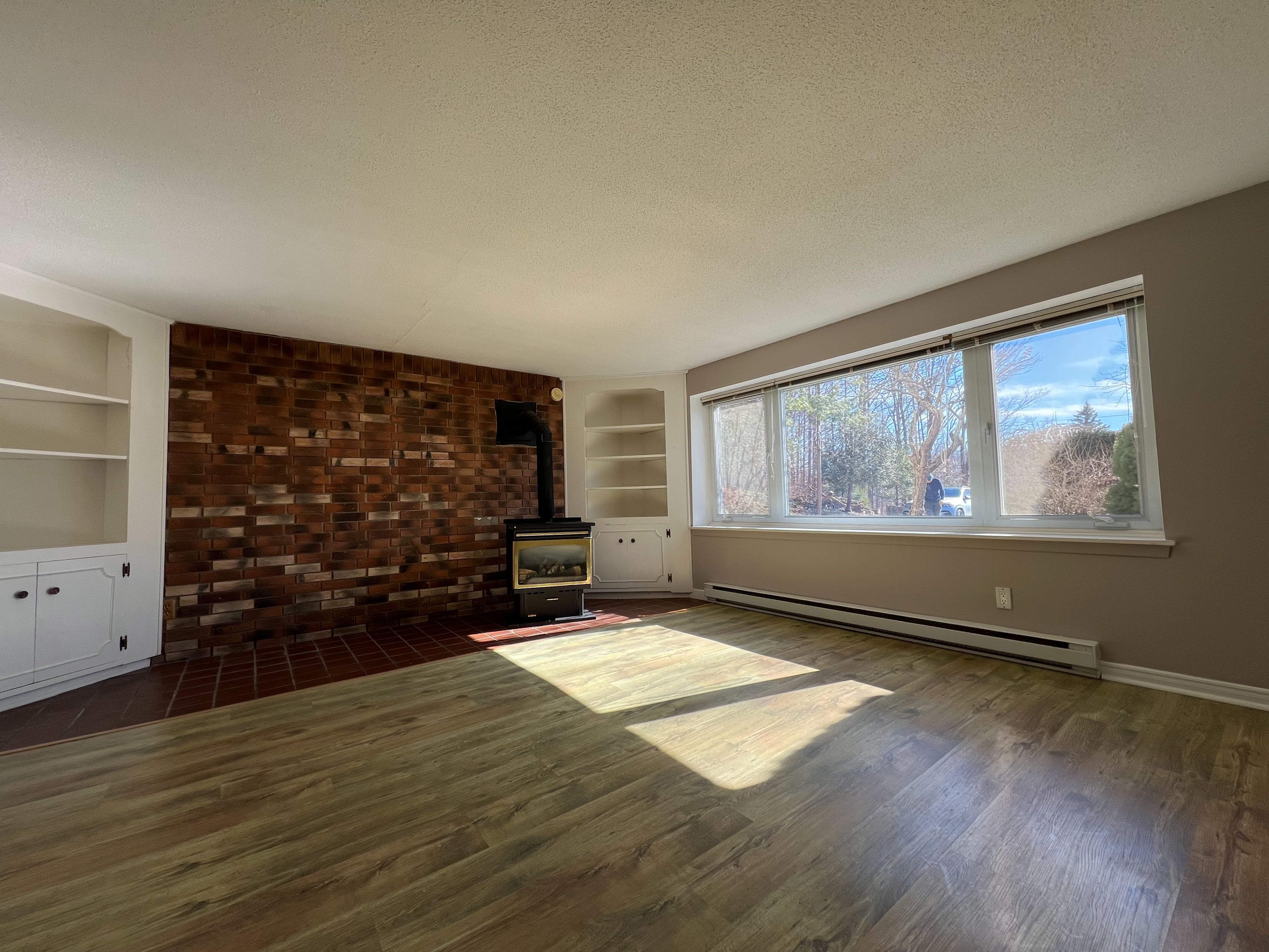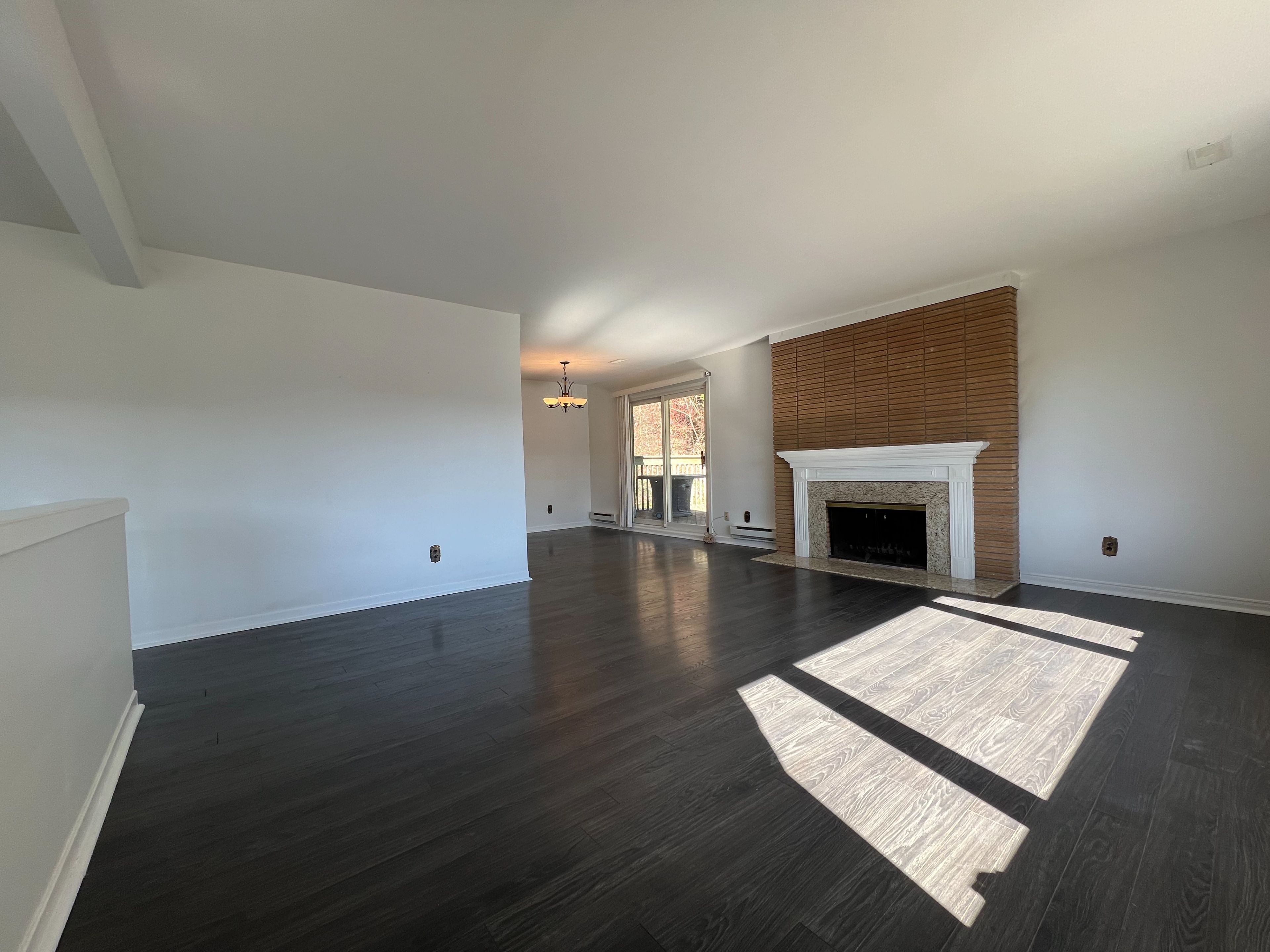 • Living room features a cozy wood fireplace for warmth.