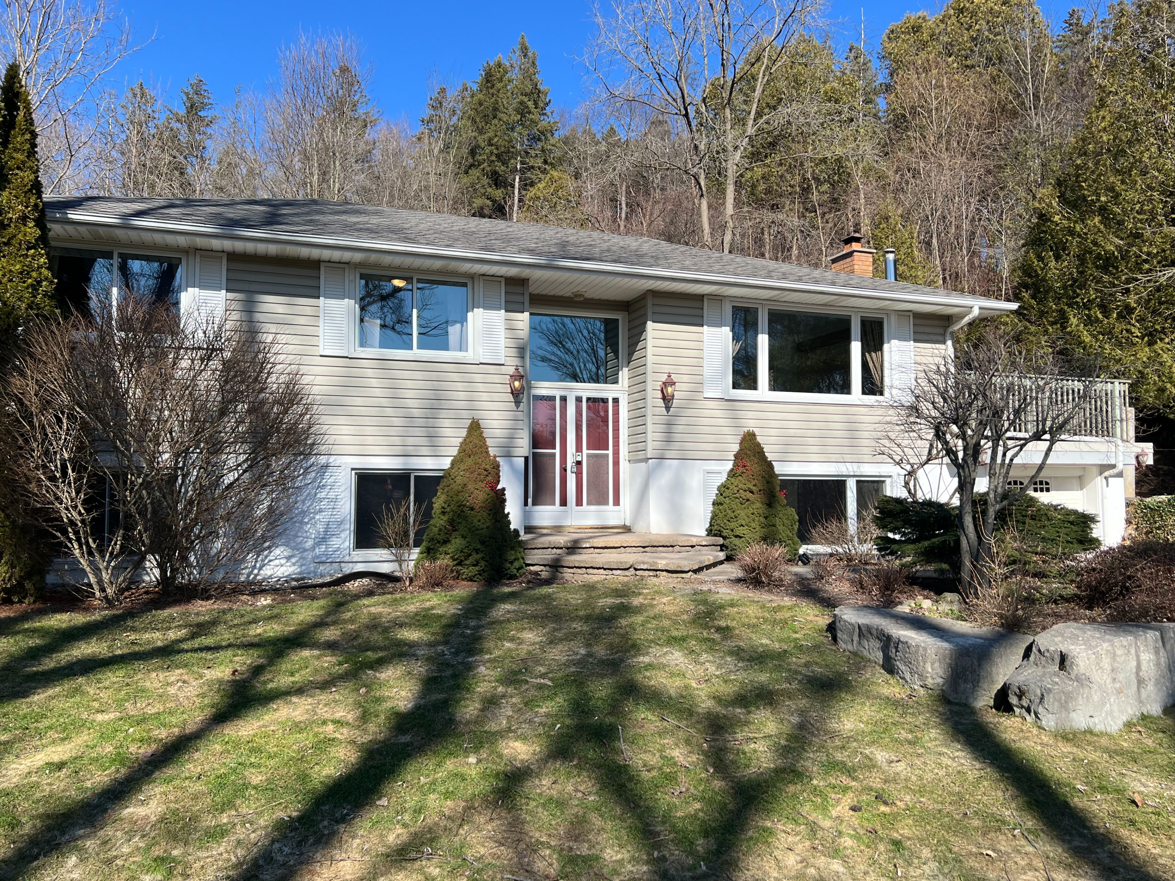 Gorgeous 3 bedroom detached home with stunning 2+ acres w/pond & stream. Raised ranch with elevated deck off driveway, living room w/wood fireplace. Spacious eat-in kitchen w/walking out to small deck & stream. Neutral decor. Large master w/ensuite. Family room with large window.