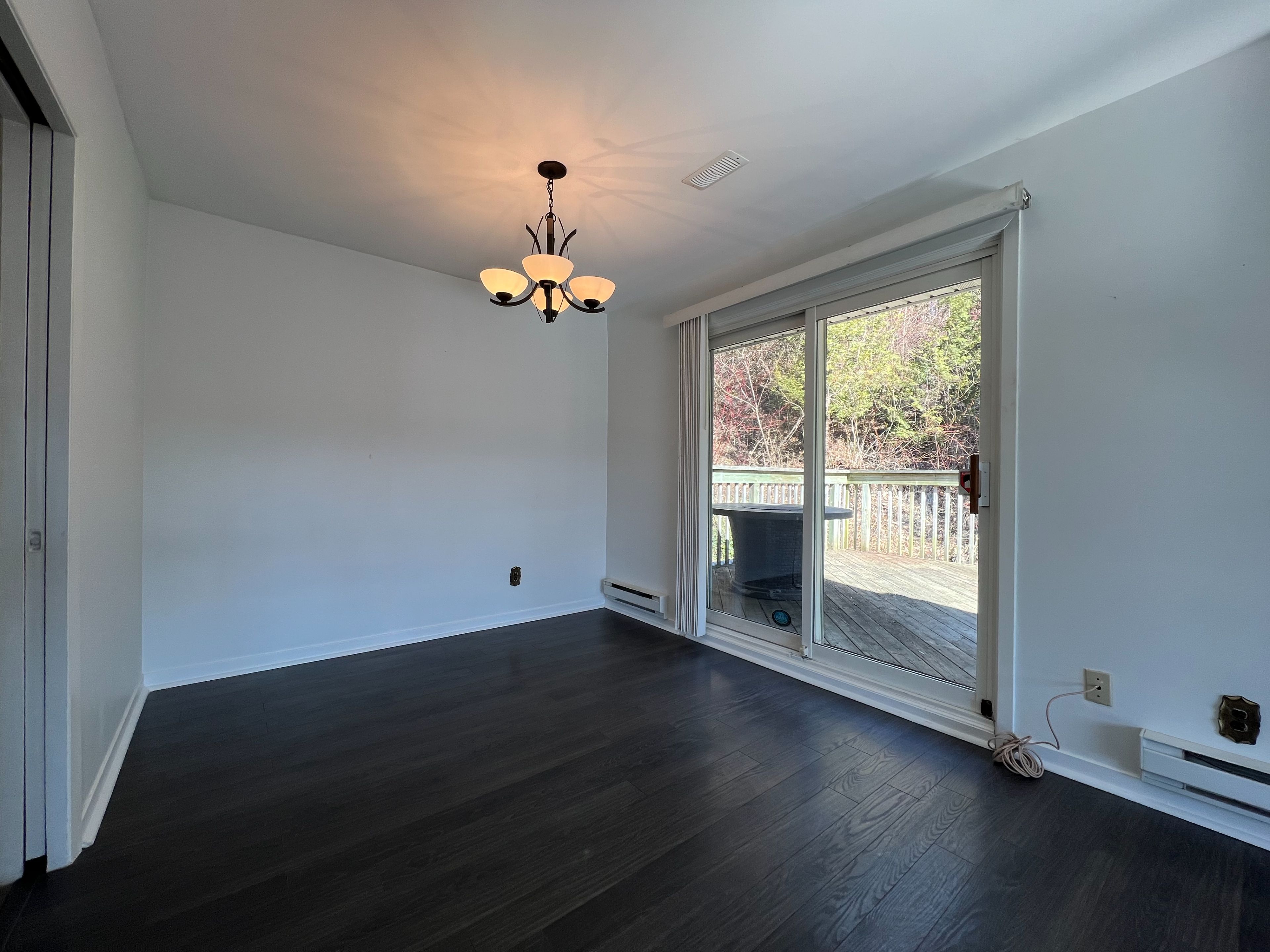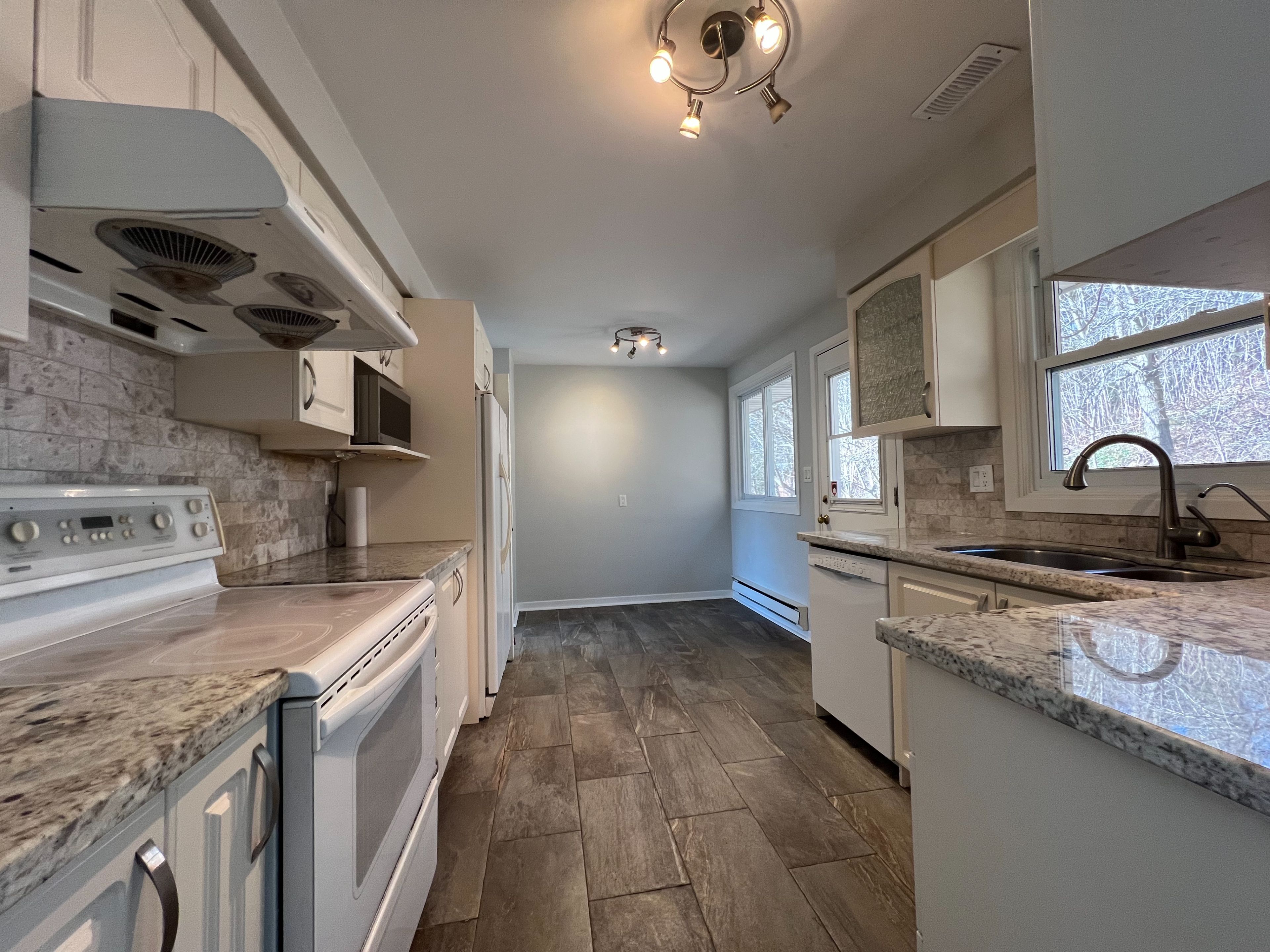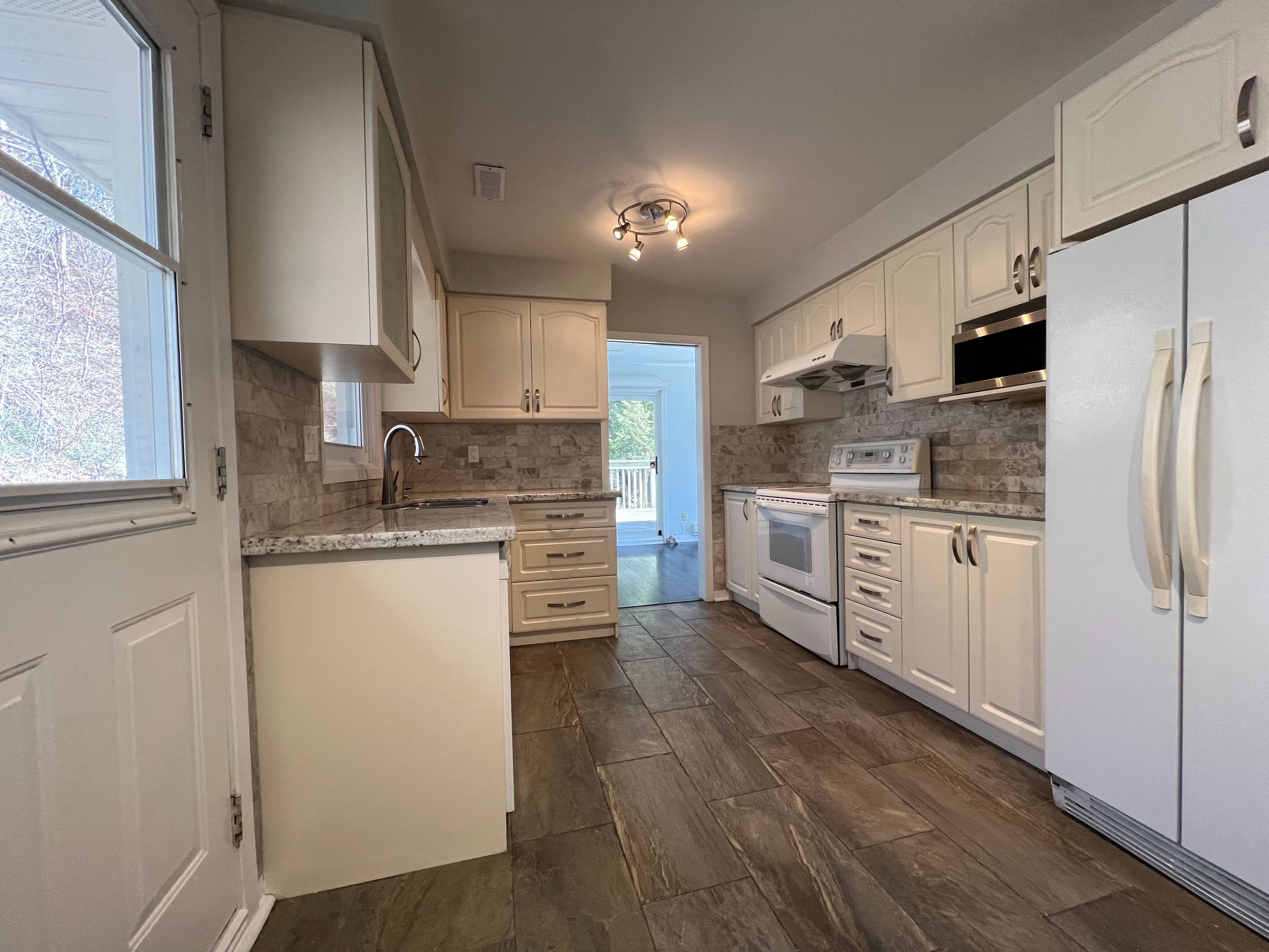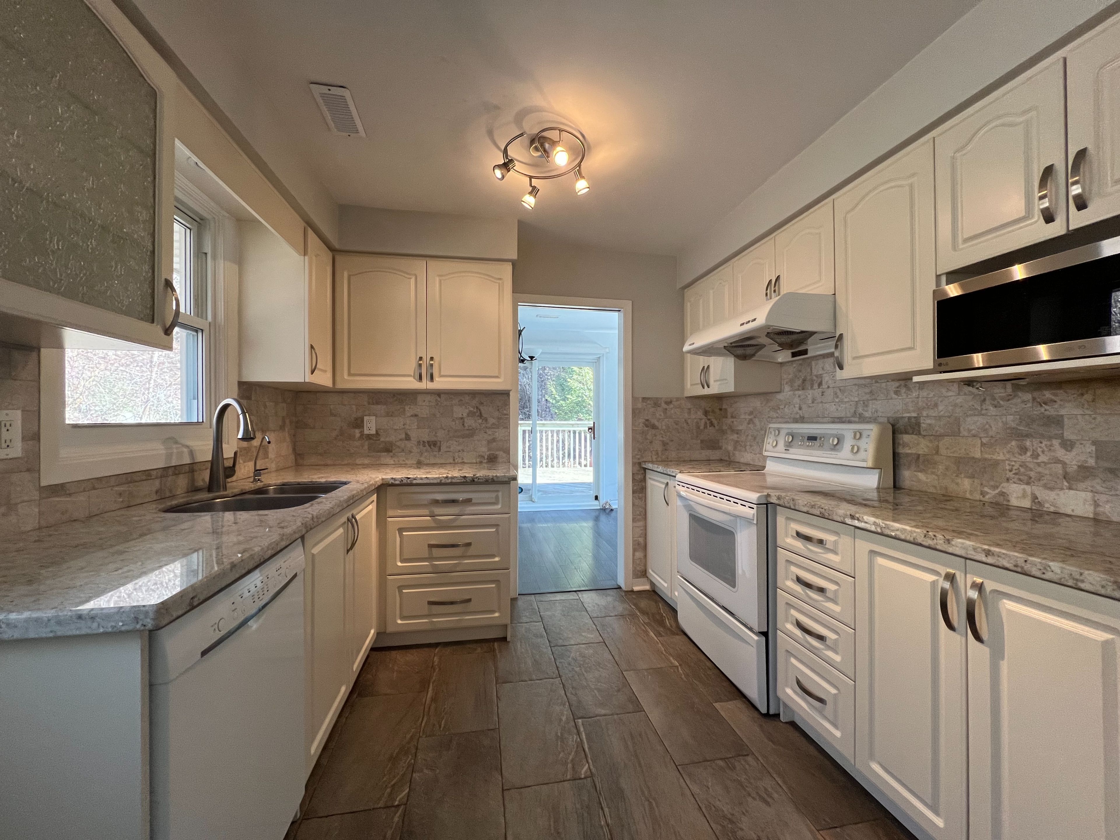 • Spacious eat-in kitchen with access to a small deck and stream.