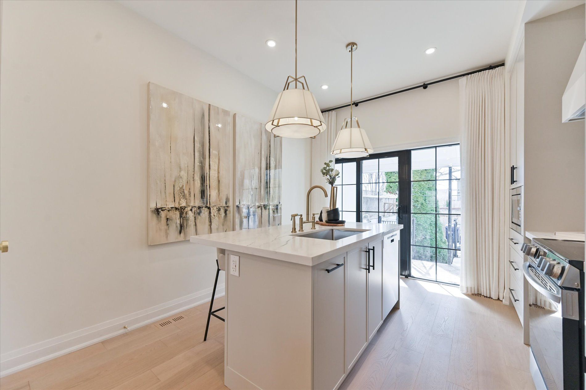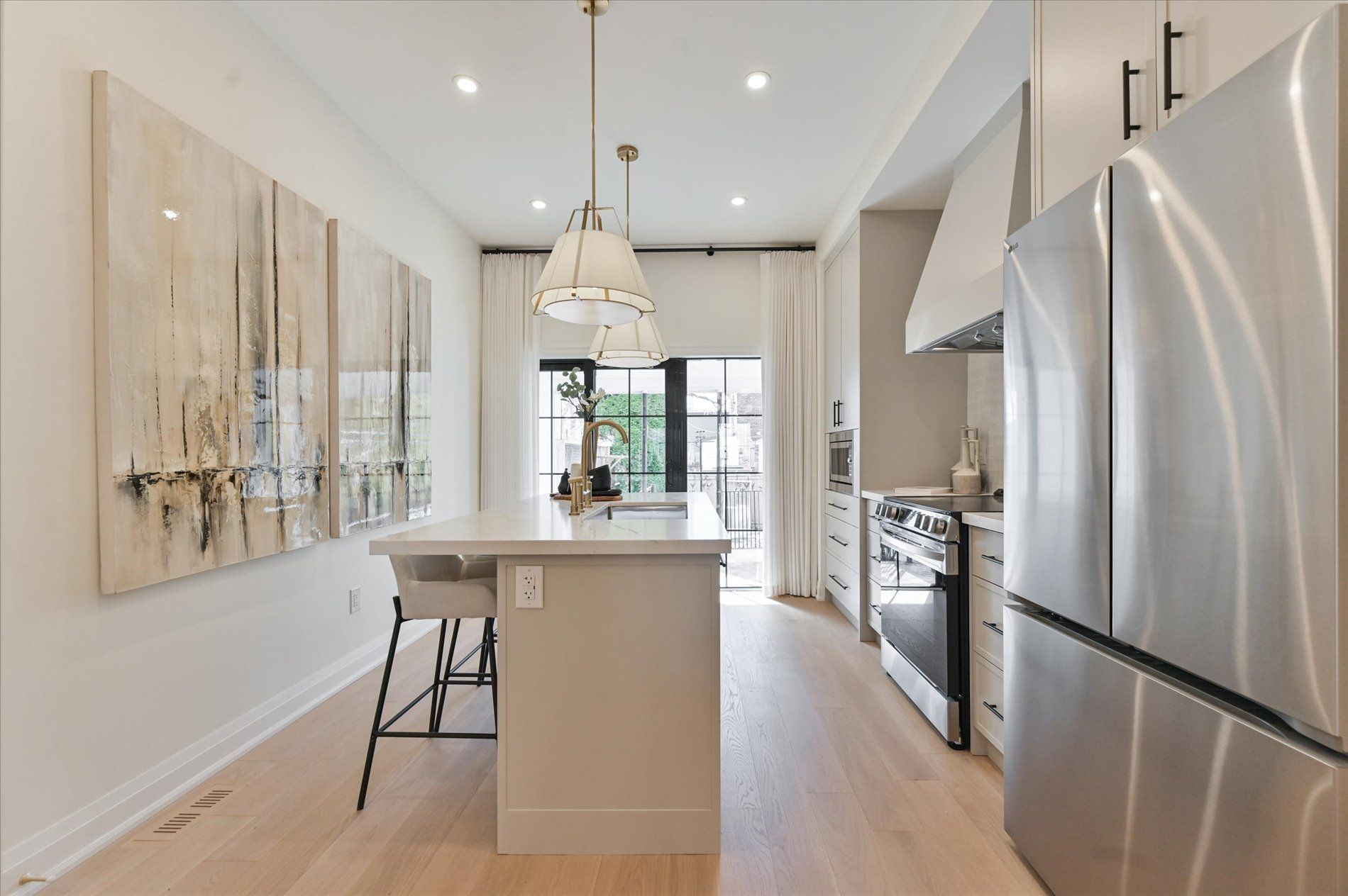 • Sleek chef's kitchen with new cabinetry, stone countertops, and premium appliances.