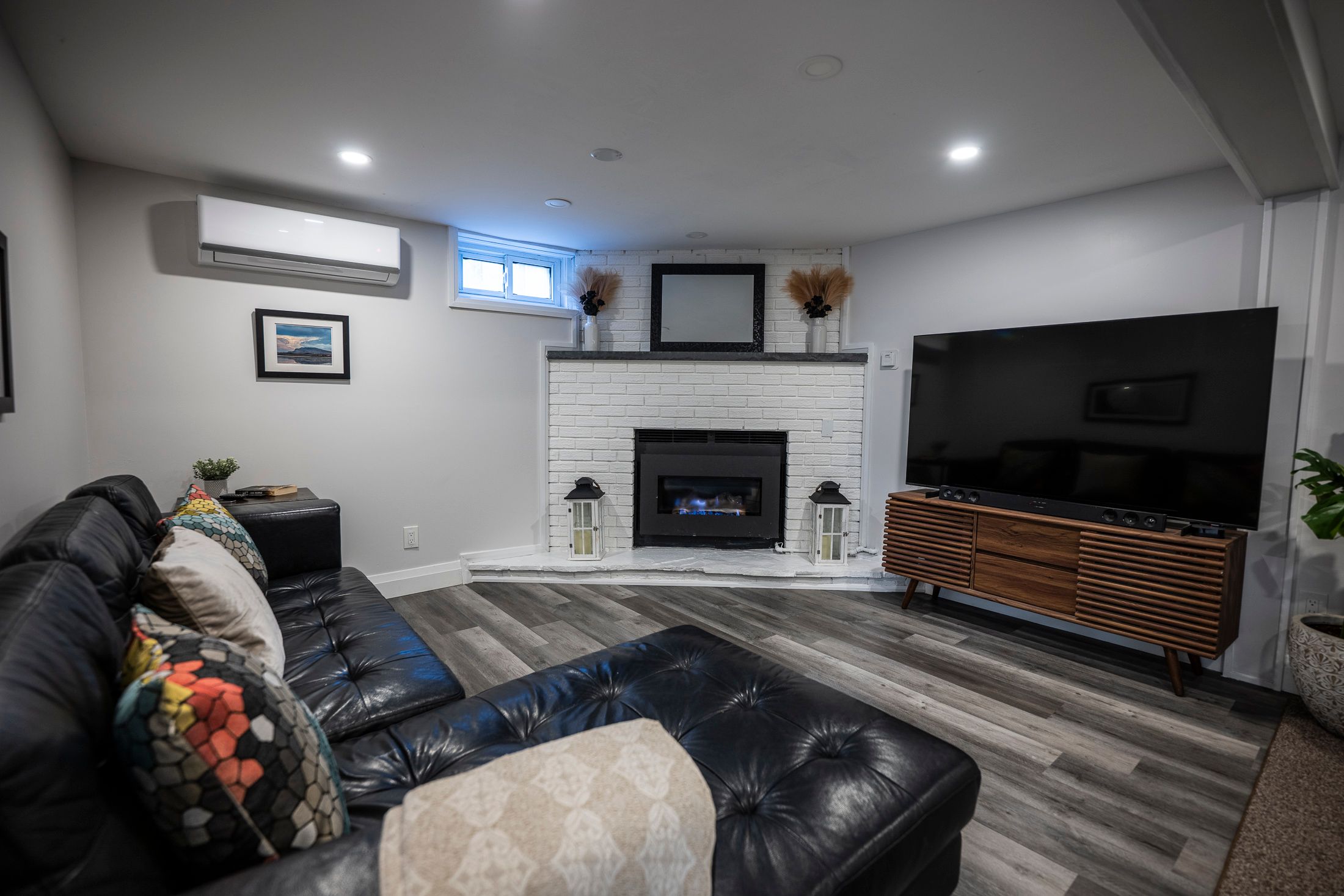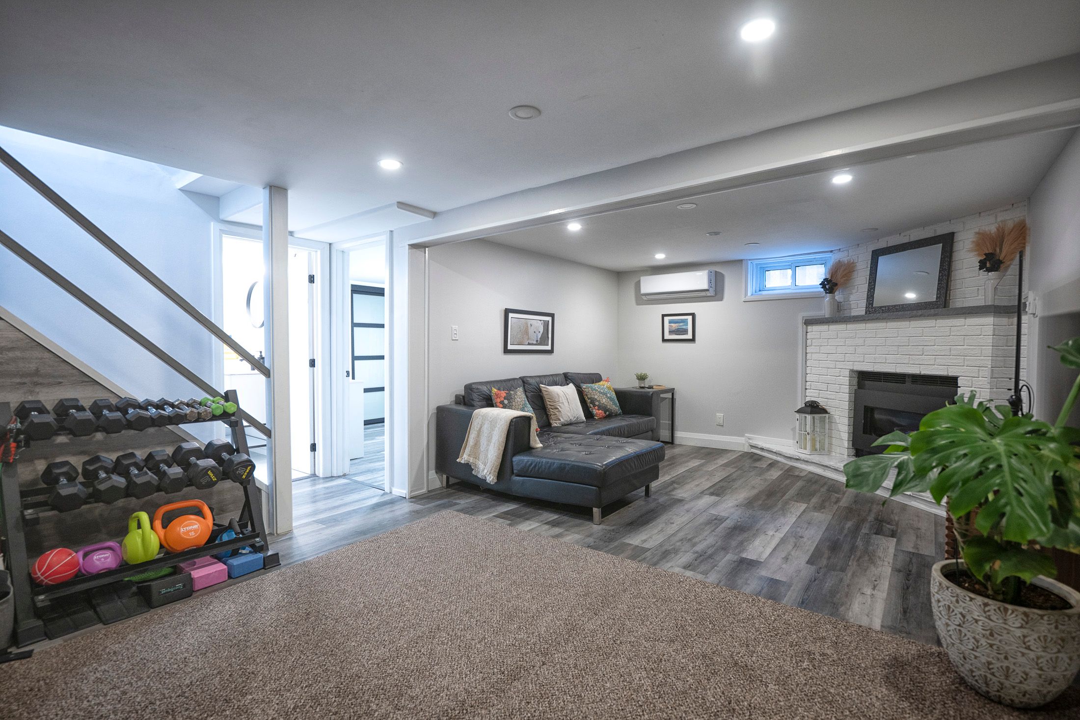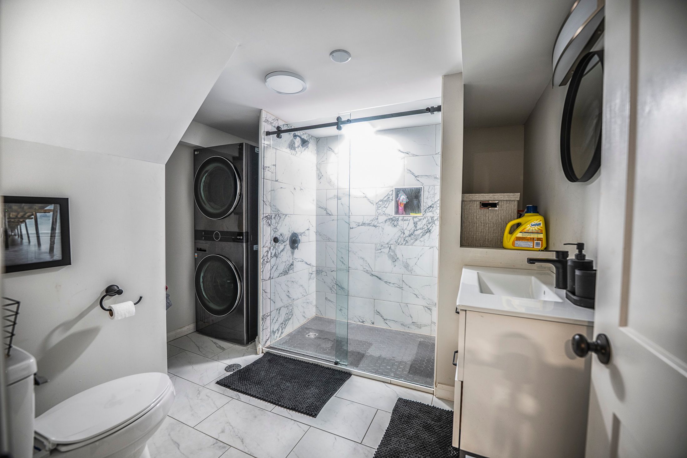 • Fully finished lower level with custom shower, heated floors, and fireplace.