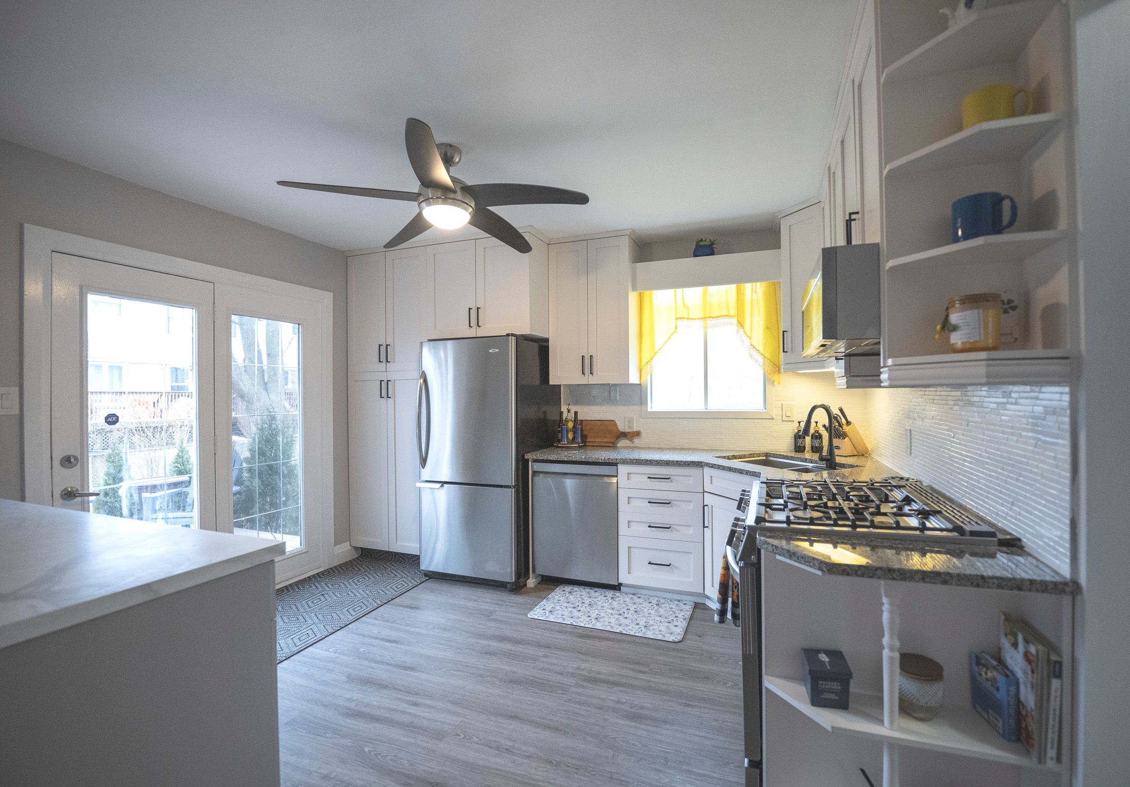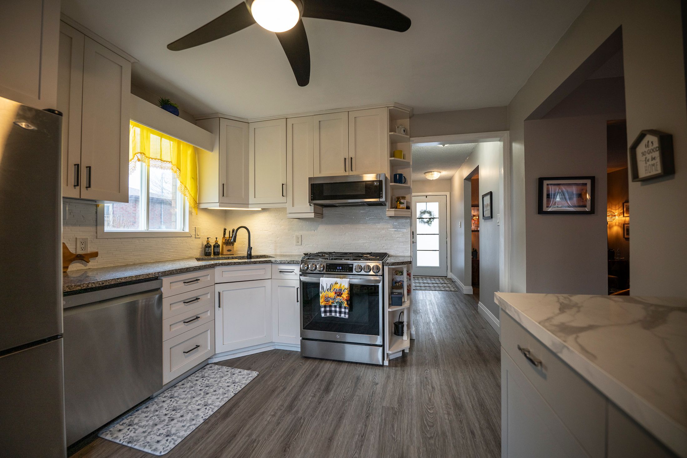 • Updated kitchen with granite countertops and modern appliances included.