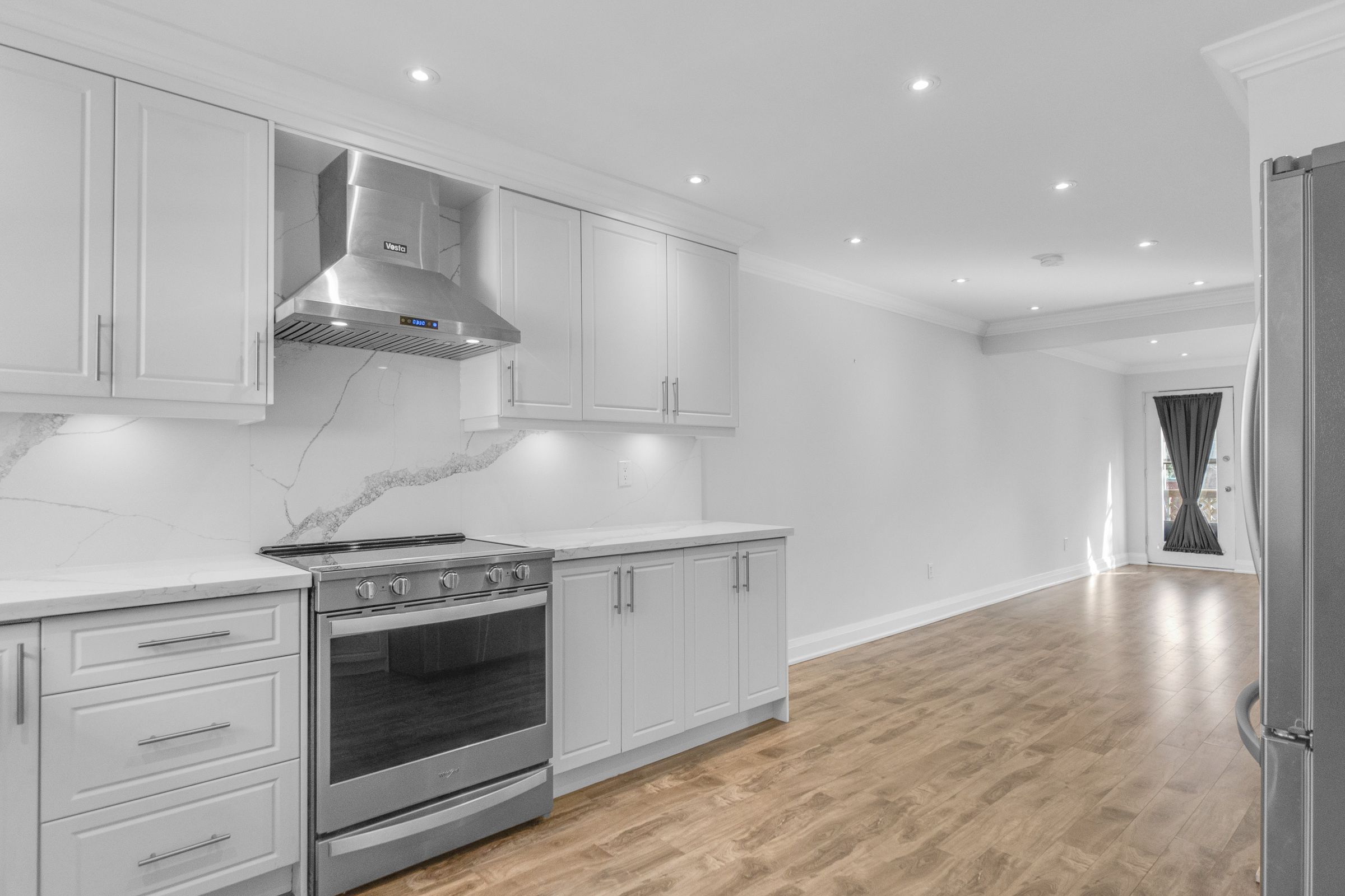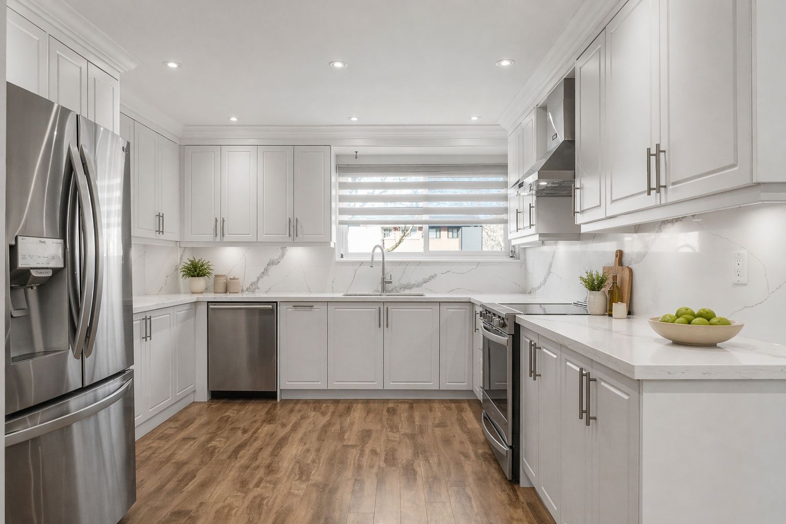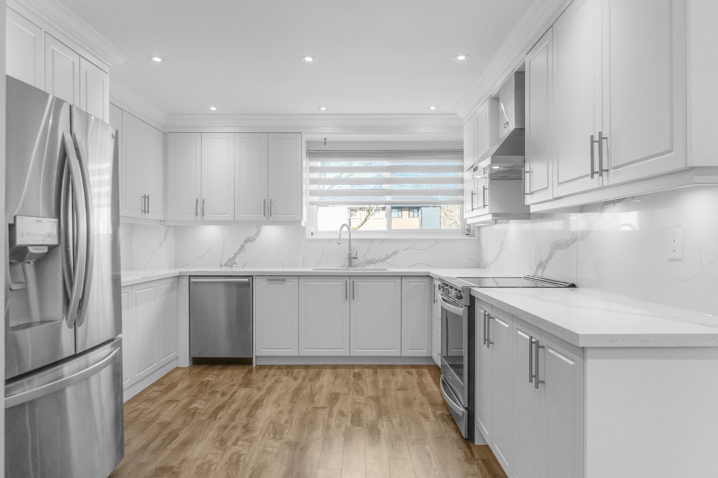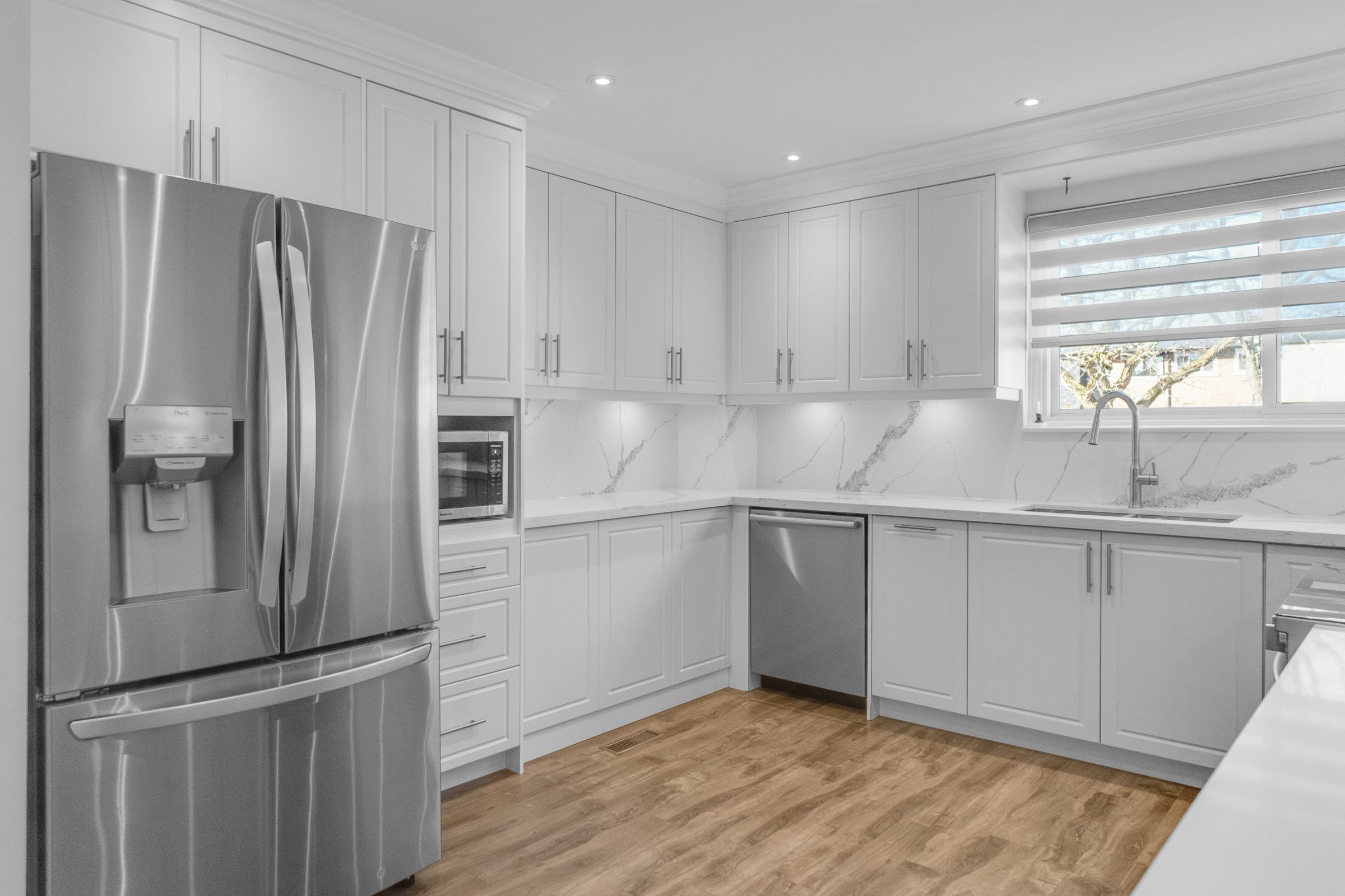 • Bright and spacious layout with a modern white kitchen and granite backsplash.