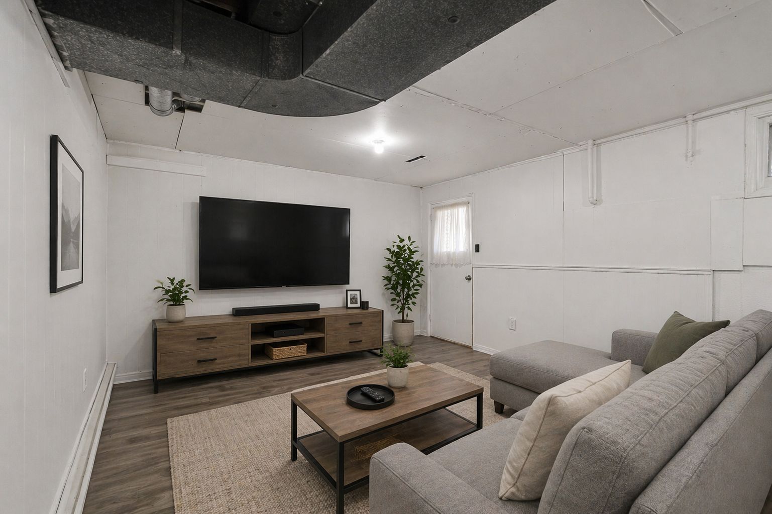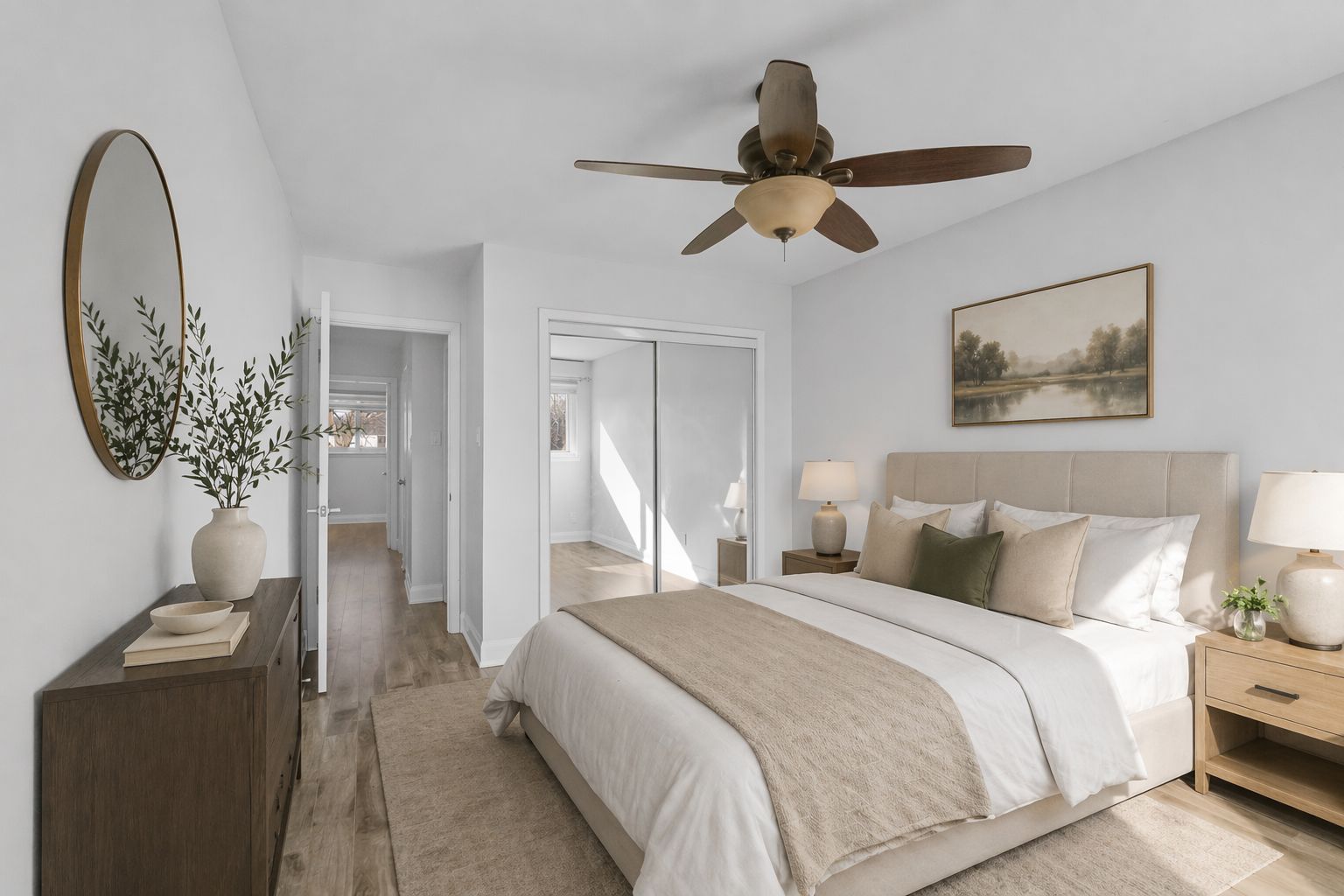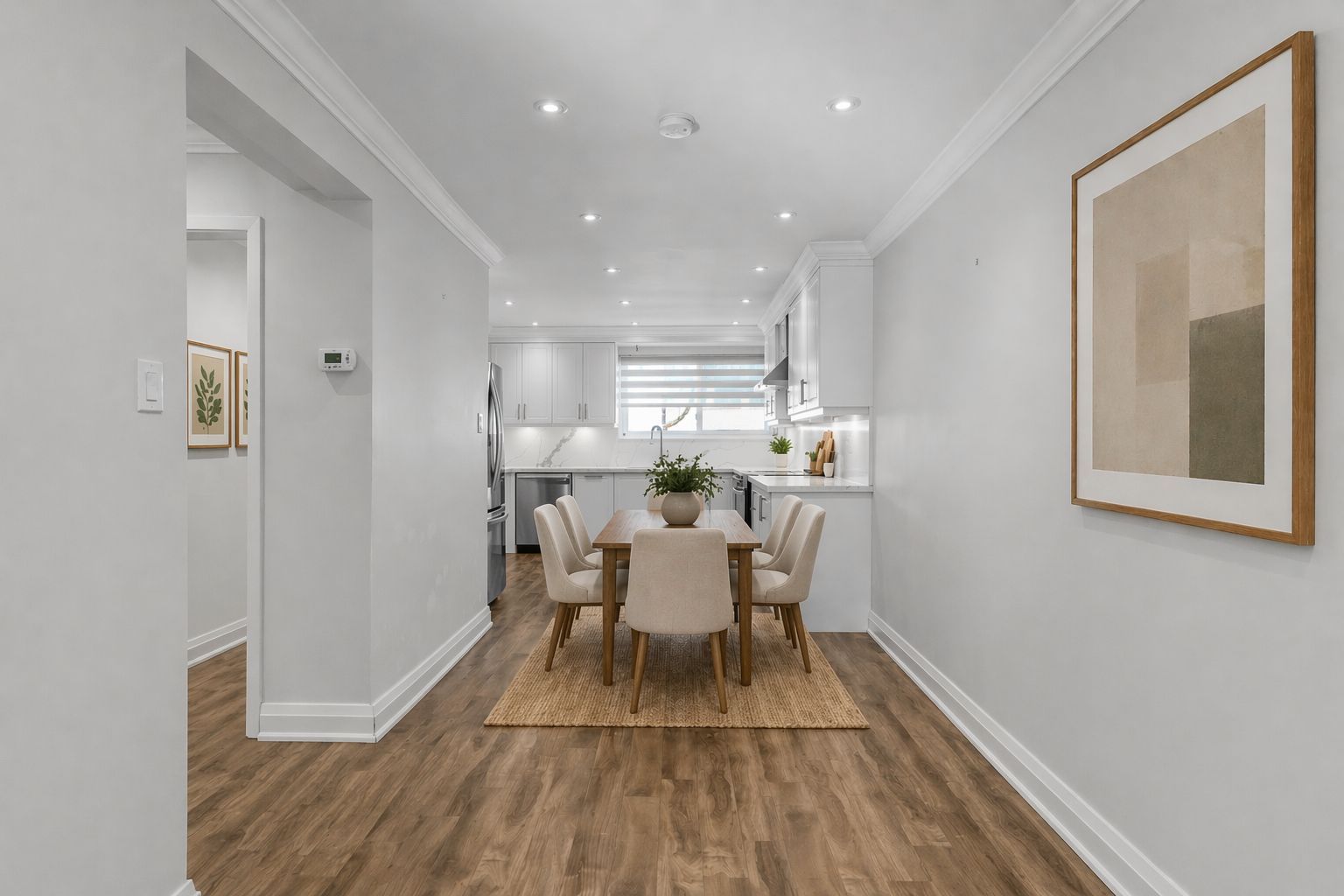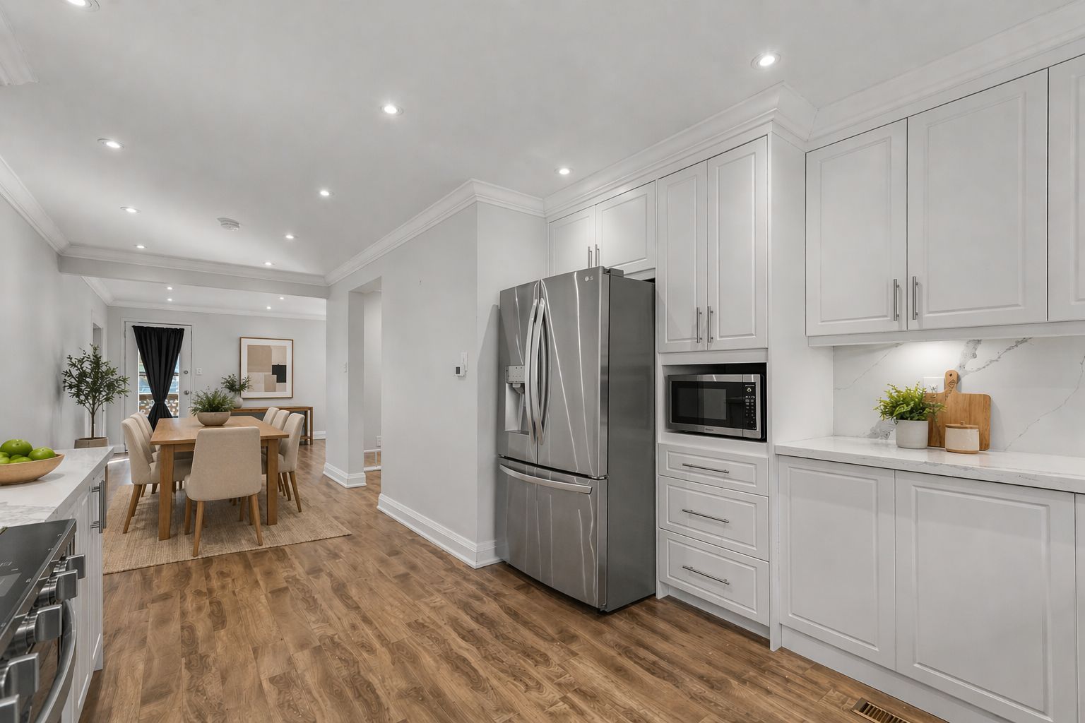 • Bright and spacious layout with a modern white kitchen and granite backsplash.