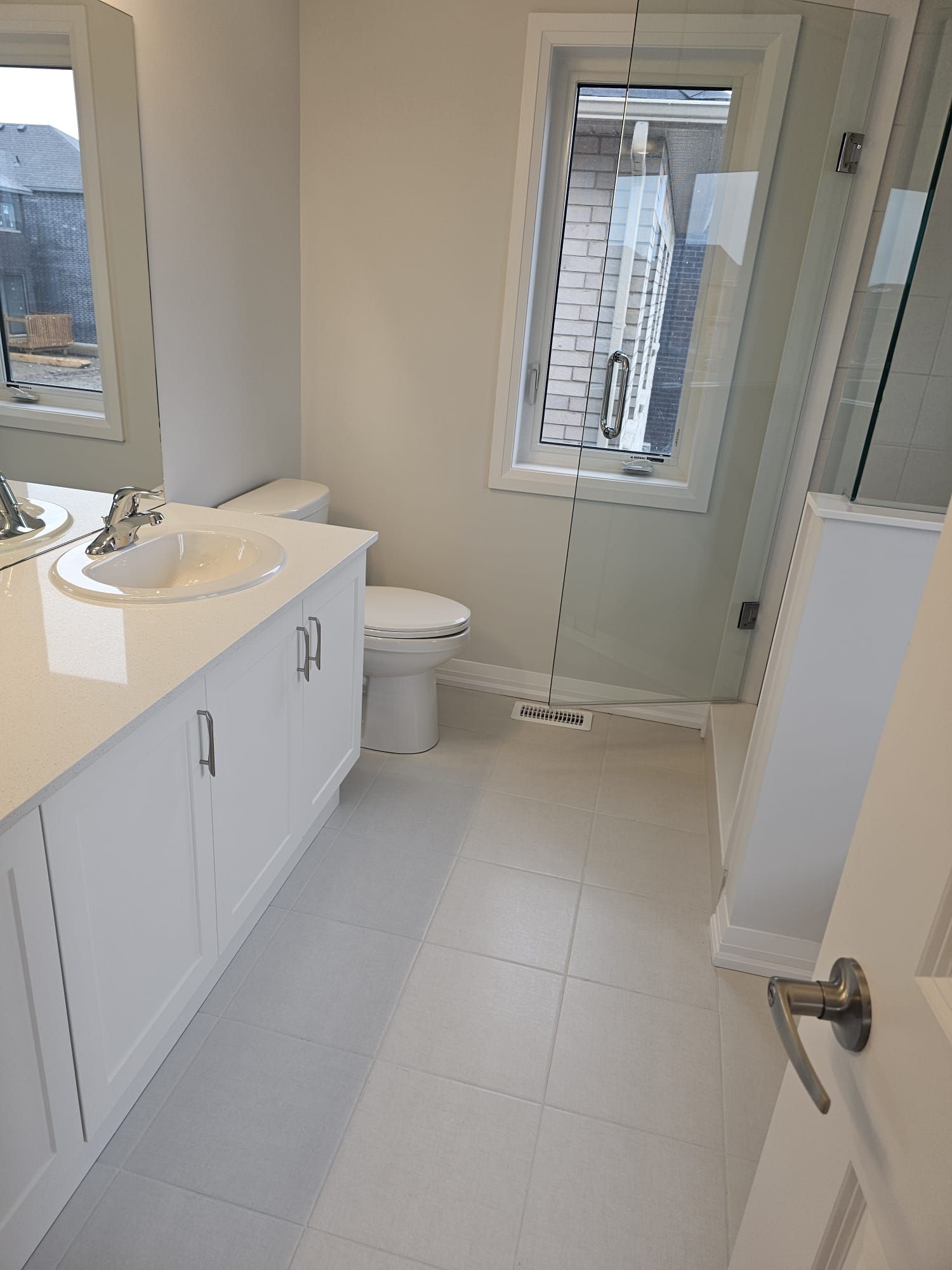• Modern kitchen features an oversized quartz countertop, great for gatherings.