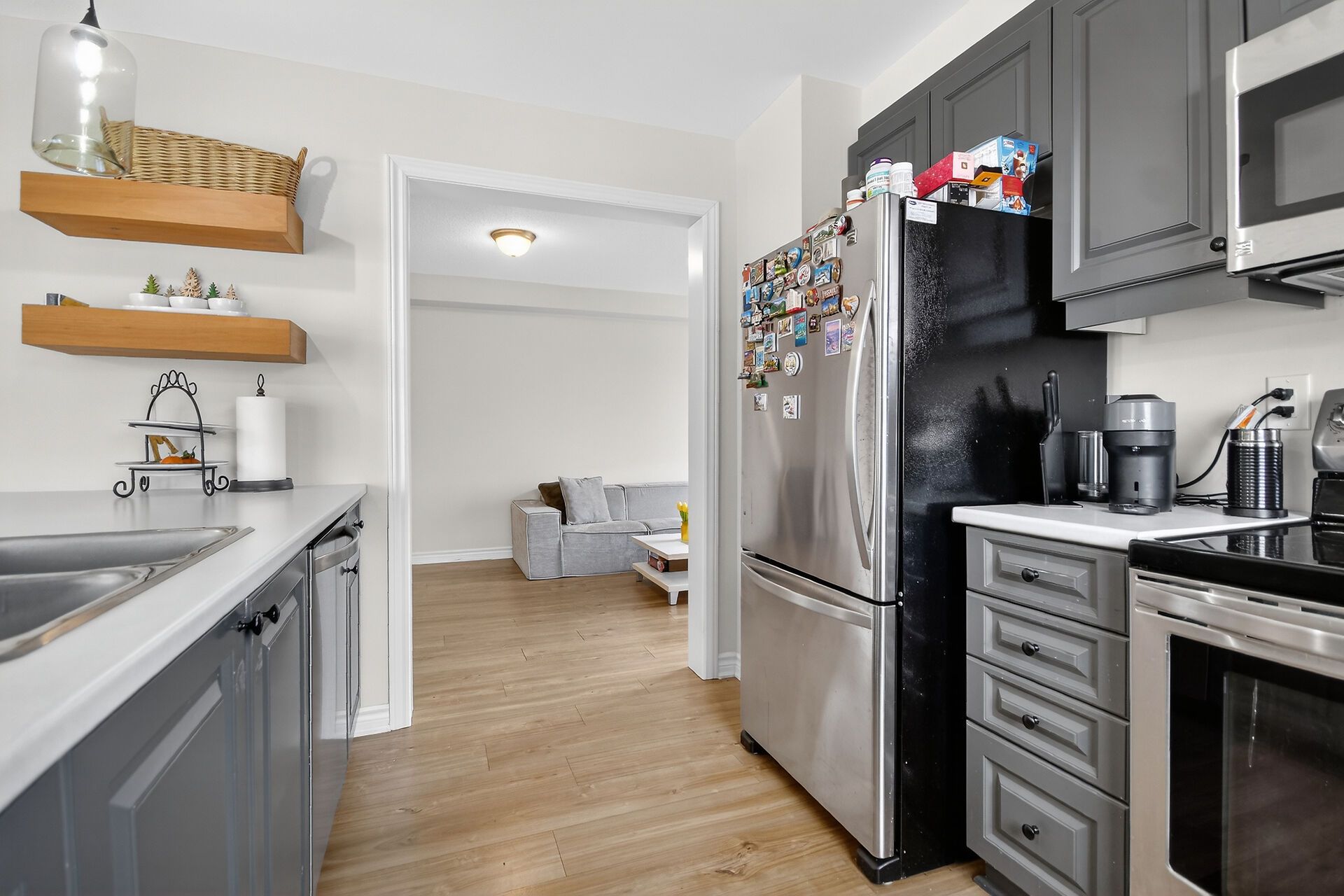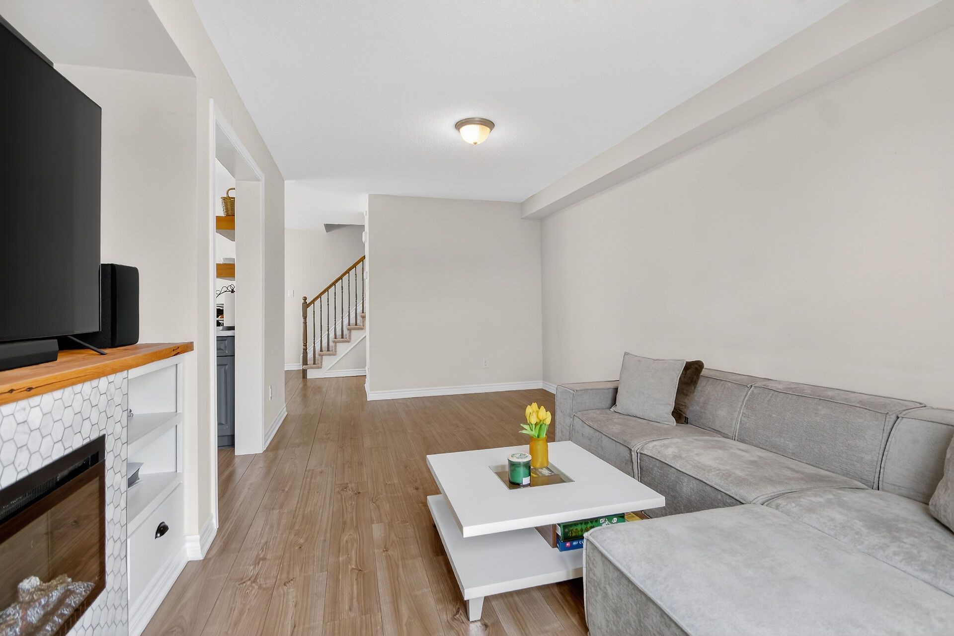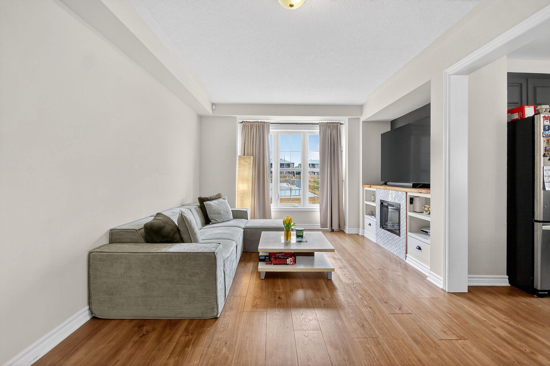 Welcome to this stunning three-storey corner-unit townhome, perfectly positioned facing black haven park with no front neighbours-offering both privacy and scenic views. Flooded with natural sunlight, this unique home delivers comfort and style across every level. The main floor features a conveniently located laundry area and a versatile den, ideal for a home office. On the second level, enjoy an open-concept living and dining area that seamlessly connects to your private deck-perfect for morning coffee or relaxing evenings. The kitchen is thoughtfully designed with ample cabinetry, stainless steel appliances, and a functional breakfast bar. A convenient half bath completes this level. Upstairs, the third floor offers a spacious primary bedroom with a private 3-piece ensuite, along with a generously sized second bedroom and an additional 3-piece bathroom-perfect for family or guests. This bright, well-laid-out home combines modern living with a prime location-an exceptional opportunity you won't want to miss.