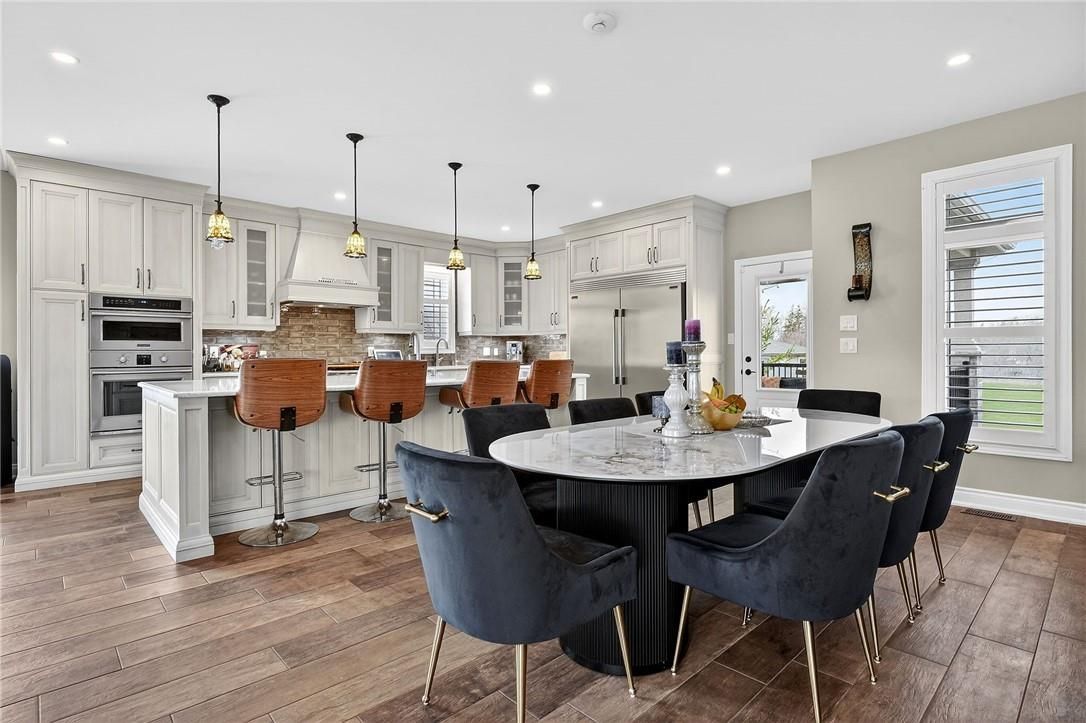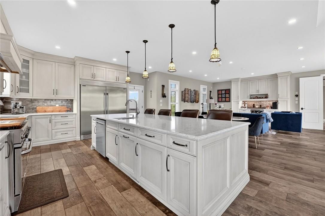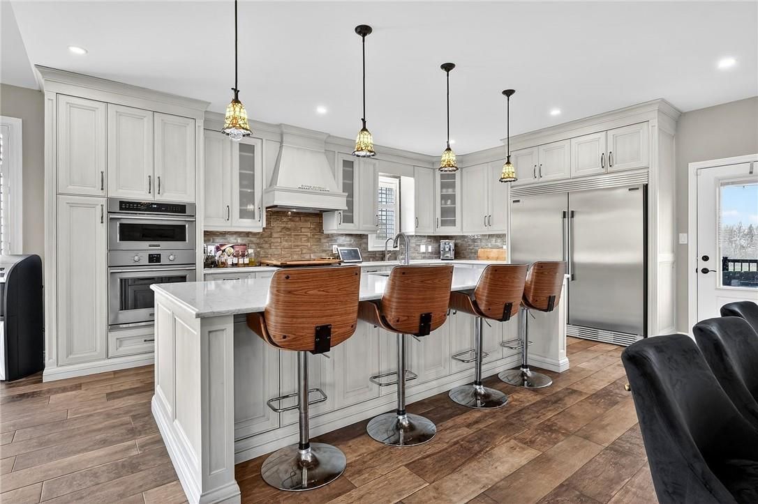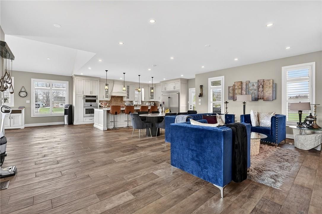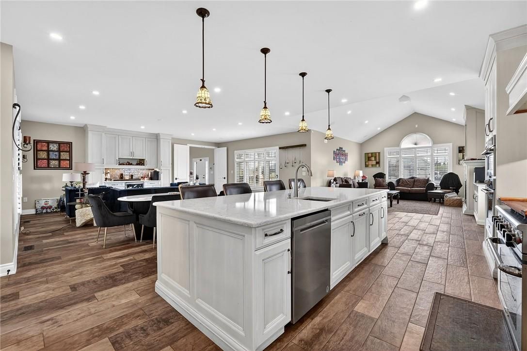 This custom built home commands attention. Set on a spacious 1 acre lot in the community of st. Anns, this stunning 2-storey home delivers over 6,500 sq ft of living space and two in-law suites that are ideal for multi-generational living. This home combines scale, craftsmanship, and a level of interior finish rarely found at any price point in west lincoln. From the moment you step inside, the level of craftsmanship is evident. A grand two-storey foyer features polished tile and a dark hardwood staircase with iron spindles. The main level flows seamlessly between the great room, kitchen, and dining area. The chef's kitchen is a true showpiece: custom soft-grey cabinetry, a large quartz island, professional-grade gas range, double wall oven, and built-in fridge/freezer - with direct walk-out access to a covered outdoor sitting area. Inside or outside, this space was built to entertain. The family room is anchored by a cathedral ceiling, arched transom window, gas fireplace, and built-in media cabinetry. The main floor also features a dedicated home office, den, 3-piece bathroom, laundry room & mud room. The generous primary suite has engineered hardwood floors and a spa-quality ensuite complete with a freestanding soaker tub, frameless glass shower with dual shower heads, a double vanity with dark cabinetry and granite counters. Additional bedrooms are well-sized with engineered hardwood floors and quality finishes. A 5-piece bathroom serves the upper level with a tub and shower combination and double vanity. The finished walk-out basement is home to two completely self-contained in-law suites - each featuring a private kitchen, open-concept living area, bedroom, and full bathroom. The property also includes an attached garage with parking for 3 cars, a large private driveway, a covered front porch, and a shed. Two furnaces service different portions of the home, while one tankless hot water tank services the whole home.