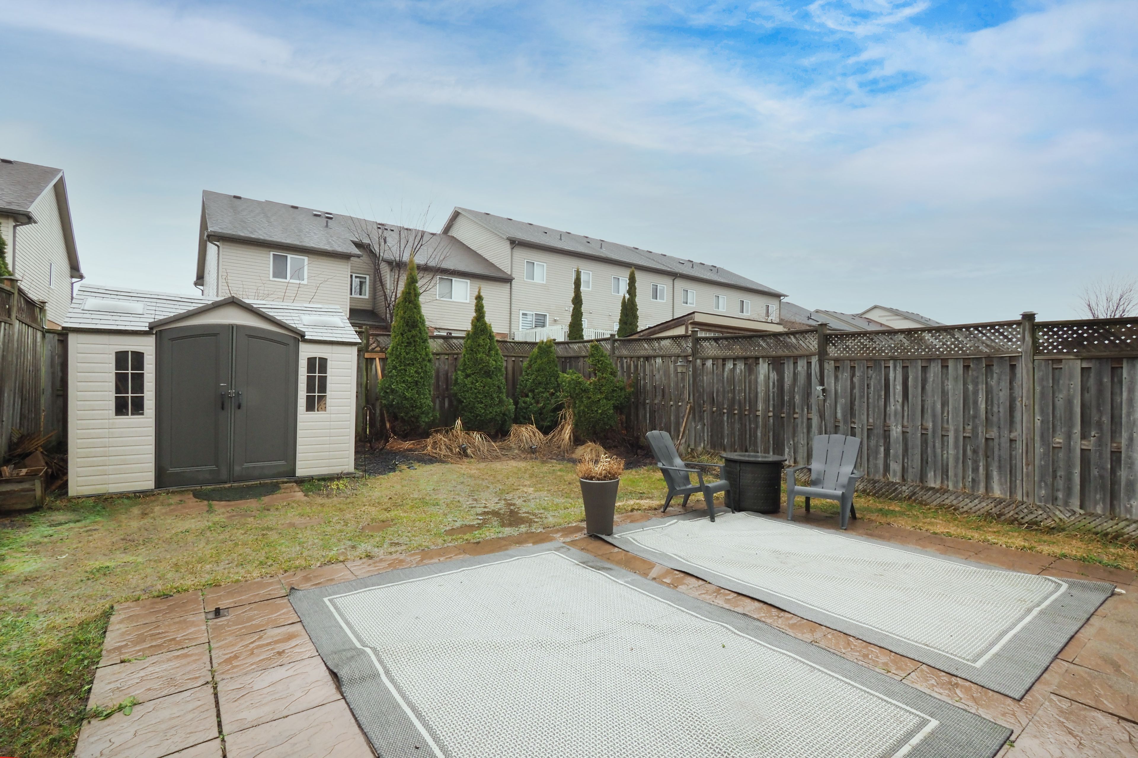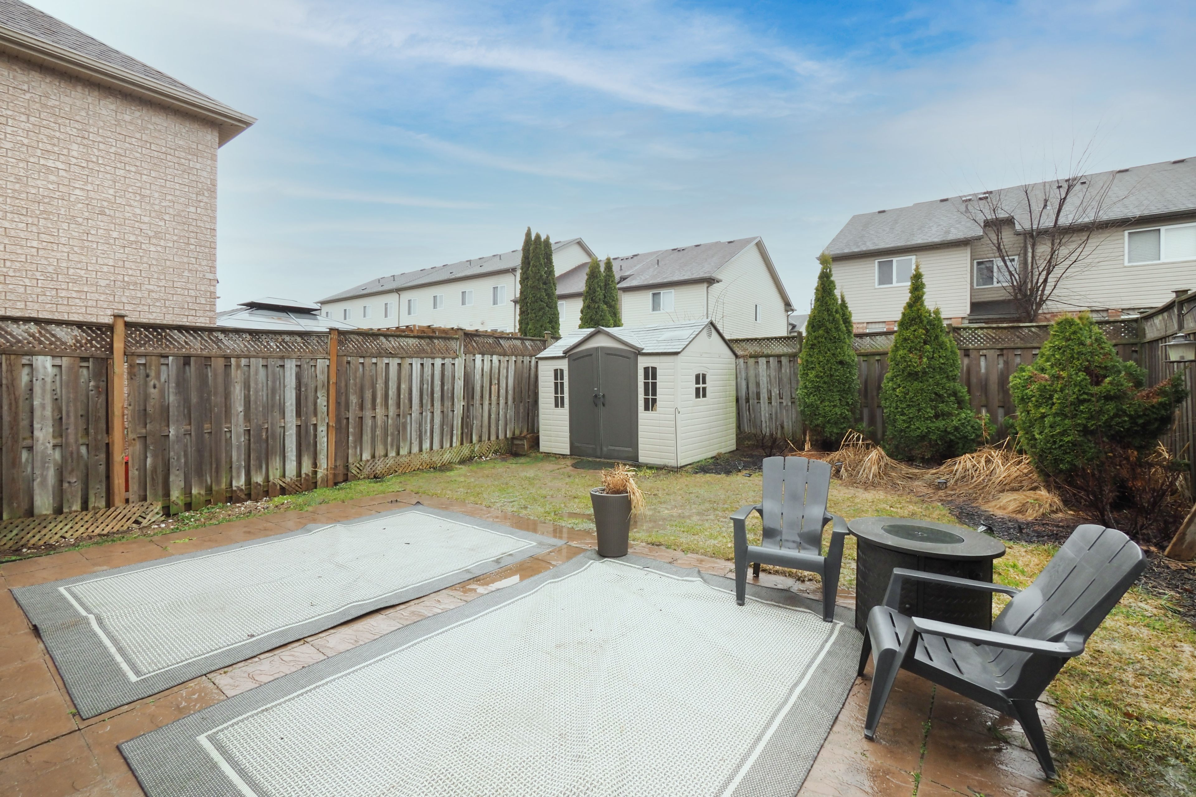 • Fenced backyard oasis with a pave stone patio, trees, and gardens.