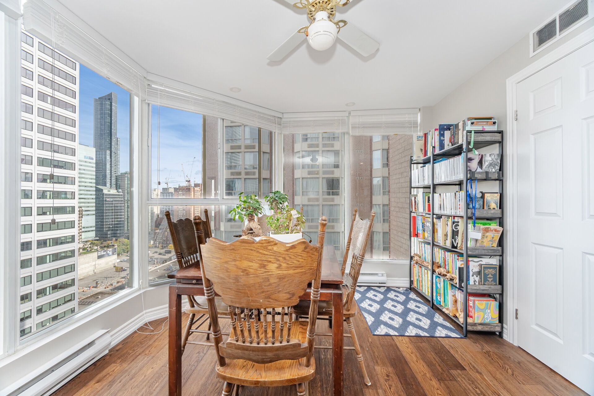 Beautifully renovated and impeccably styled, this oversized one-bedroom plus solarium offers sophisticated urban living in the heart of downtown. The open-concept living and dining area flows effortlessly into the bright solarium, featuring floor-to-ceiling windows and rich hardwood floors-perfect for a home office, reading nook or 2nd bedroom. The custom-designed modern kitchen impresses with quartz countertops, full-size stainless steel appliances, a built-in microwave, and abundant cabinetry and workspace. The spacious primary bedroom includes a walk-in closet with custom organizers and a striking bay window framed by floor-to-ceiling glass and hardwood flooring. The sleek, updated bathroom features a walk-in tiled shower with a built-in bench and a custom mirrored vanity. With all-inclusive maintenance fees (excluding hydro), this suite is the perfect blend of comfort and convenience. Ideally situated at university and dundas, you're steps to public transportation, the eaton centre, hospital row, u of t, toronto metropolitan university, and an array of shops, cafes, and restaurants-everything downtown living has to offer.