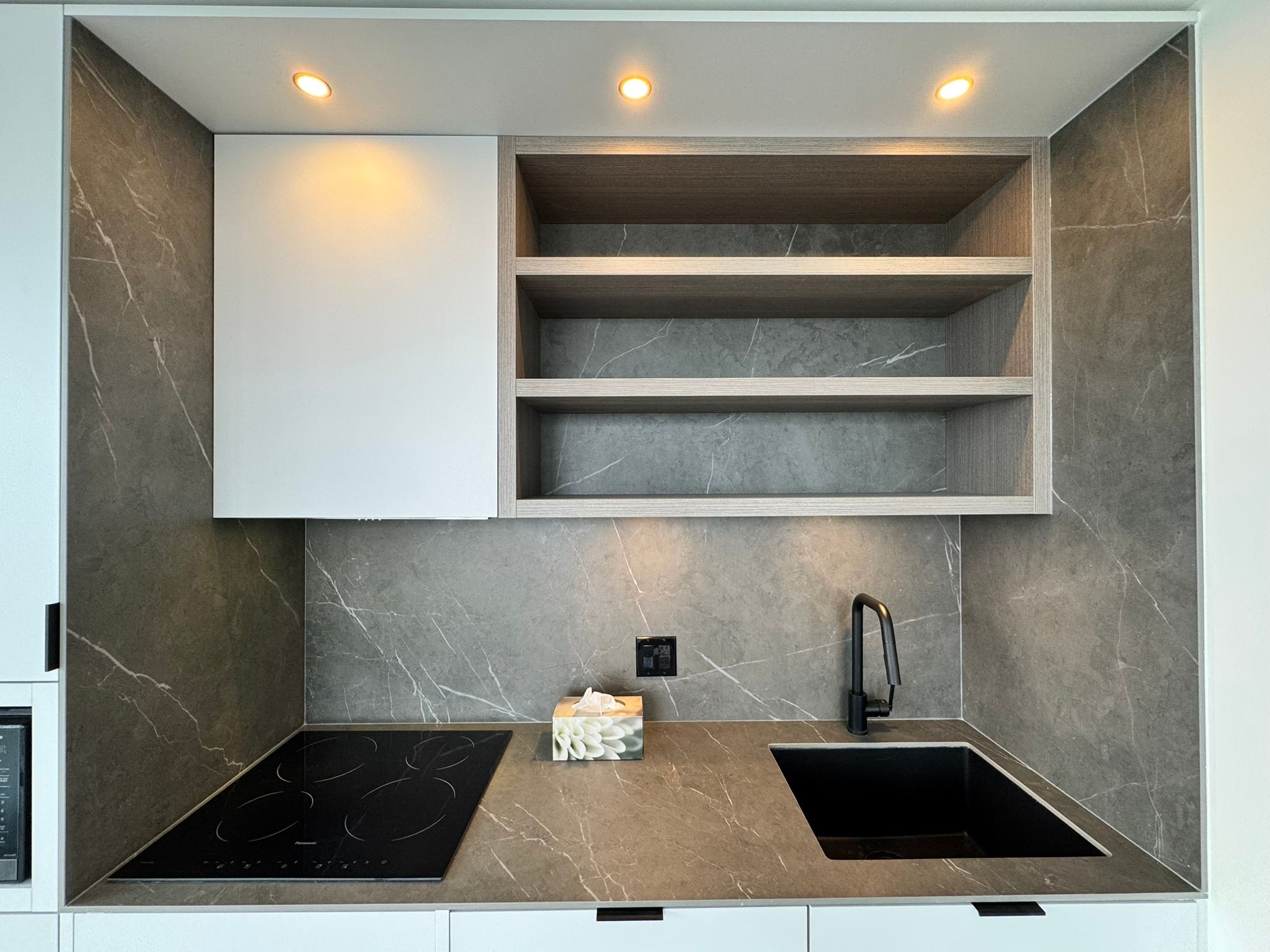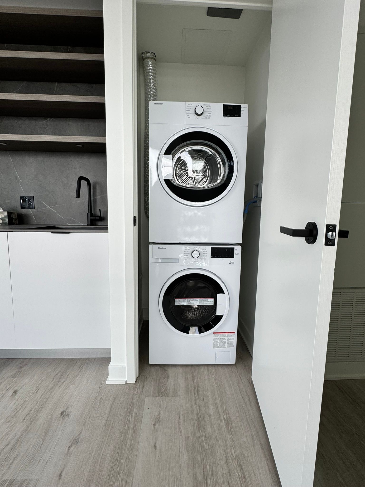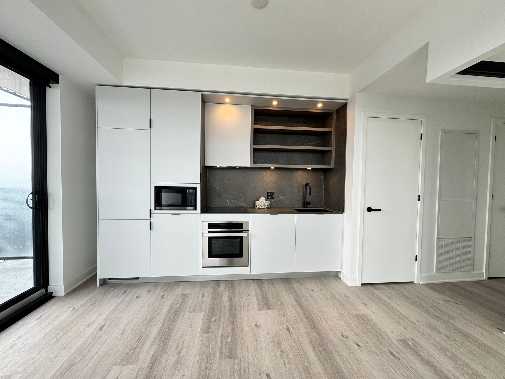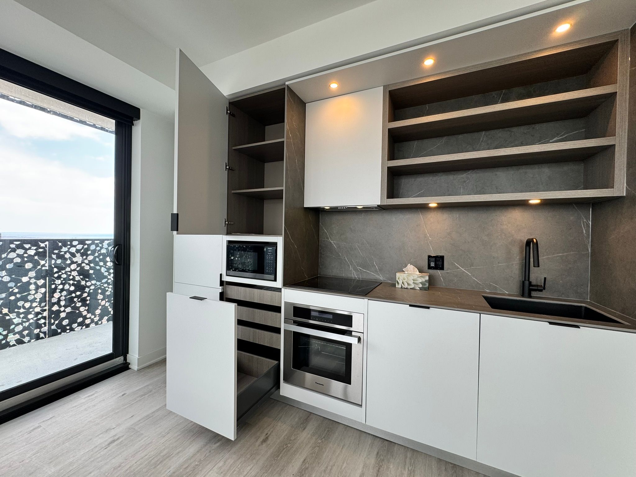 • Modern kitchen features built-in appliances and sleek finishes.