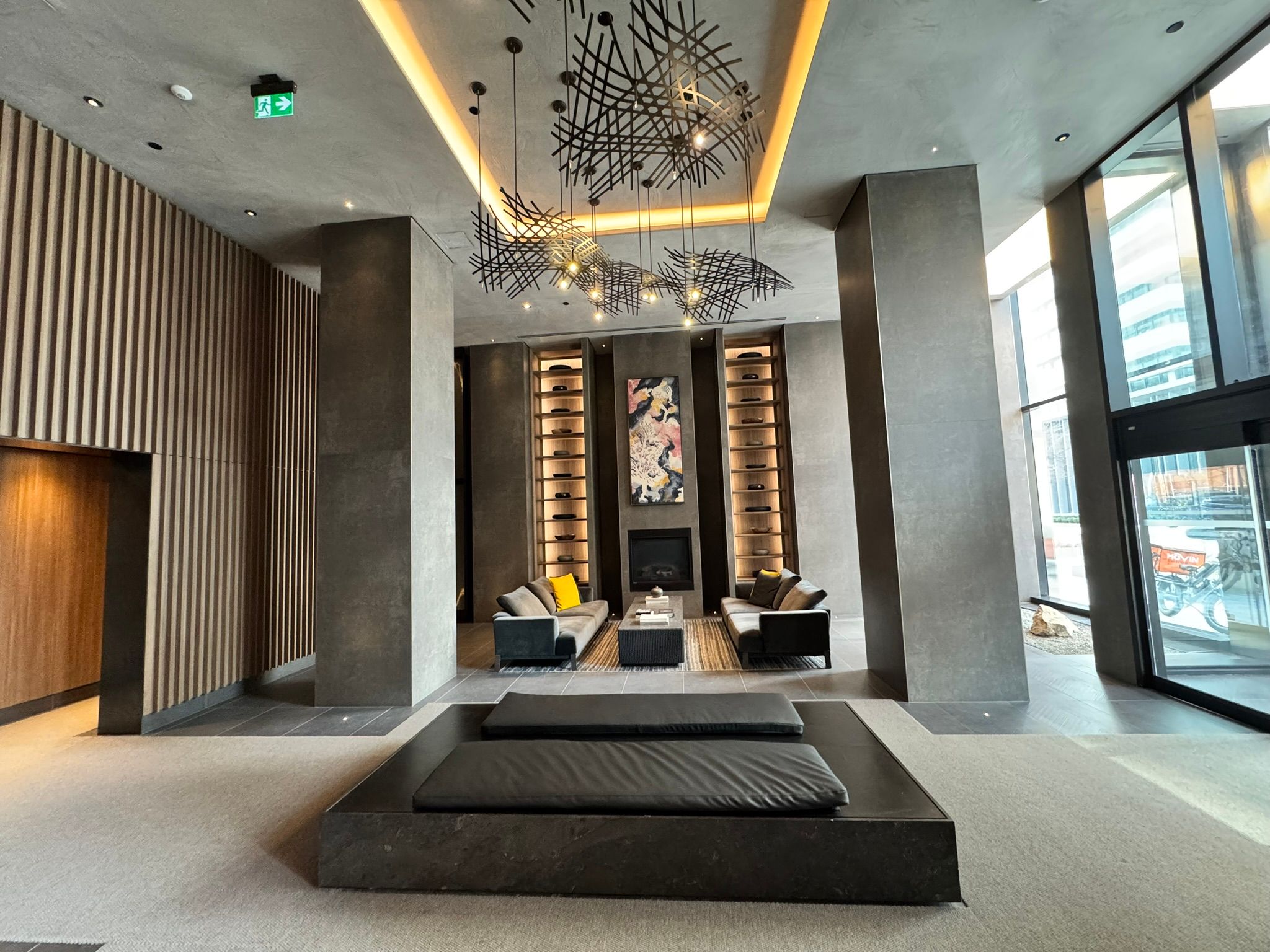 • Amenities include fitness studio, co-work spaces, and outdoor lounge.