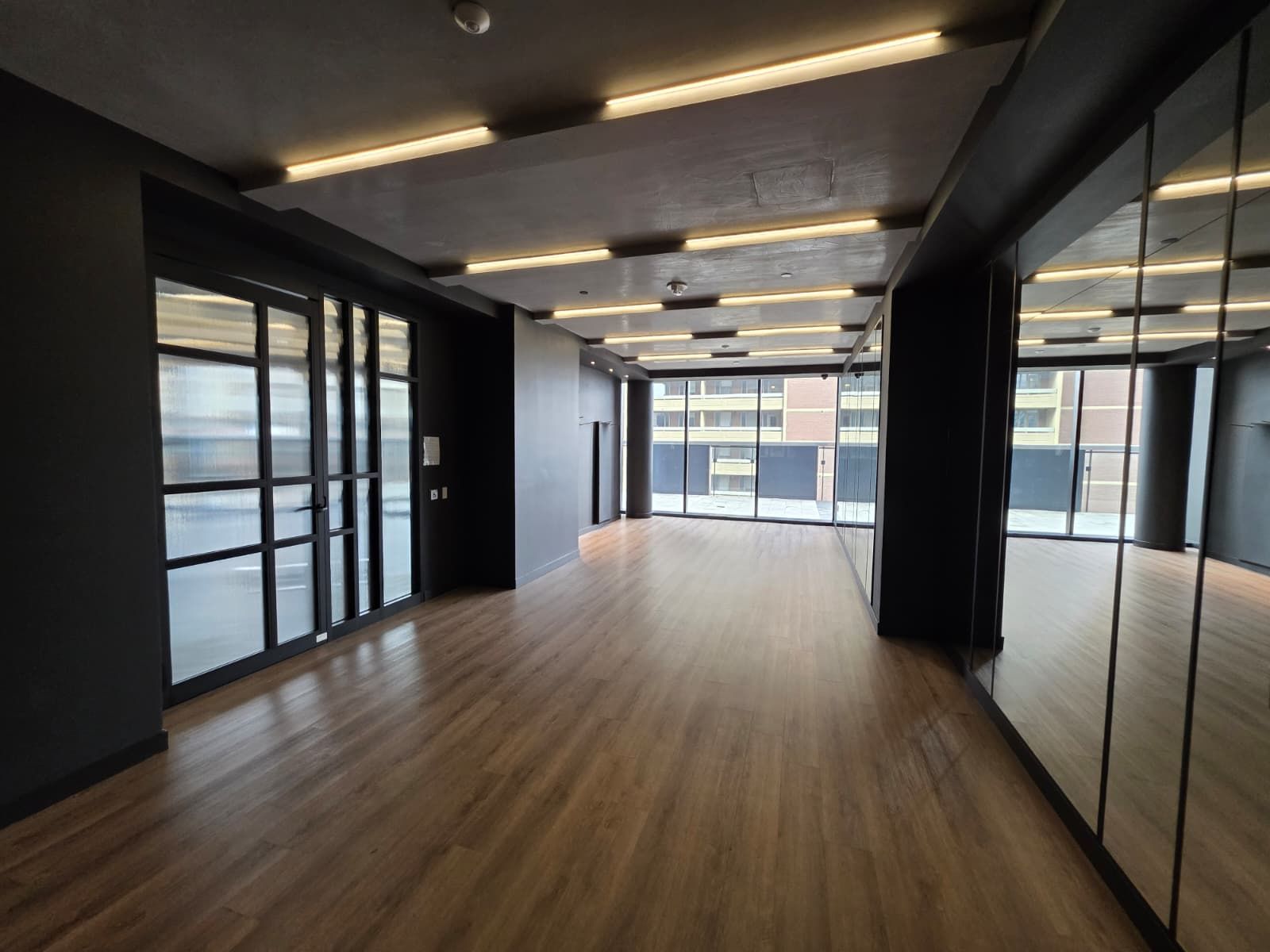 • Bright space with floor-to-ceiling windows and a private balcony.