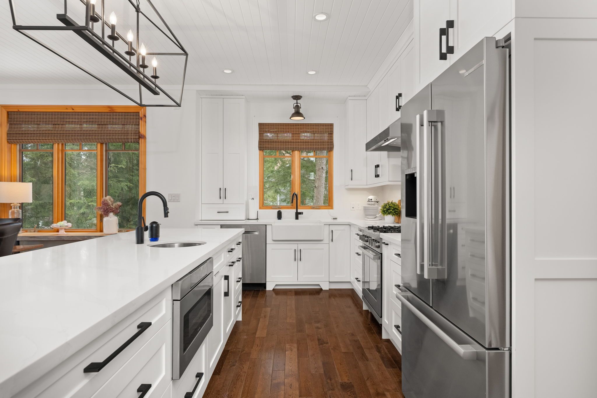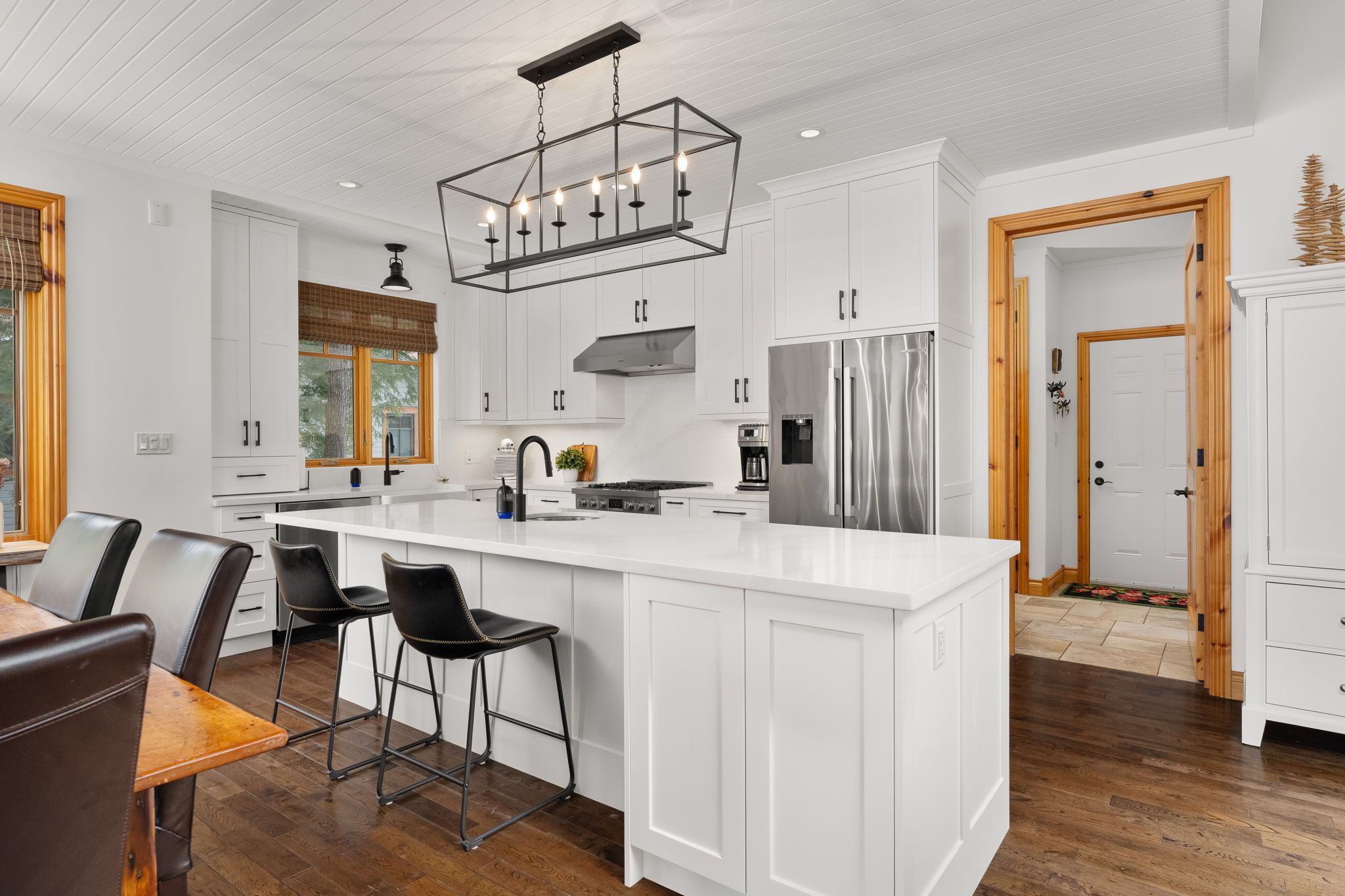 • Open-concept main floor with a modern kitchen and gas fireplace.