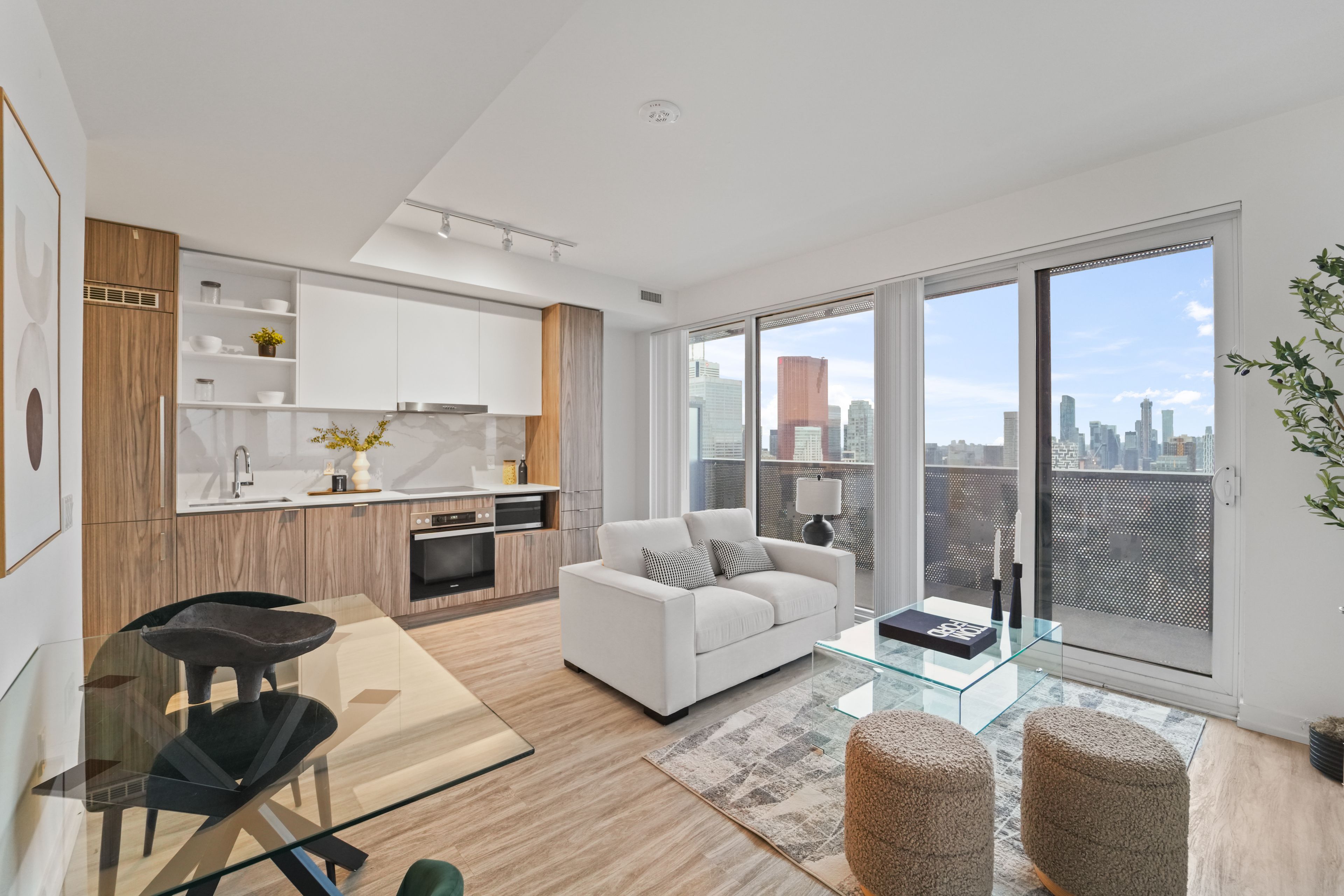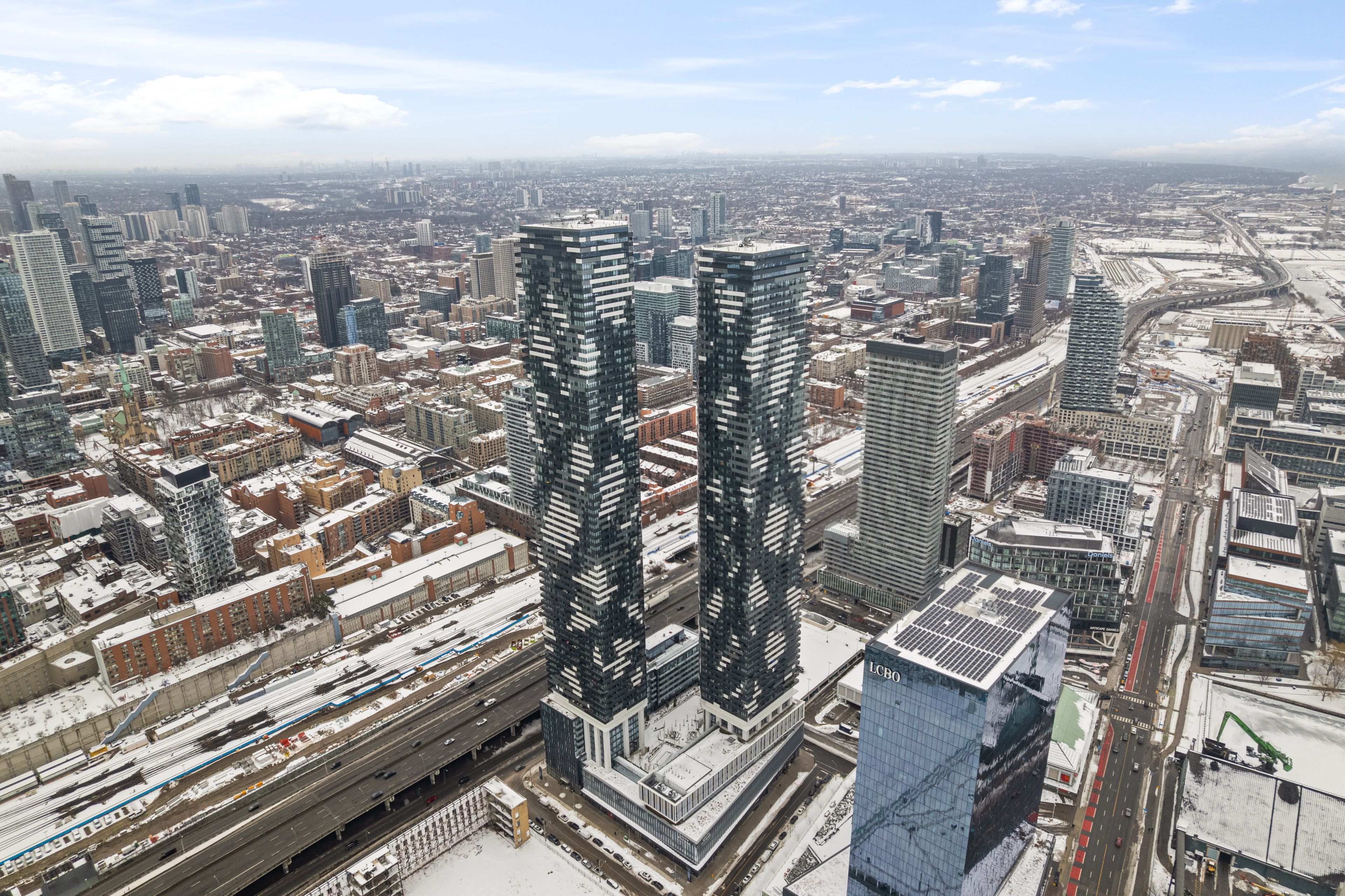Welcome to 55 cooper street #6005, situated in toronto's vibrant waterfront community at sugar wharf condominiums. Perched high above the city, this exquisite 2-bedroom, 2-bathroom suite invites you to wake up and unwind with the skyline, taking in panoramic views from your expansive wrap-around balcony. Inside, 9' smooth ceilings and floor-to-ceiling energy-efficient windows flood the open-concept living space with natural light, while wide-plank laminate flooring flows seamlessly throughout. The delightful kitchen is a masterclass in modern luxury, featuring custom-designed cabinetry with pantry storage, engineered quartz countertops, a porcelain slab backsplash, and a premium appliance package with miele appliances. Thoughtful details such as deeper closets, and individually controlled heating and cooling elevate comfort to a new level. Beyond your suite, sugar wharf delivers a lifestyle unlike anywhere else in the city. A grand two-storey lobby with 24-hour concierge welcomes residents, who enjoy wifi-enabled amenity spaces, a state-of-the-art fitness centre with aerobics studio, spinning room and basketball court, an indoor lap pool, co-working and meeting rooms, a party room with bar and formal dining area, theatre rooms, games lounge, hobby/art studio, music room, indoor hammock lounge, children's play spaces, and two hotel-style guest suites. The expansive landscaped terrace featuring bbqs and dining areas is perfect for warm summer evenings. Step outside and experience the very best of toronto's waterfront. Walk to the iconic st. Lawrence market, dine at miku toronto, enjoy a game or concert at scotiabank arena; home to the toronto raptors and toronto maple leafs, and commute effortlessly via union station. With farm boy at your doorstep and the waterfront trails, sugar beach, and harbourfront centre moments away, this your chance to secure a space in one of the city's most dynamic and transformative neighbourhoods.