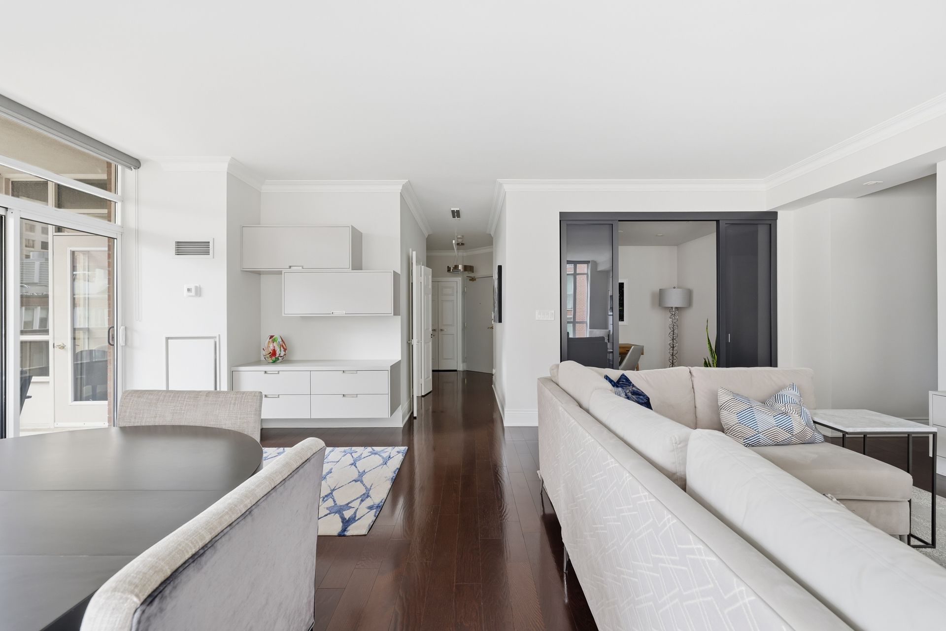 • Open-concept living area with high ceilings and hardwood floors.