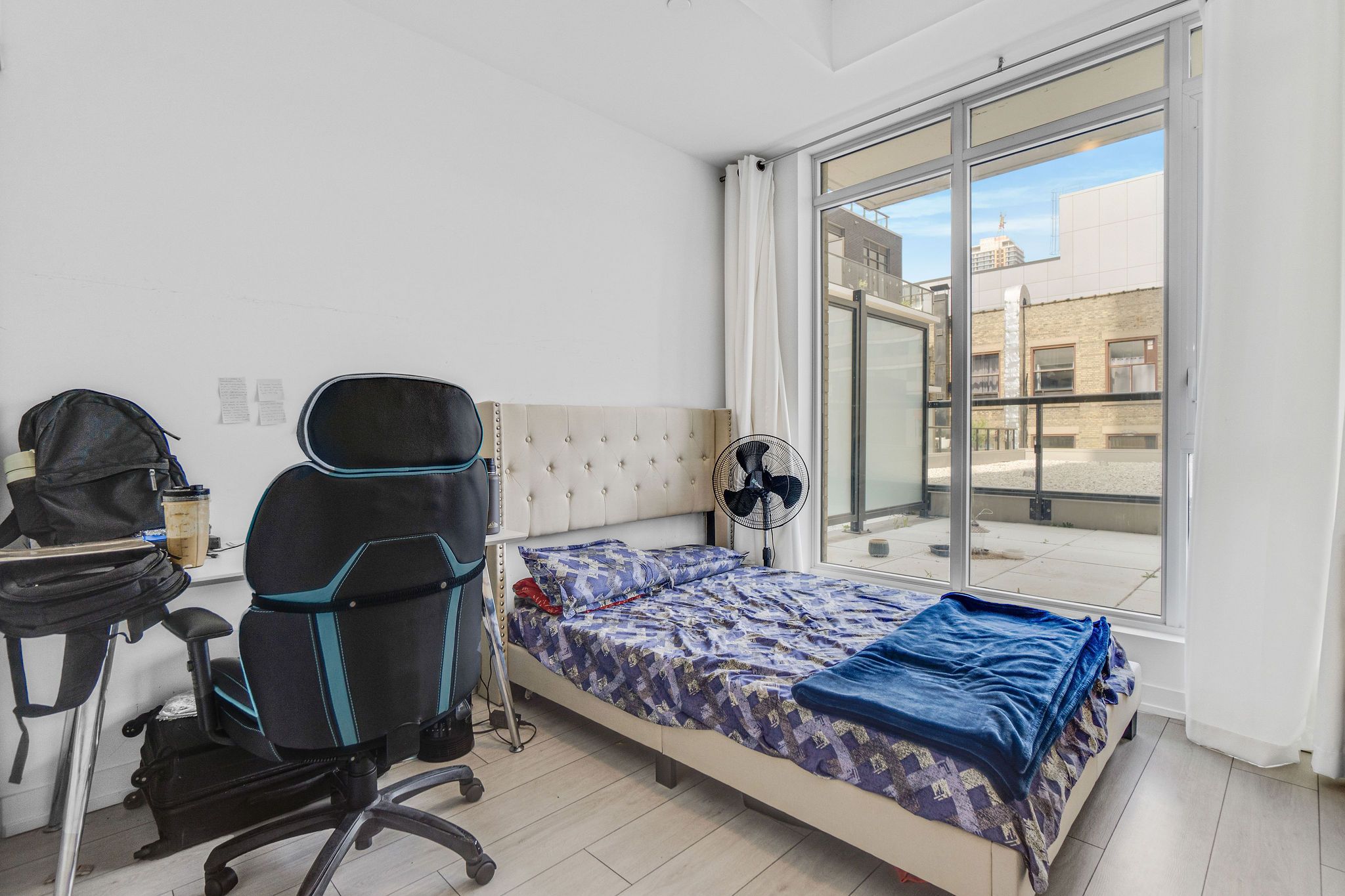Welcome to this bright and spacious unit at young condos. Boasting 730sqft interior unit + 209 sqft terrace, this unit combines style, comfort and urban convenience. The open-concept layout features a modern kitchen with stainless steel appliances, breakfast island, and ample cabinetry. The kitchen seamlessly flows into the den and living area offering panoramic city views perfect for relaxing or entertaining. The cozy primary bedroom includes a generous closet, while the versatile den offers extra space for a home office or guest area. Enjoy exceptional building amenities, including a fully-equipped fitness center, bike studio, rooftop walking track with stunning views, party room, and outdoor bbq area. This unit also includes underground parking and a bike locker for your convenience. Situated just steps from the lrt, public transit, restaurants, shops, google, city hall, universities, and more everything you need is right at your doorstep. Urban living doesn't get better than this! Ideal property for investors, tenant paying $1900 willing to stay or move out with 60 days notice.