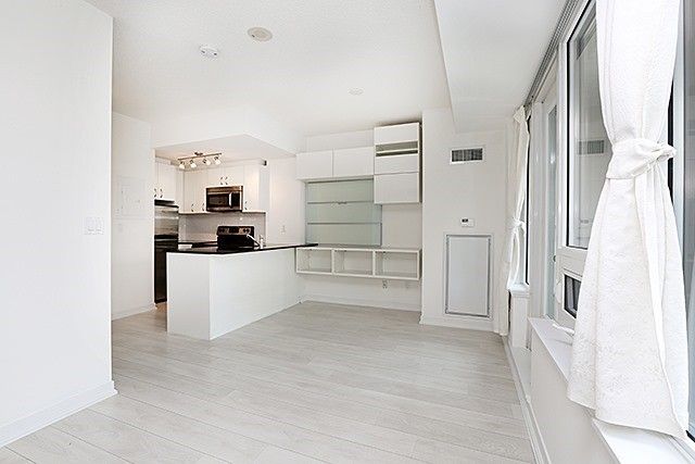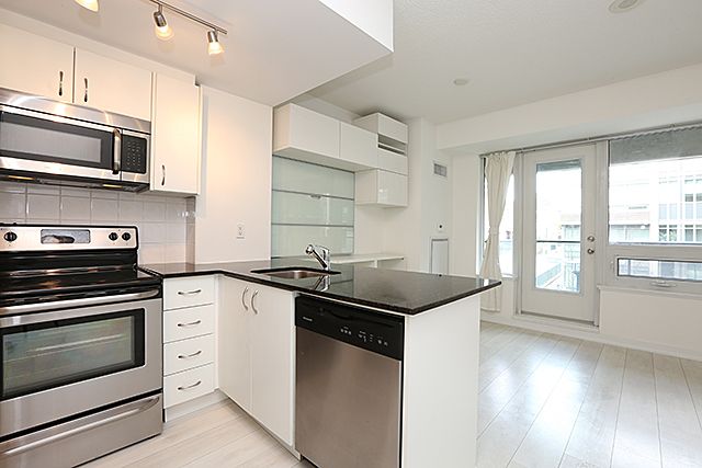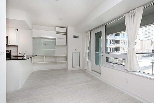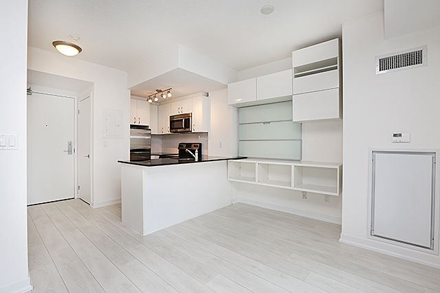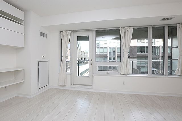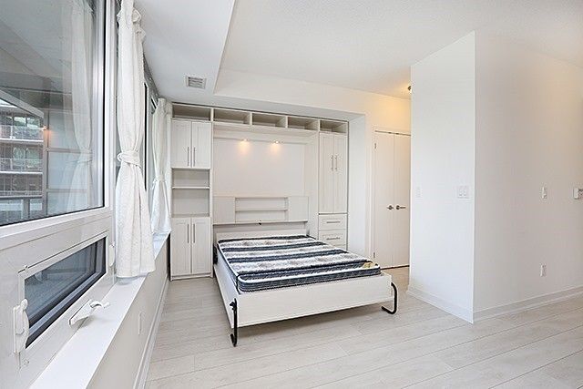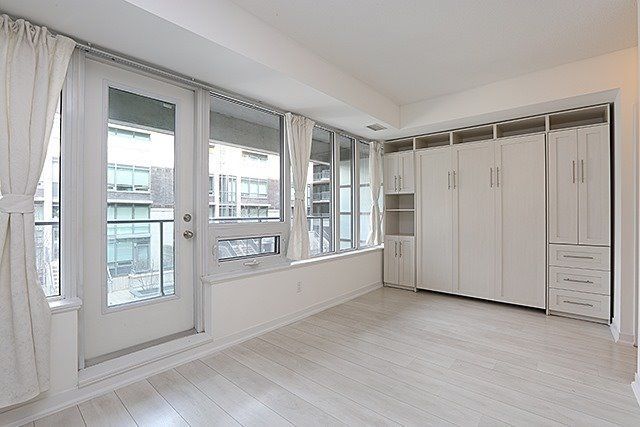 Absolutely gorgeous & stylish. Bright & sunny large studio with built-in murphy bed and extra cabinets. Perfect layout with soaring 9' ceilings. Private end unit. Panoramic floor to ceiling windows span across entire unit. Huge raised private balcony overlooking quiet landscaped courtyard. Beautiful engineered hardwood floors and kitchen island perfect for entertaining. Locker included. Tenant pays own hydro. Note: photos are from previous listing when unit was vacant.