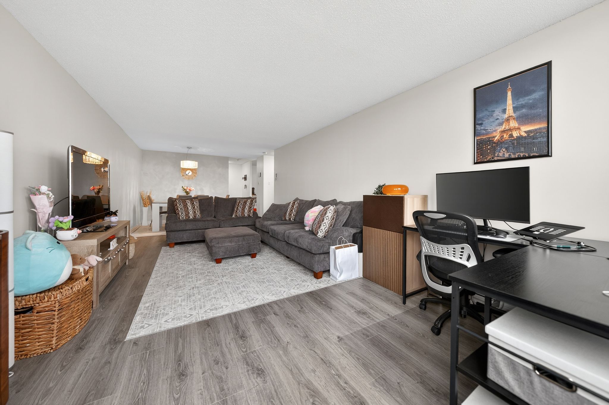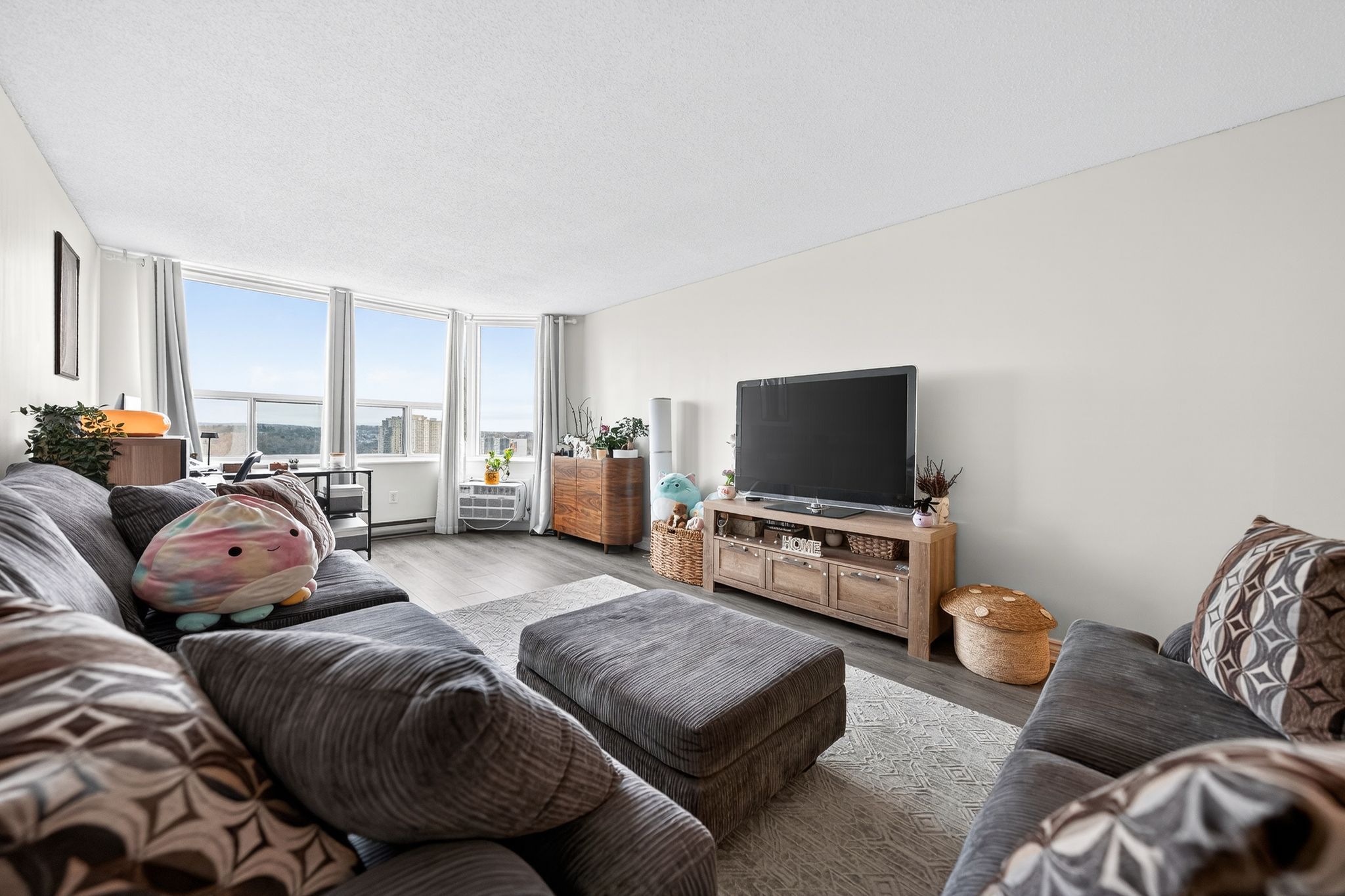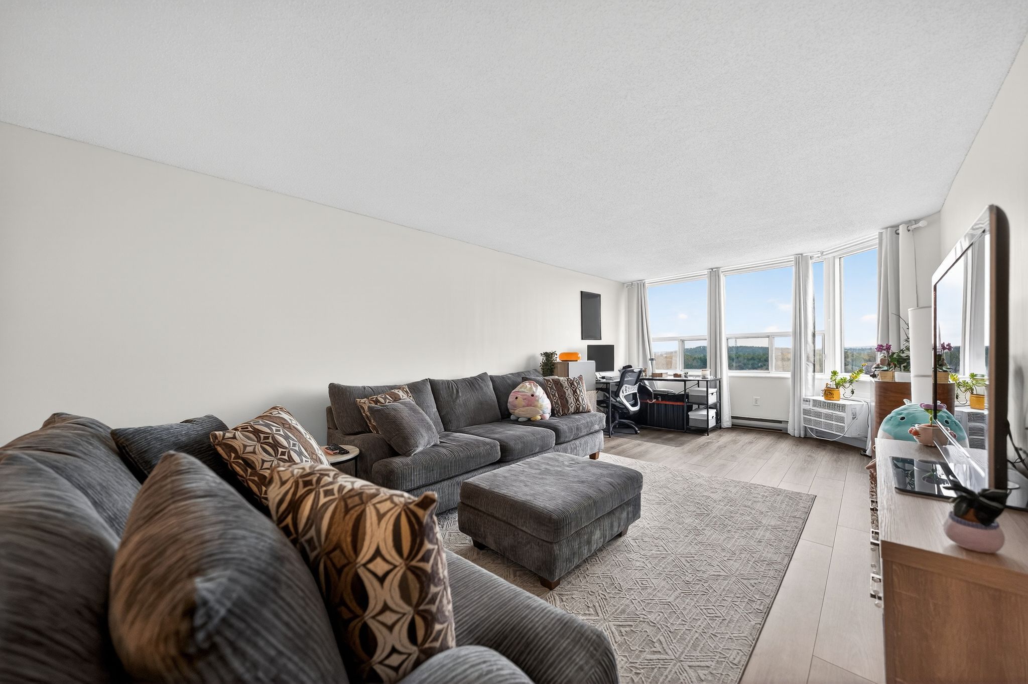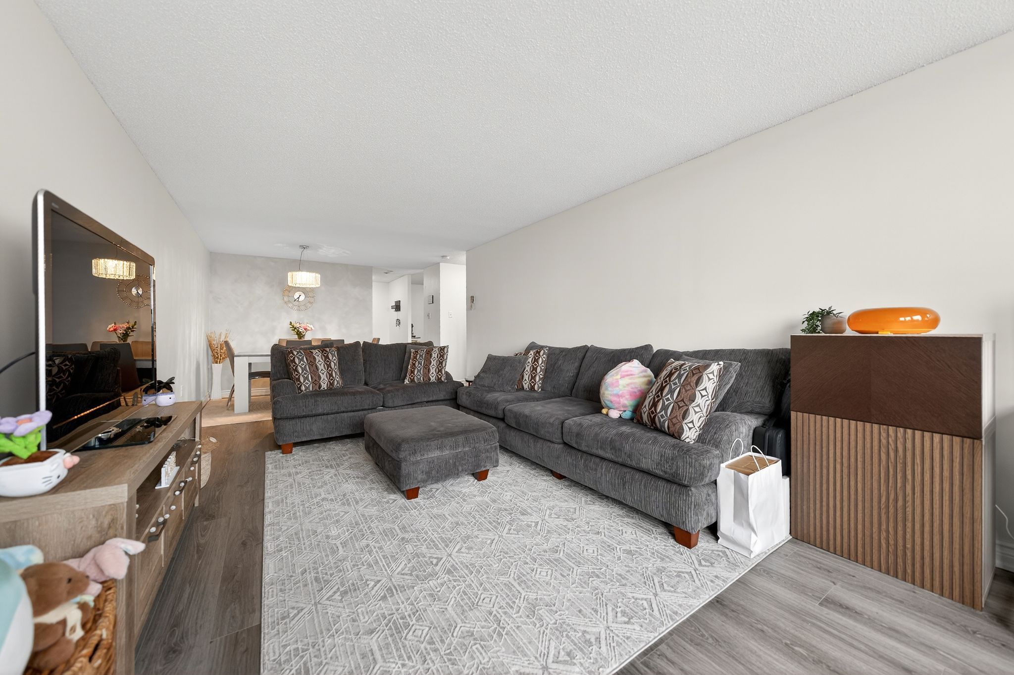 • Bright living and dining area with large windows for natural light.