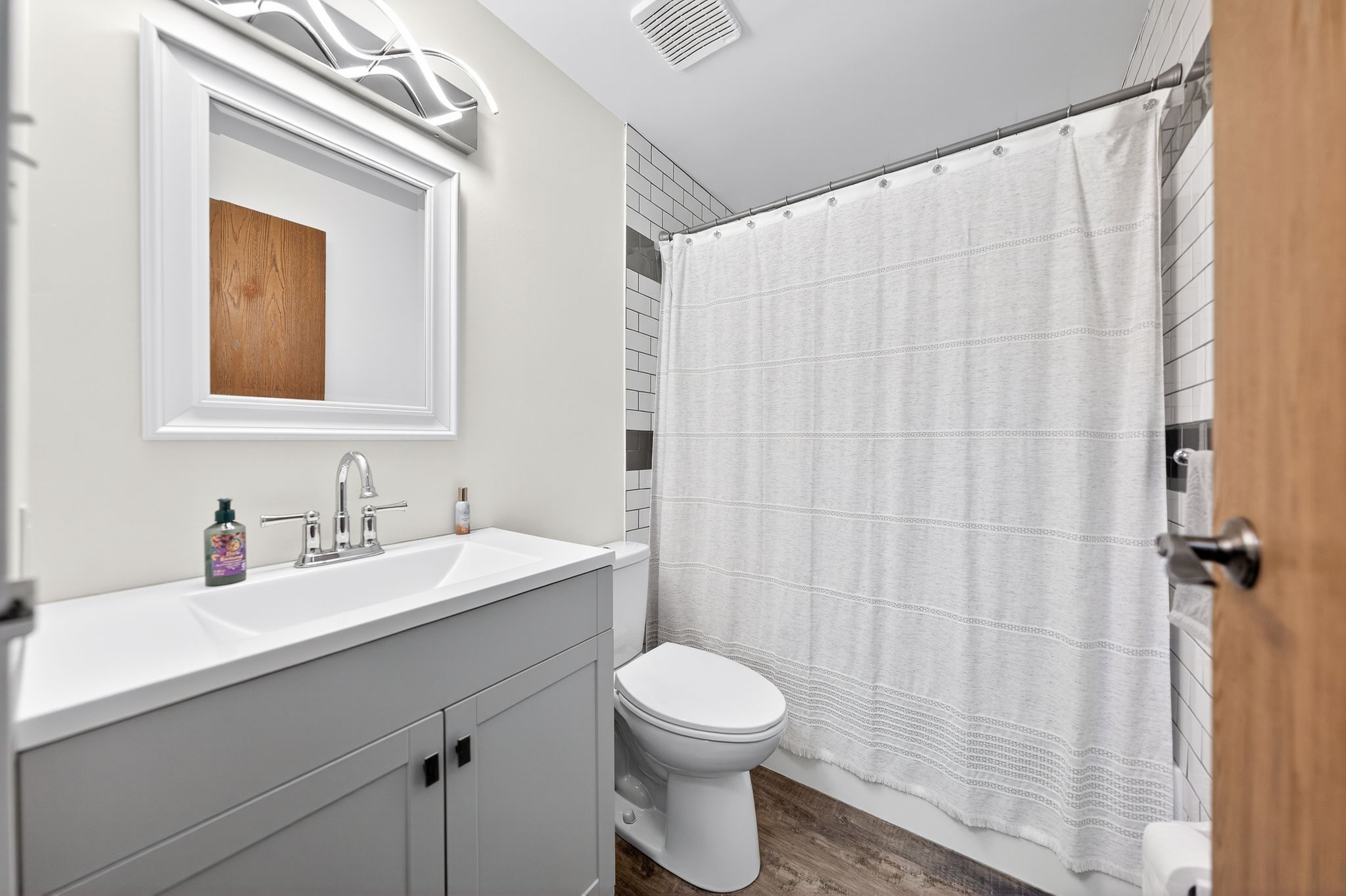 • Modern kitchen features updated cabinetry and ample counter space.