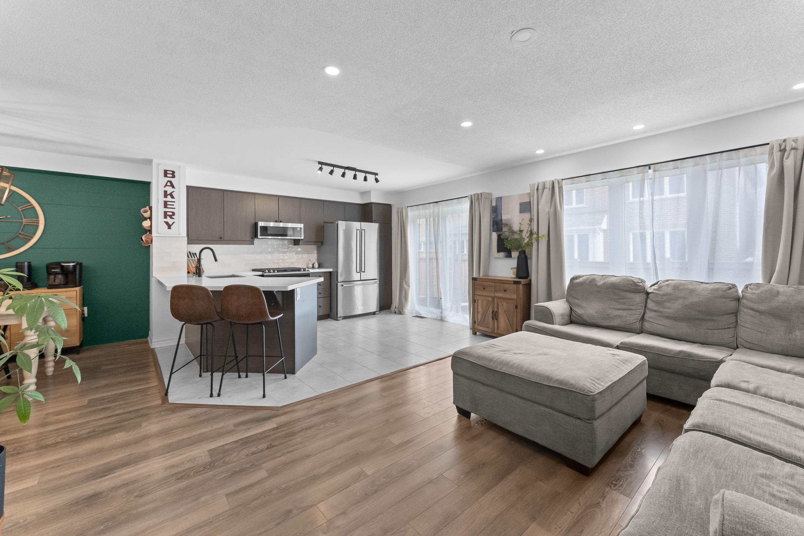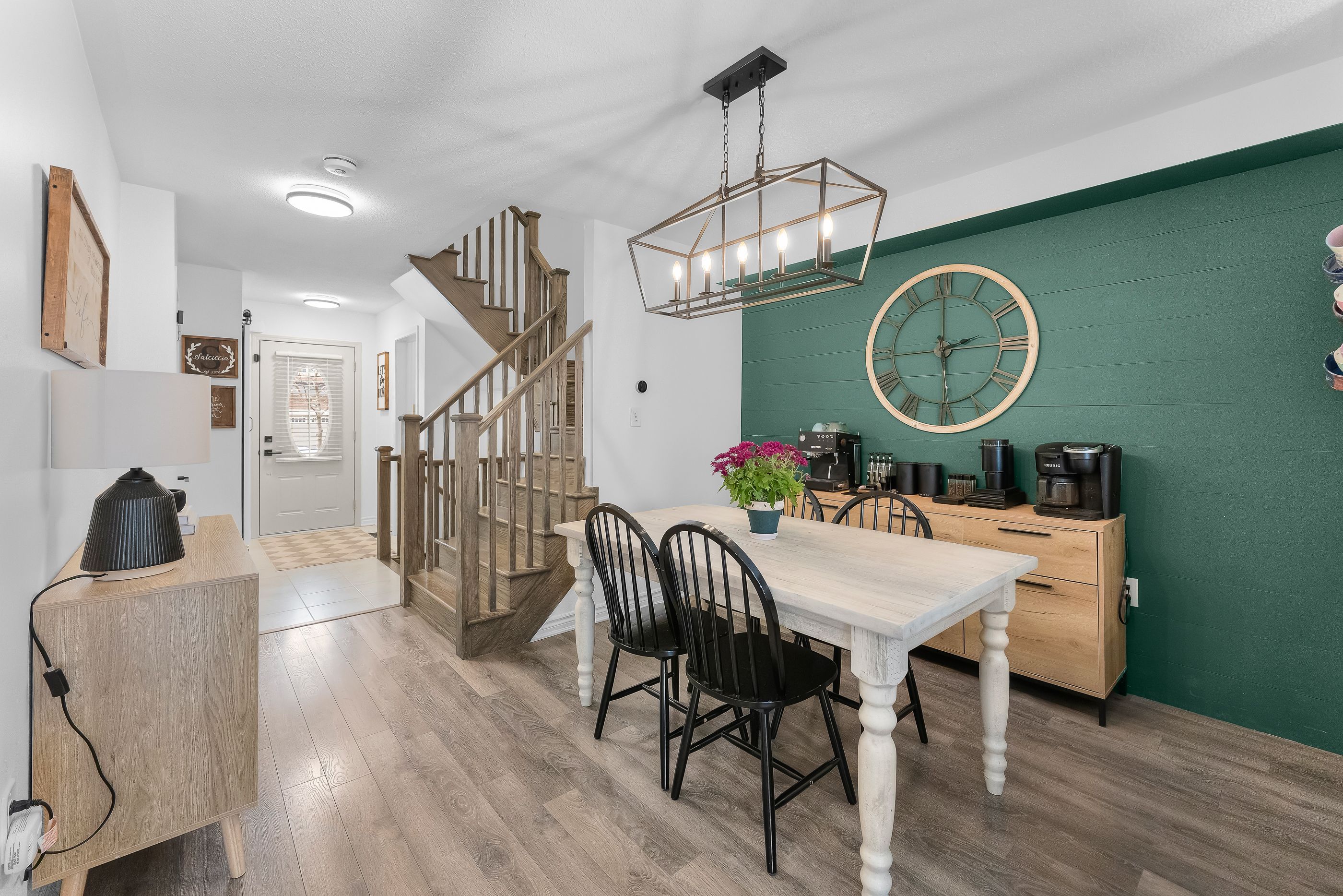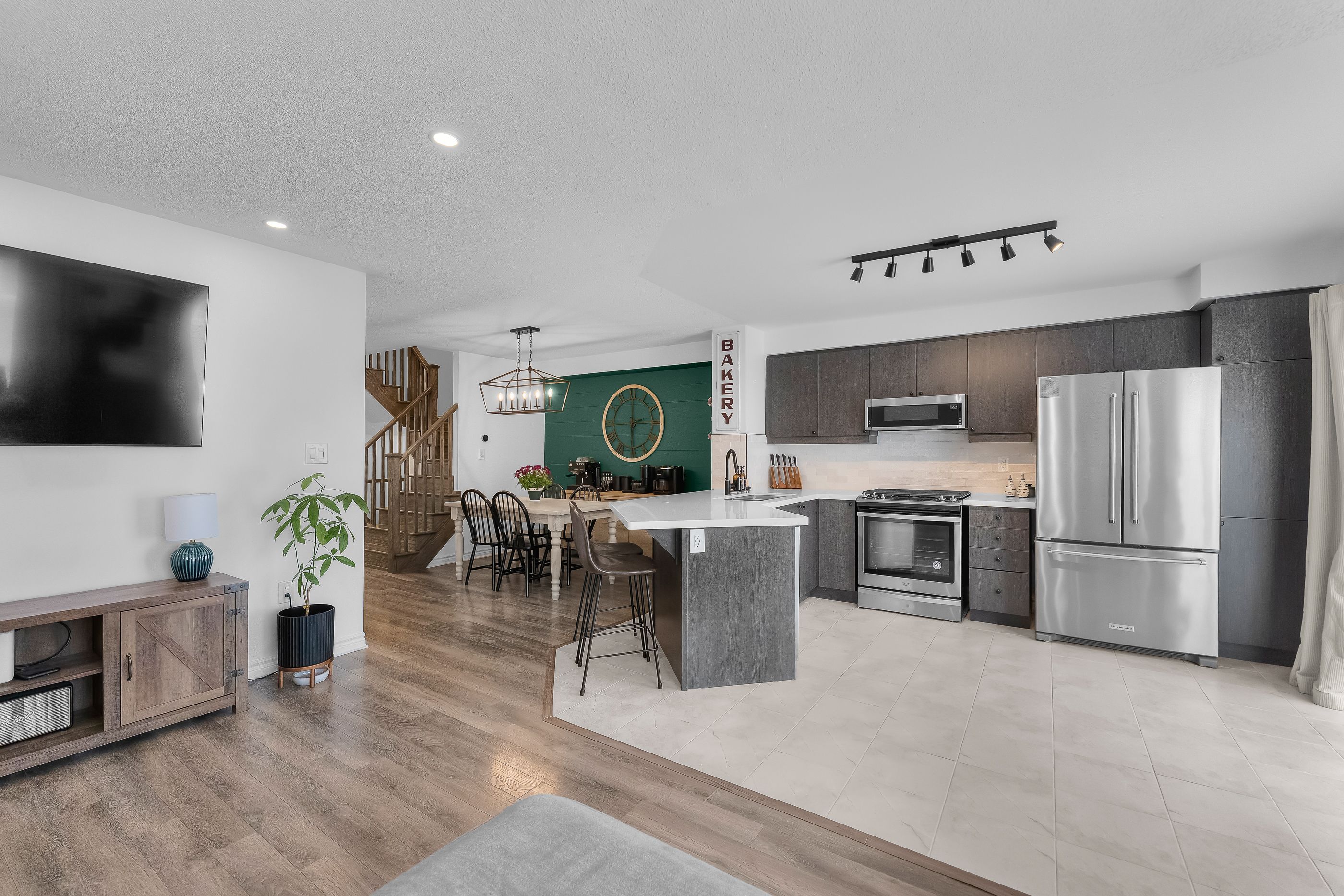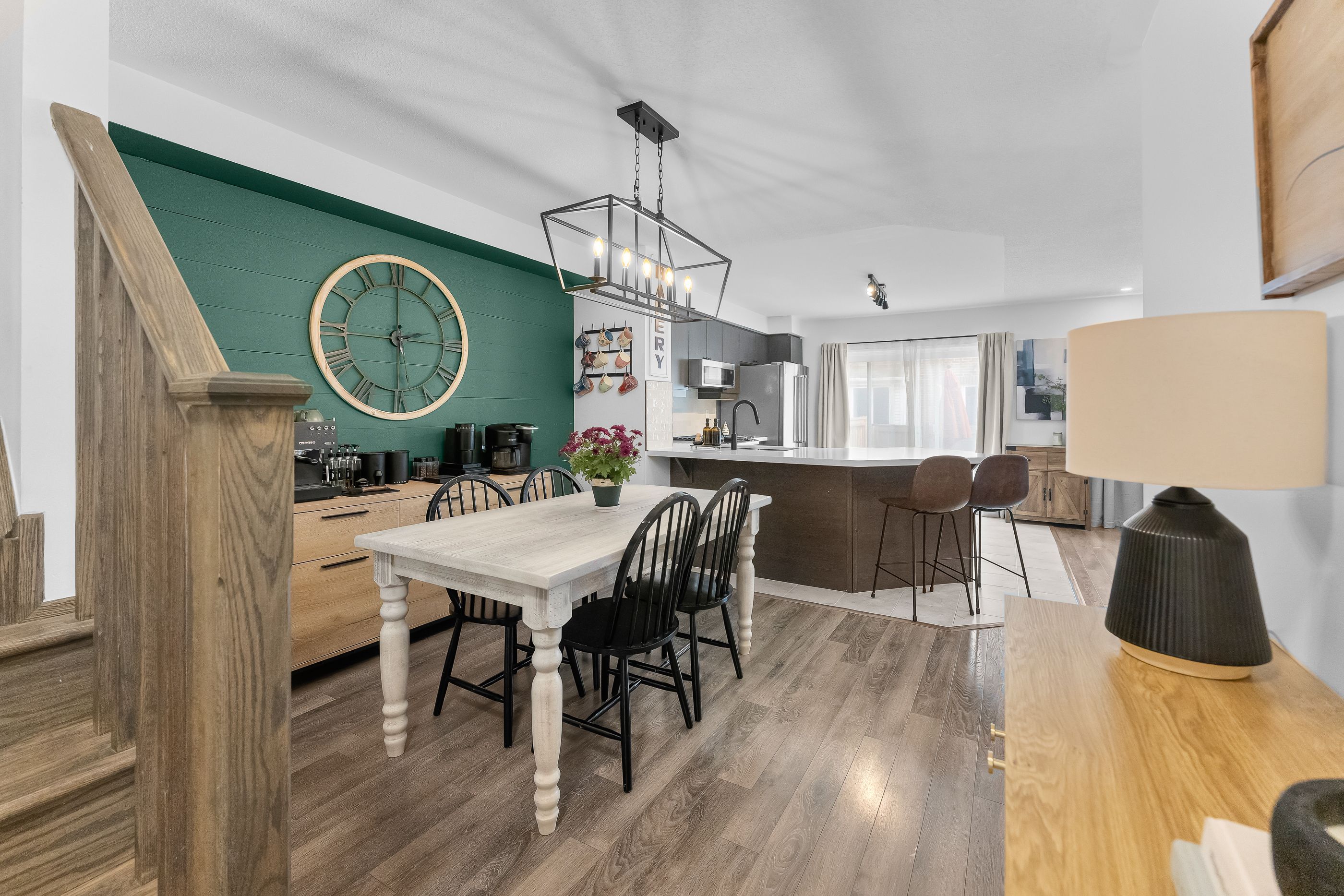 • Open-concept main level featuring a contemporary kitchen and dining area.