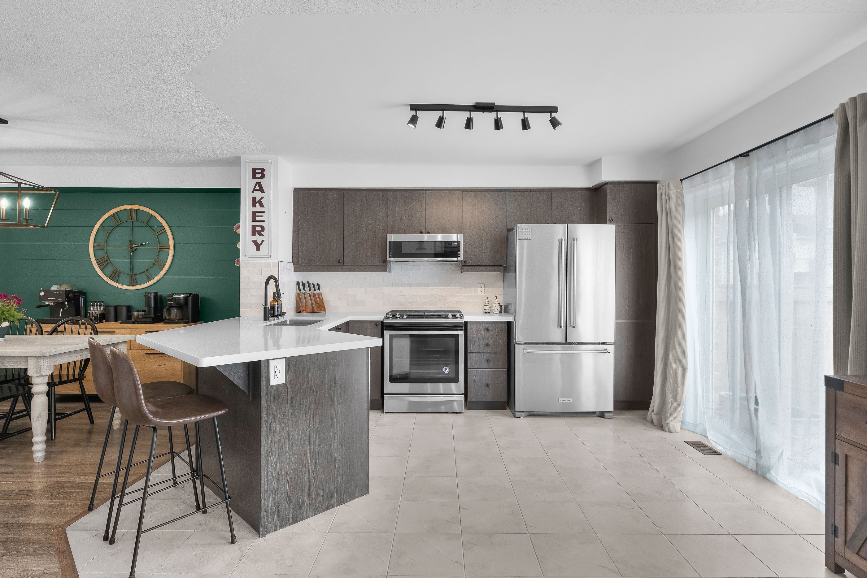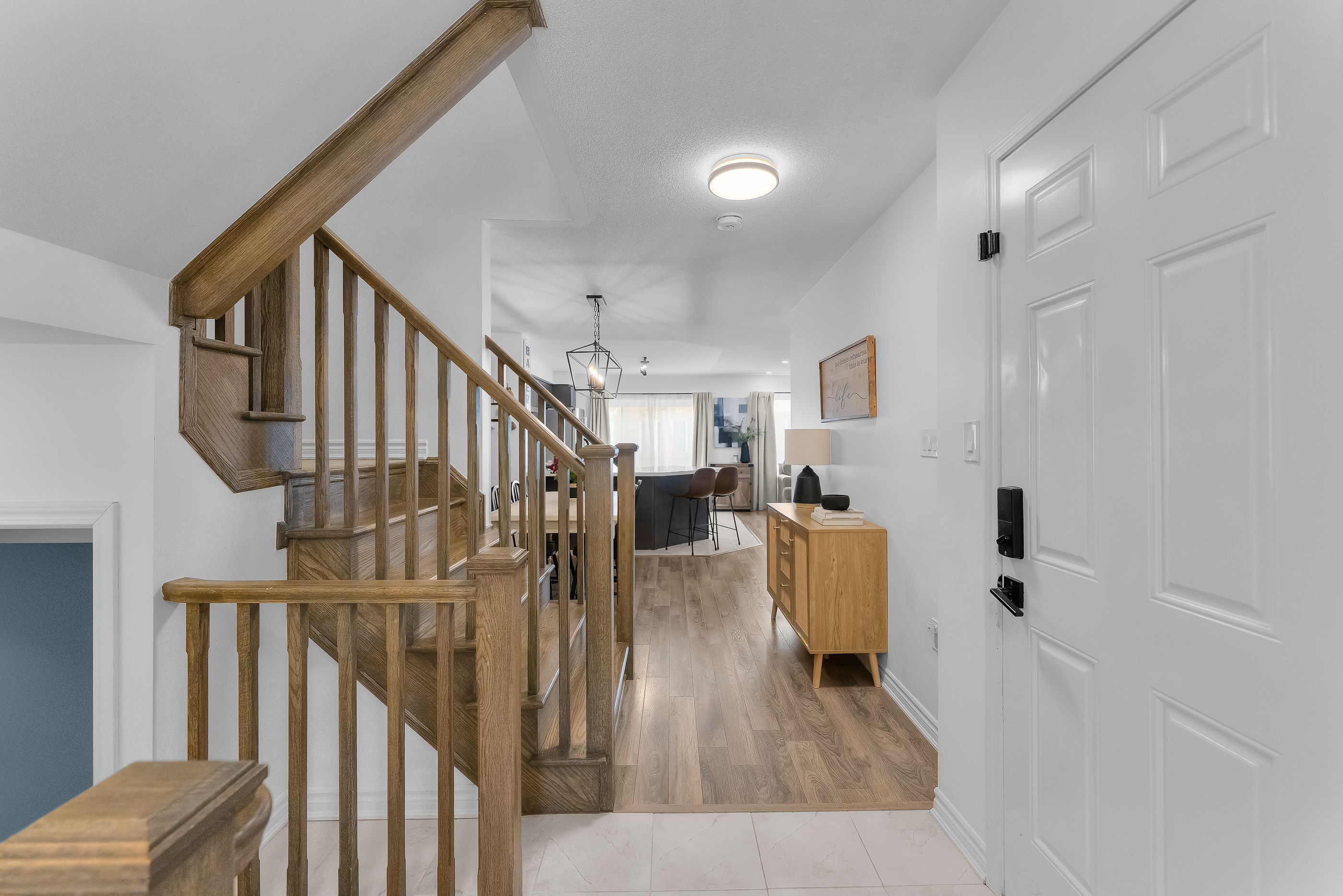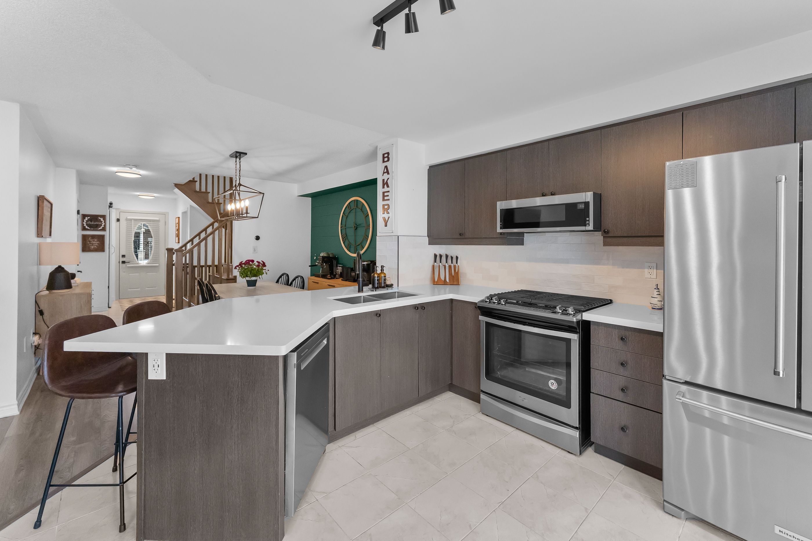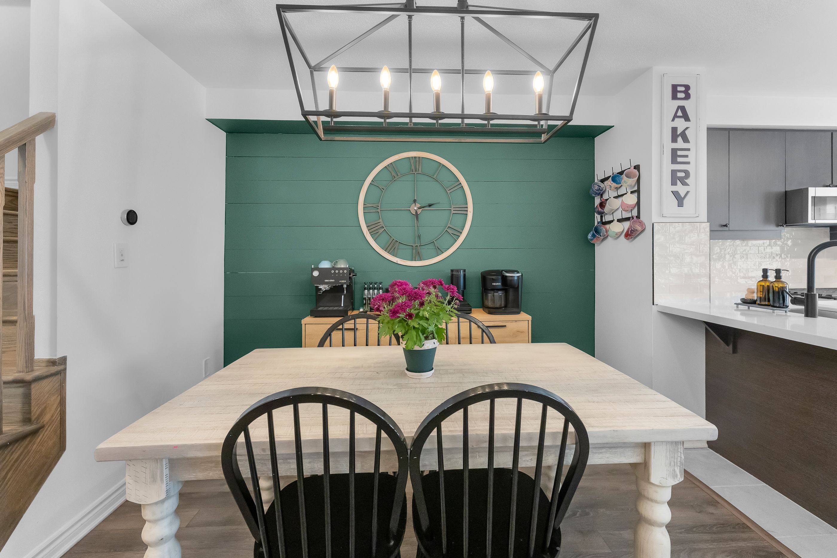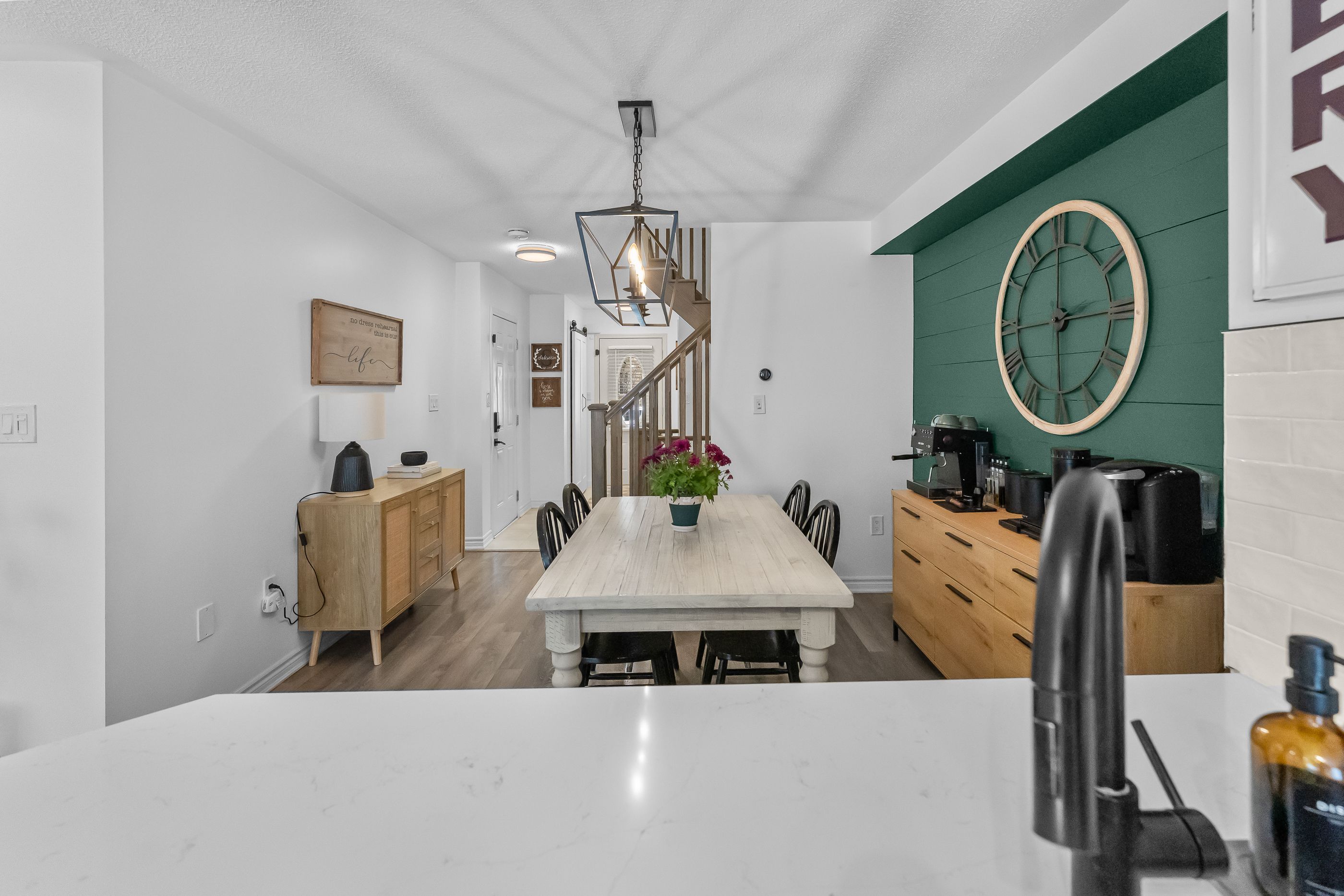 • Open-concept main level featuring a contemporary kitchen and dining area.