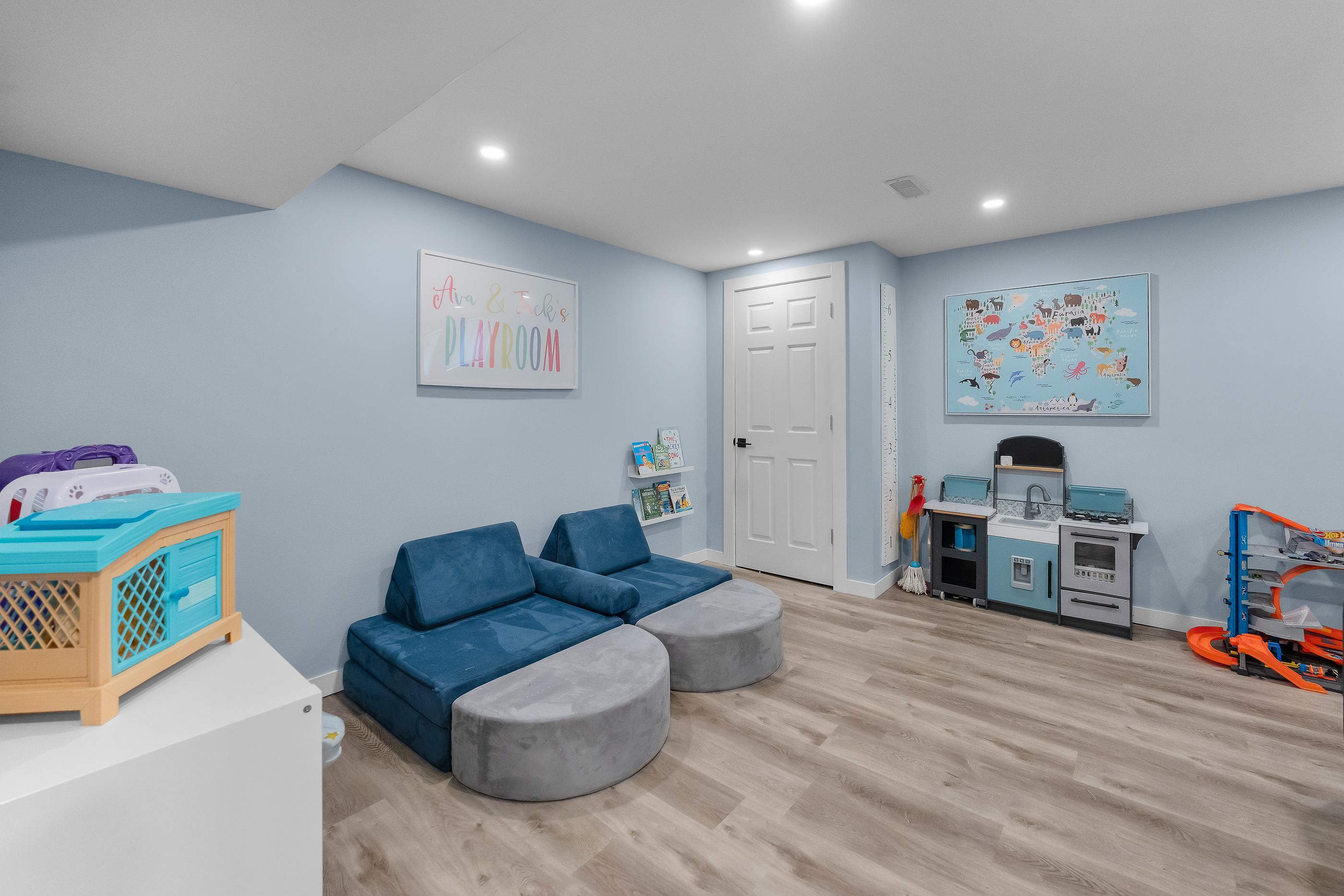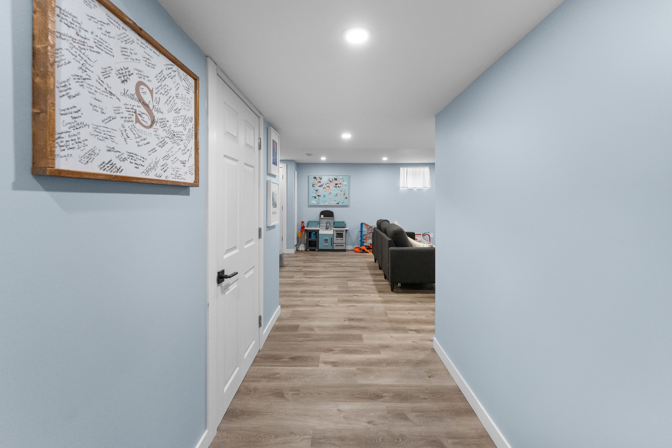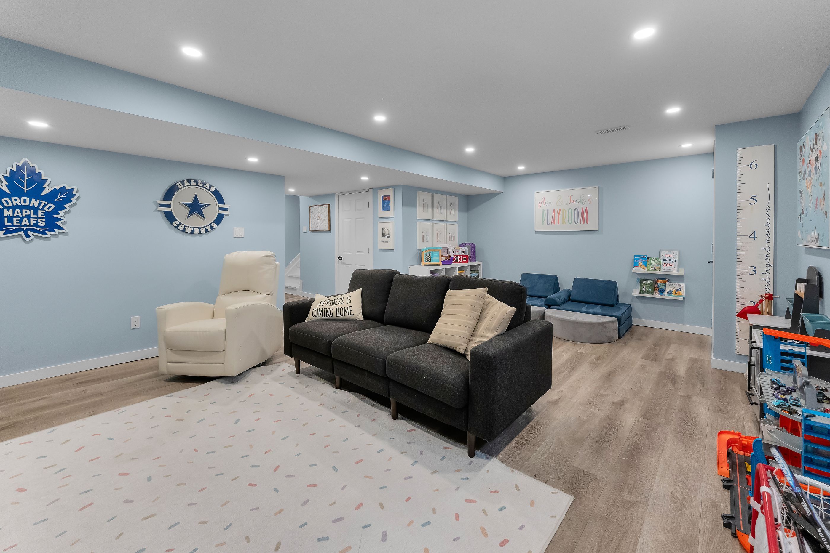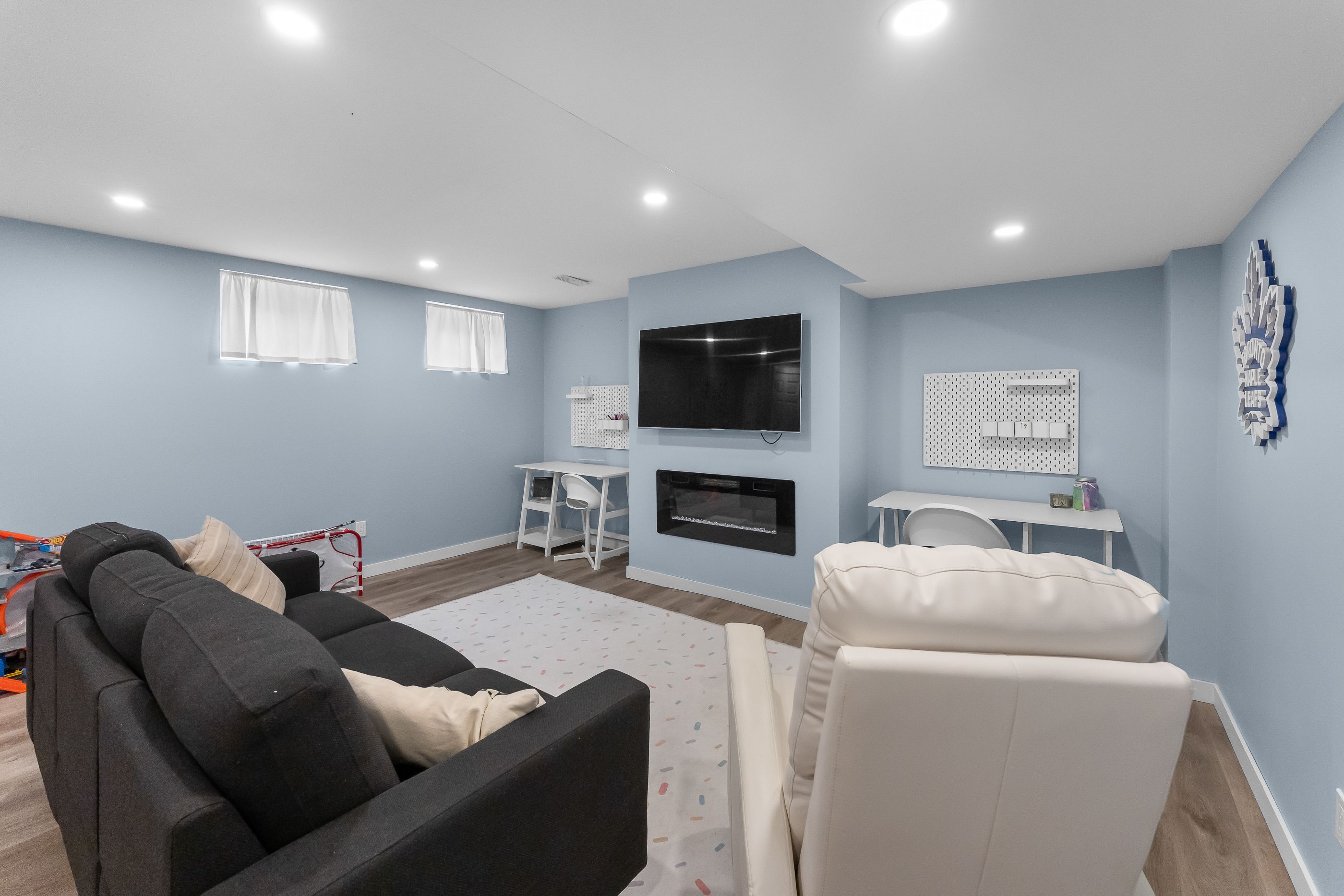 • Finished basement offers a cozy rec room and electric fireplace.