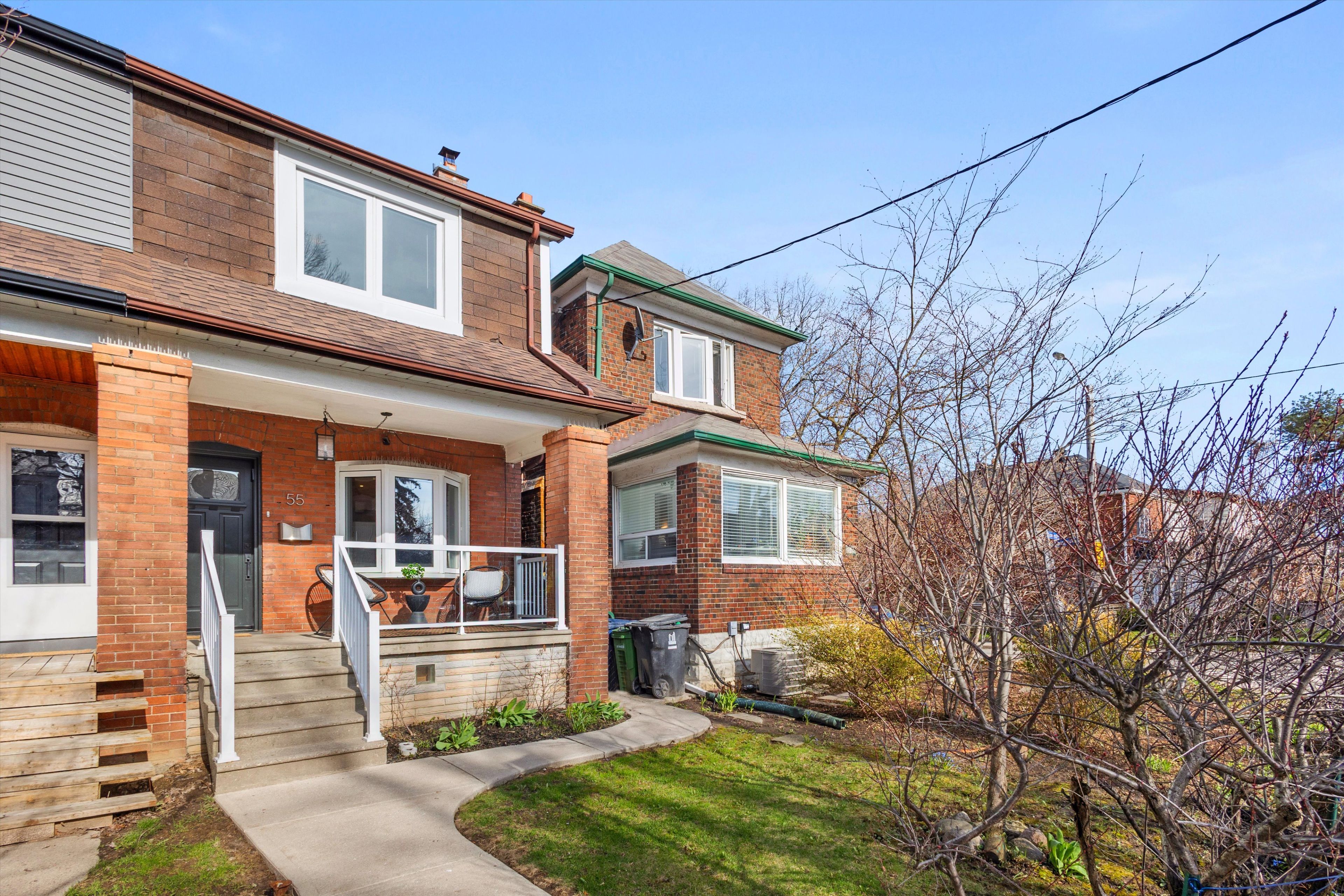 Welcome to 55 kenwood avenue: a stylish, move-in-ready semi-detached gem nestled in the coveted humewood-cedarvale community. Curb appeal abounds with a beautiful front porch, perfect for morning coffee or relaxing summer evenings. This beautifully updated 2-storey brick home offers 3 spacious bedrooms, 2 luxurious heated-floor bathrooms, and a thoughtfully designed open-concept layout that effortlessly blends warmth with modern sophistication. Pride of ownership is evident throughout every room of this meticulously maintained property. The main floor impresses from the moment you step into the foyer, flowing right into sun-drenched living and dining spaces adorned with rich hardwood floors, crown moulding, pot lights, and a cozy gas fireplace. The chef's kitchen features granite countertops, a breakfast bar, and stainless steel appliances, complemented by a rare mudroom with a walk-out to a rear deck and a backyard perfect for entertaining family and friends season after season. Upstairs, the stunning primary bedroom boasts soaring cathedral ceilings, generous his-and-hers closets, plus an additional built-in closet wall. Two additional well-proportioned bedrooms offer hardwood floors and ample storage. The bright basement level hosts a sprawling media and entertainment room with above-grade windows and vinyl flooring, alongside a modern laundry room with plenty of storage throughout. The detached garage is accessed through the backyard and can accommodate one car, plus one more on the driveway. Catchment schools include humewood community school (jk - 8) and oakwood collegiate institute (9 - 12). Stay connected: just a 5-minute walk to st. Clair west subway, streetcar, loblaws, various shops, cafes and restaurants all along saint clair avenue west.