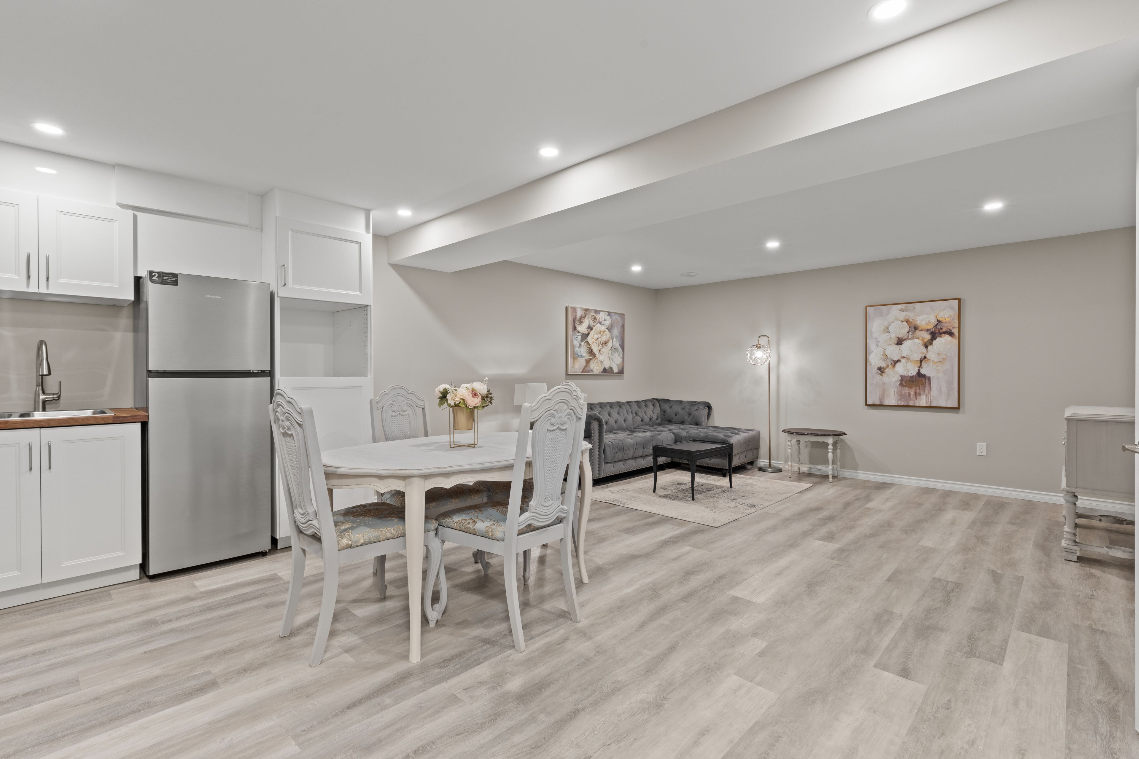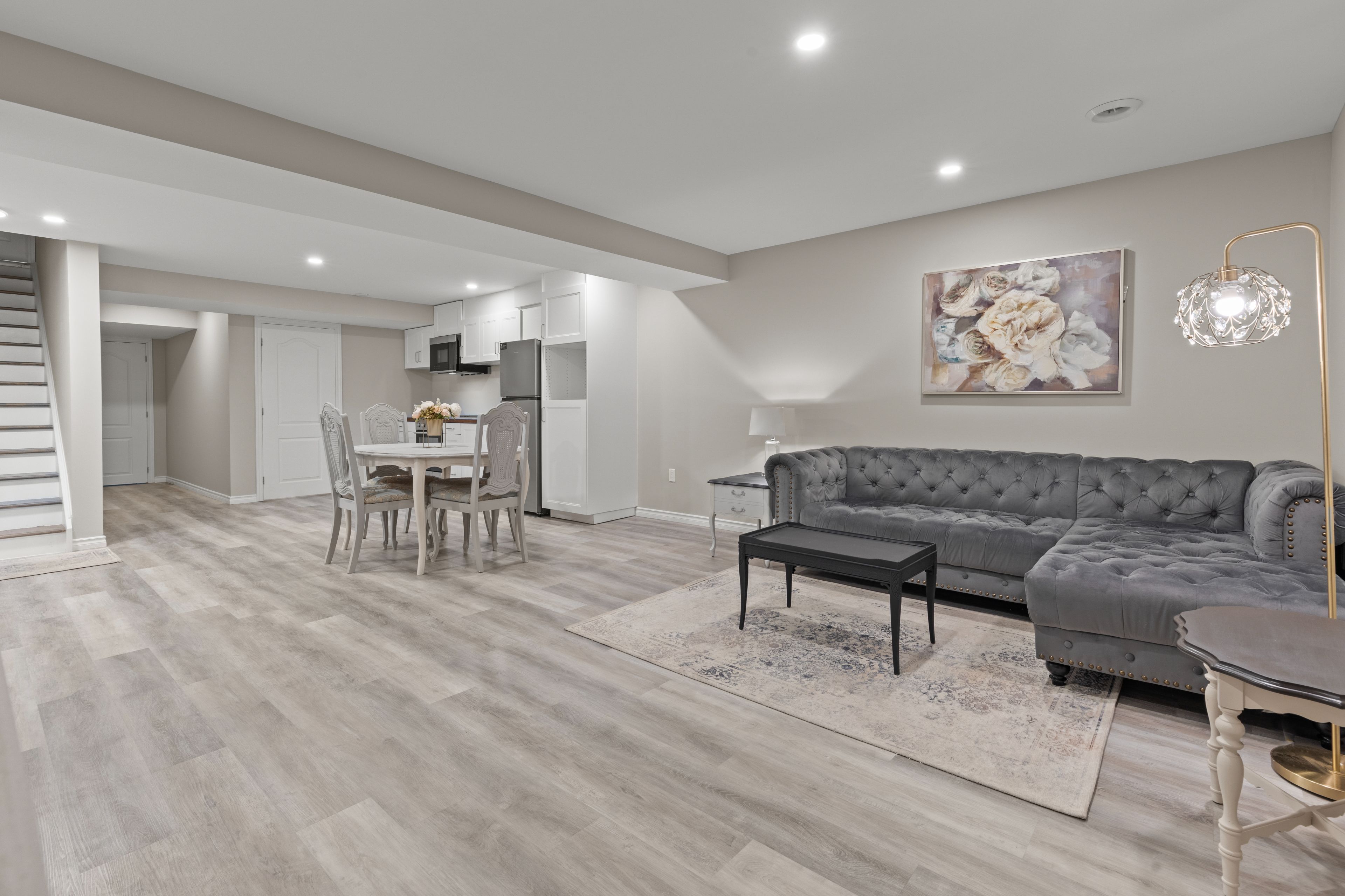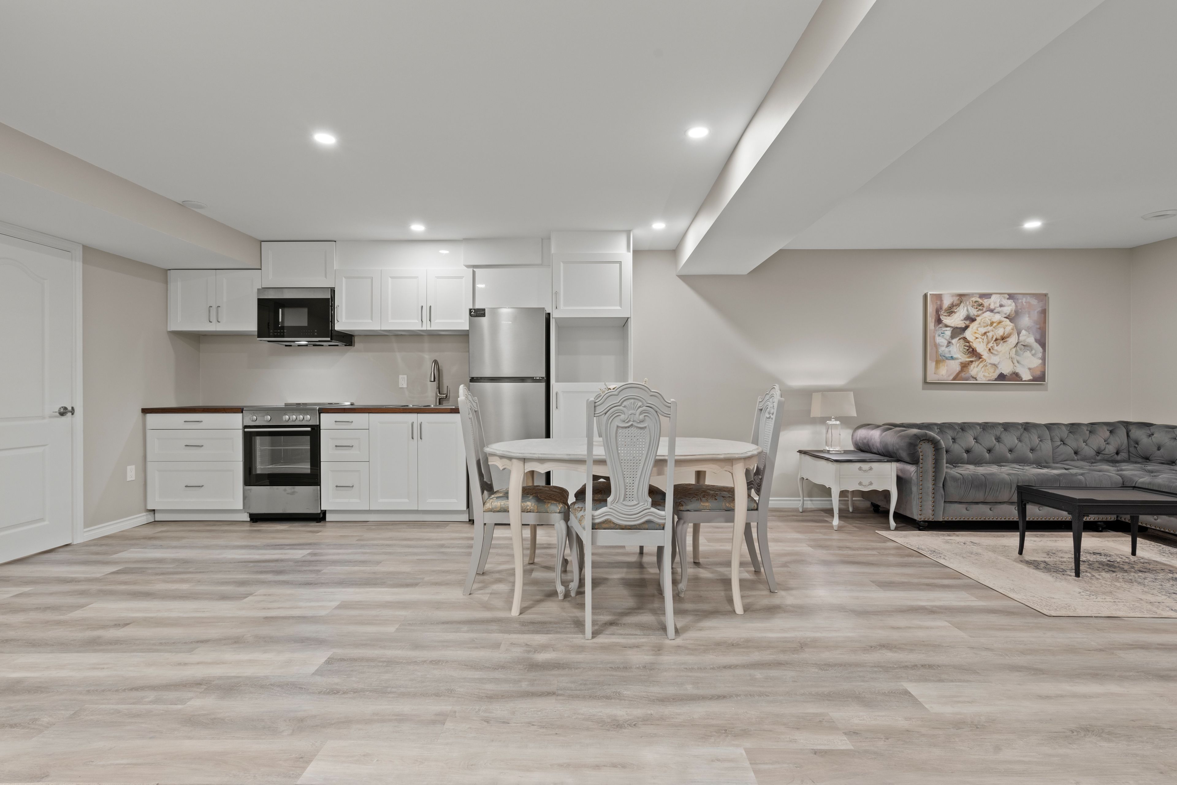• Chic open concept layout with upgraded flooring and pot lights.