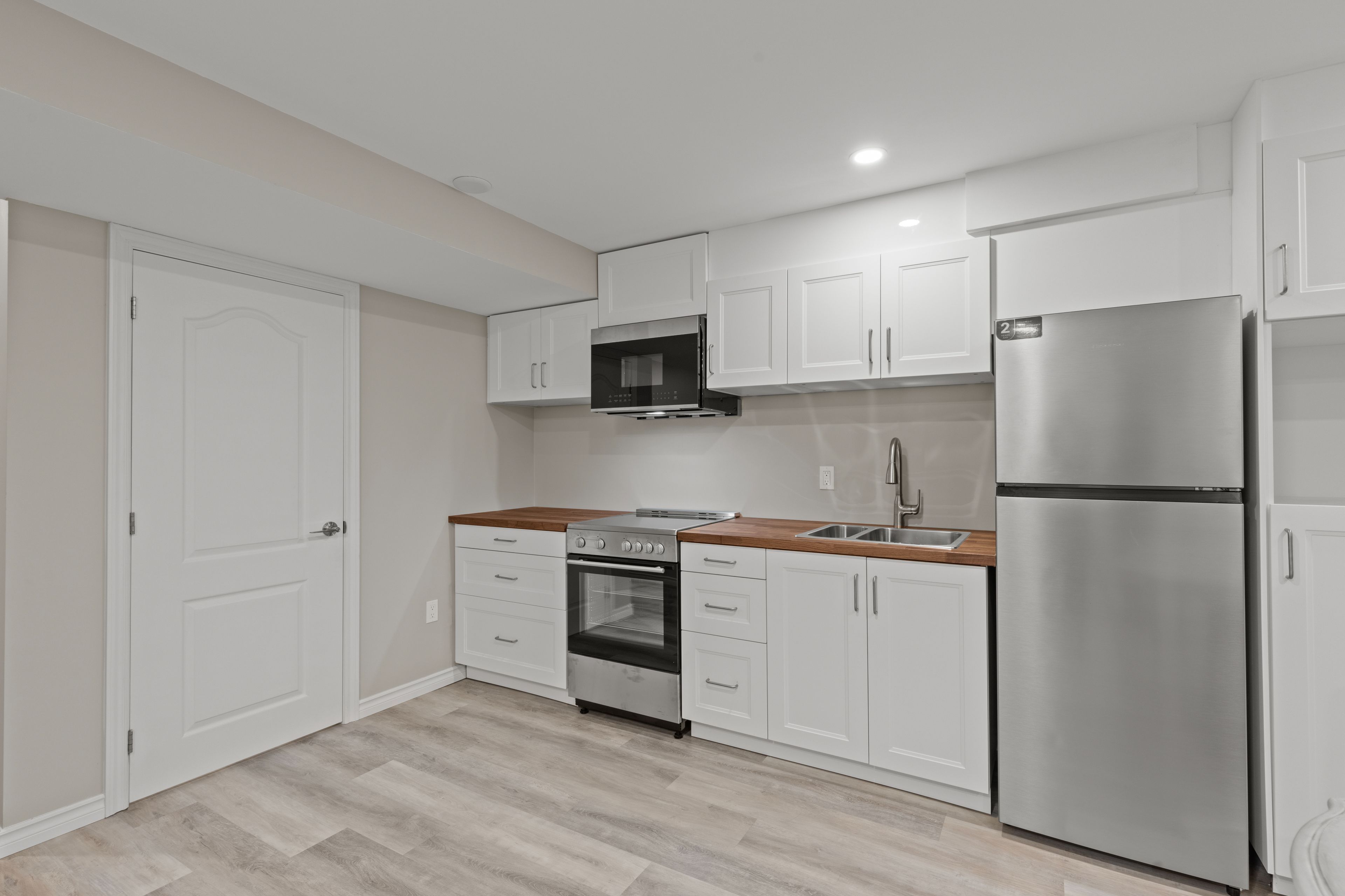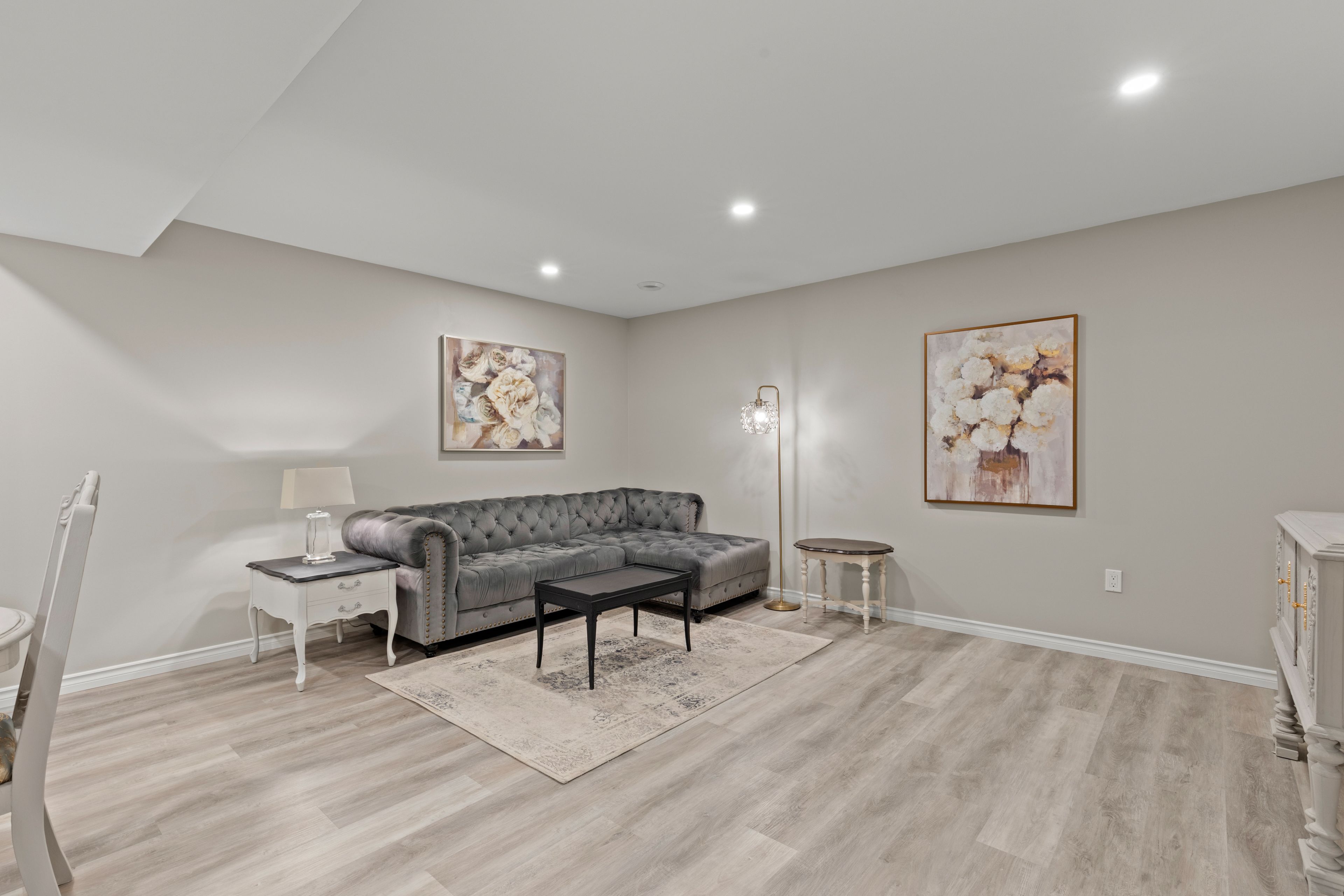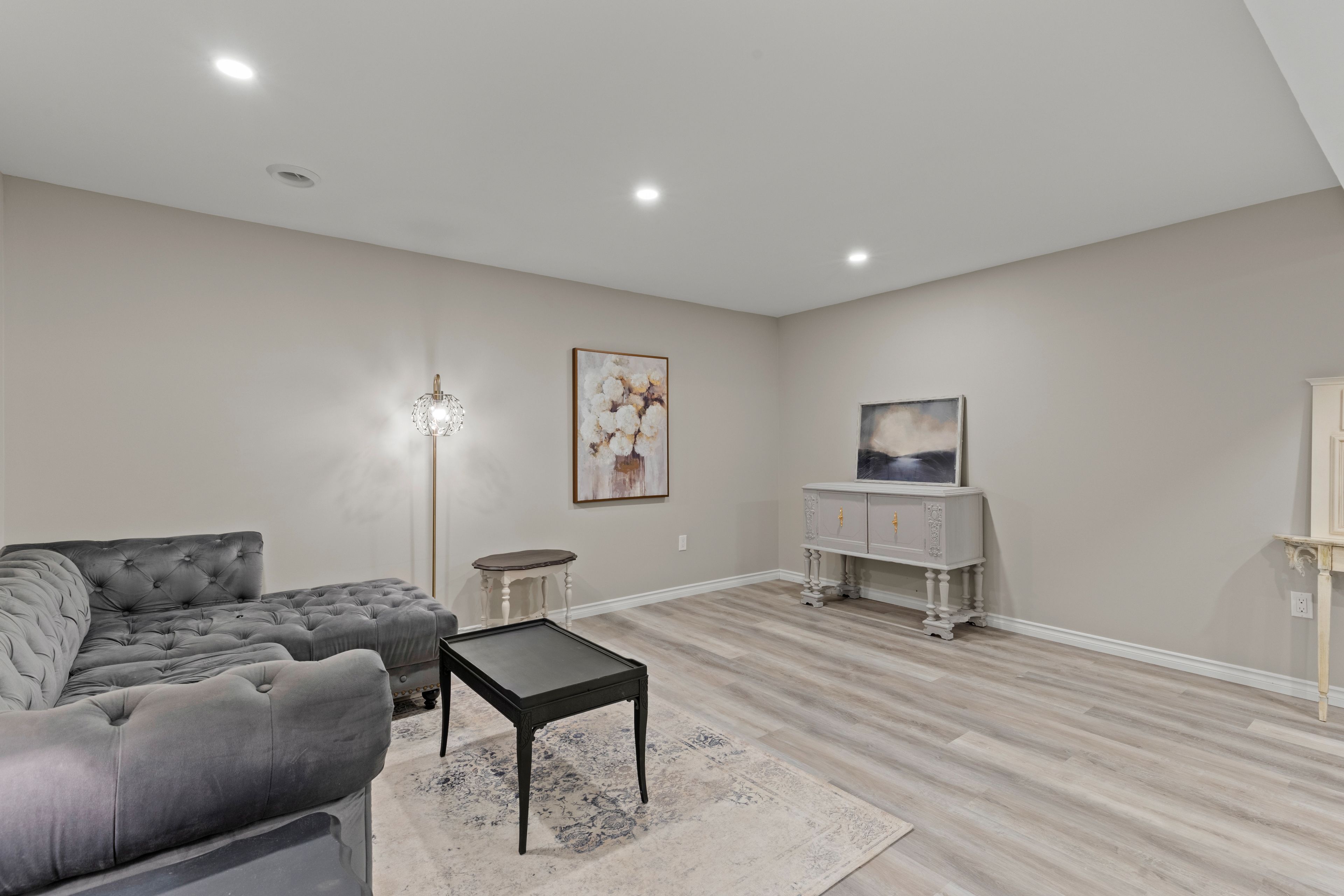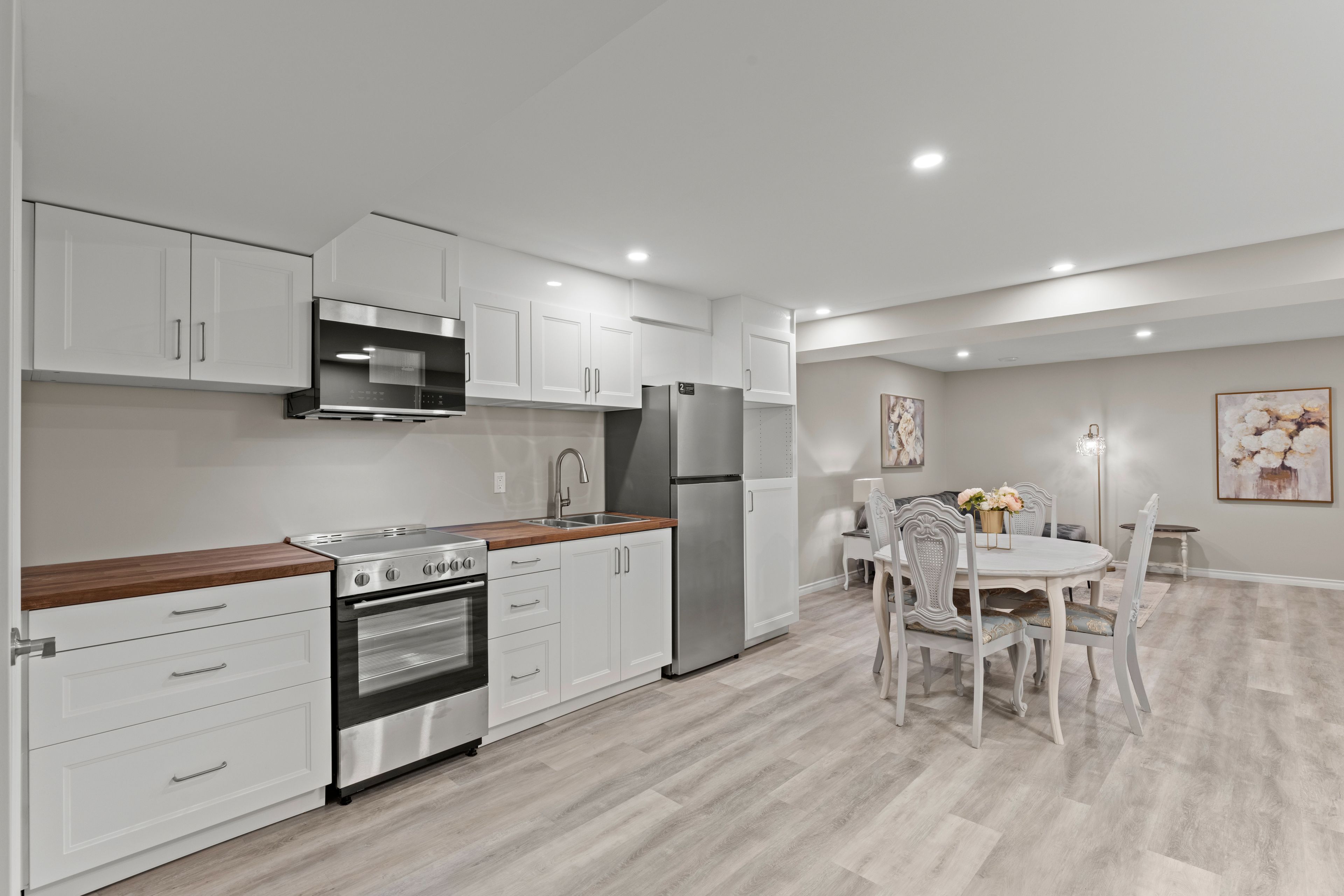 • Chic open concept layout with upgraded flooring and pot lights.