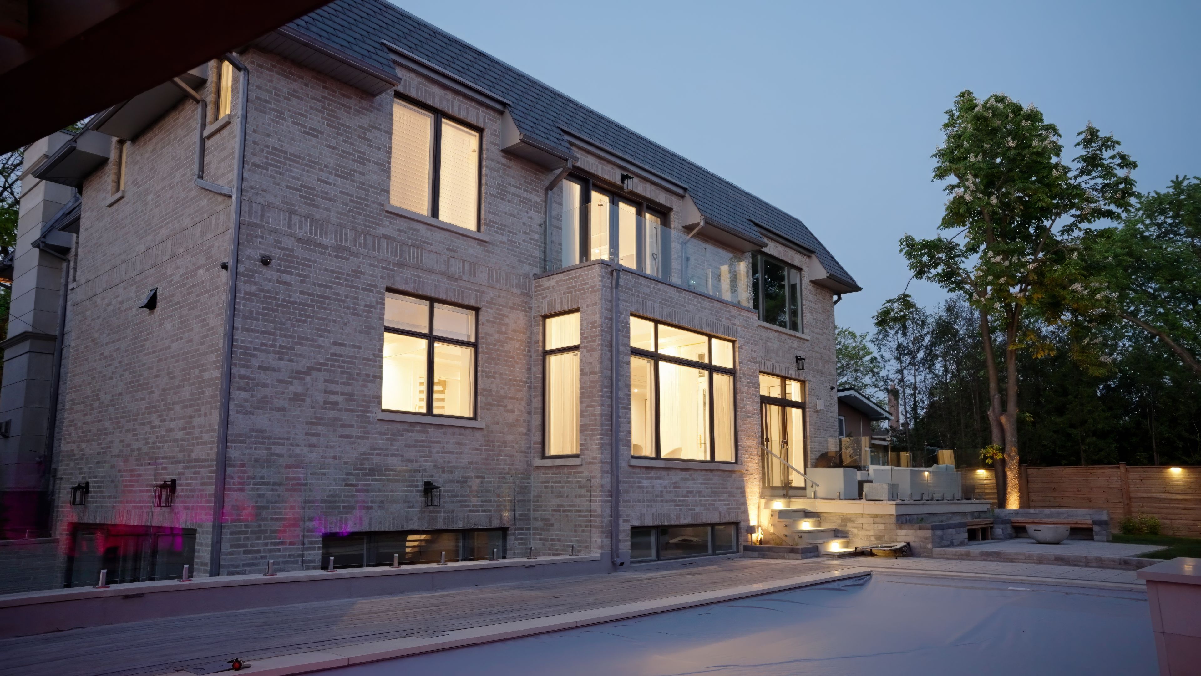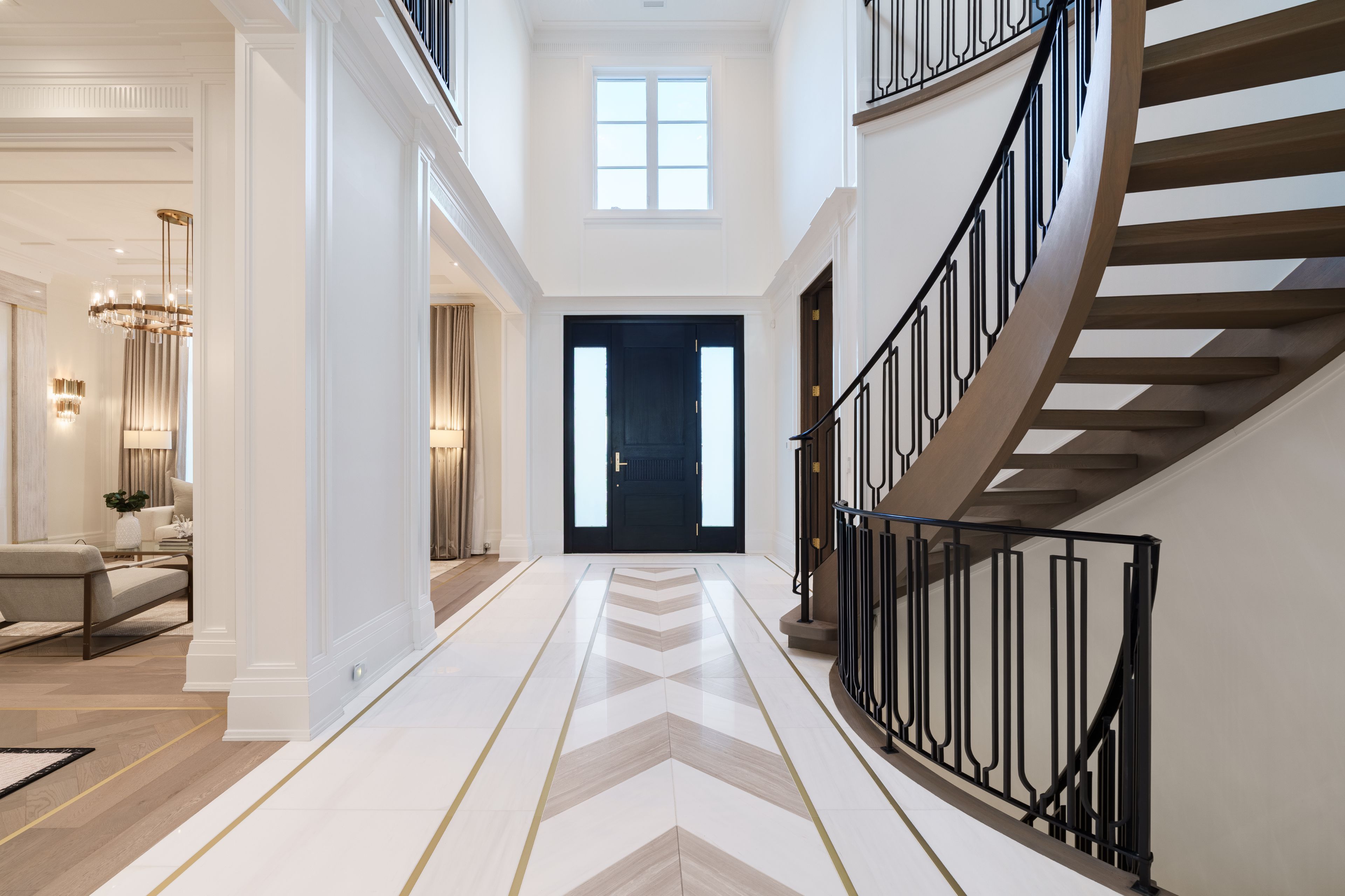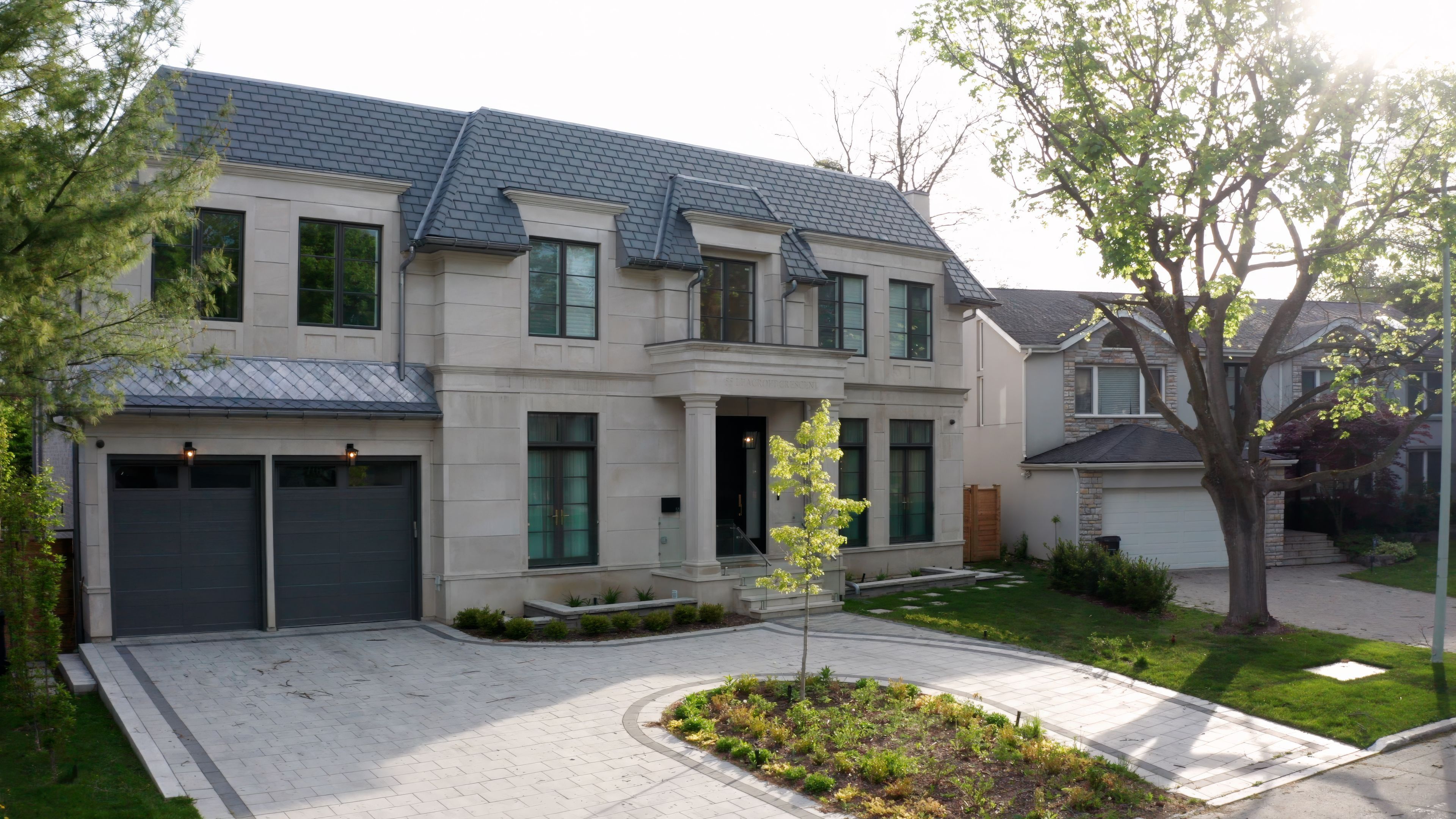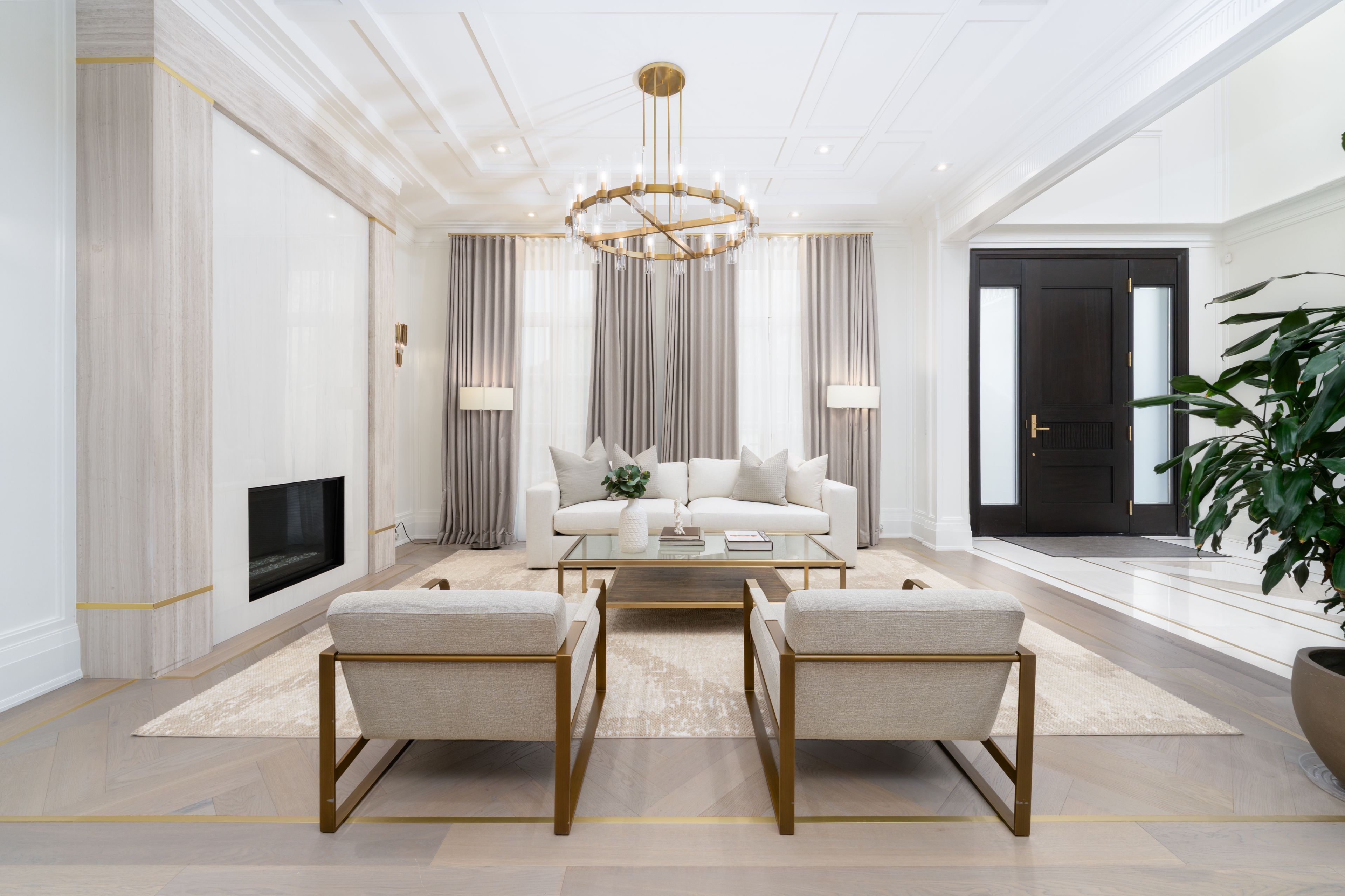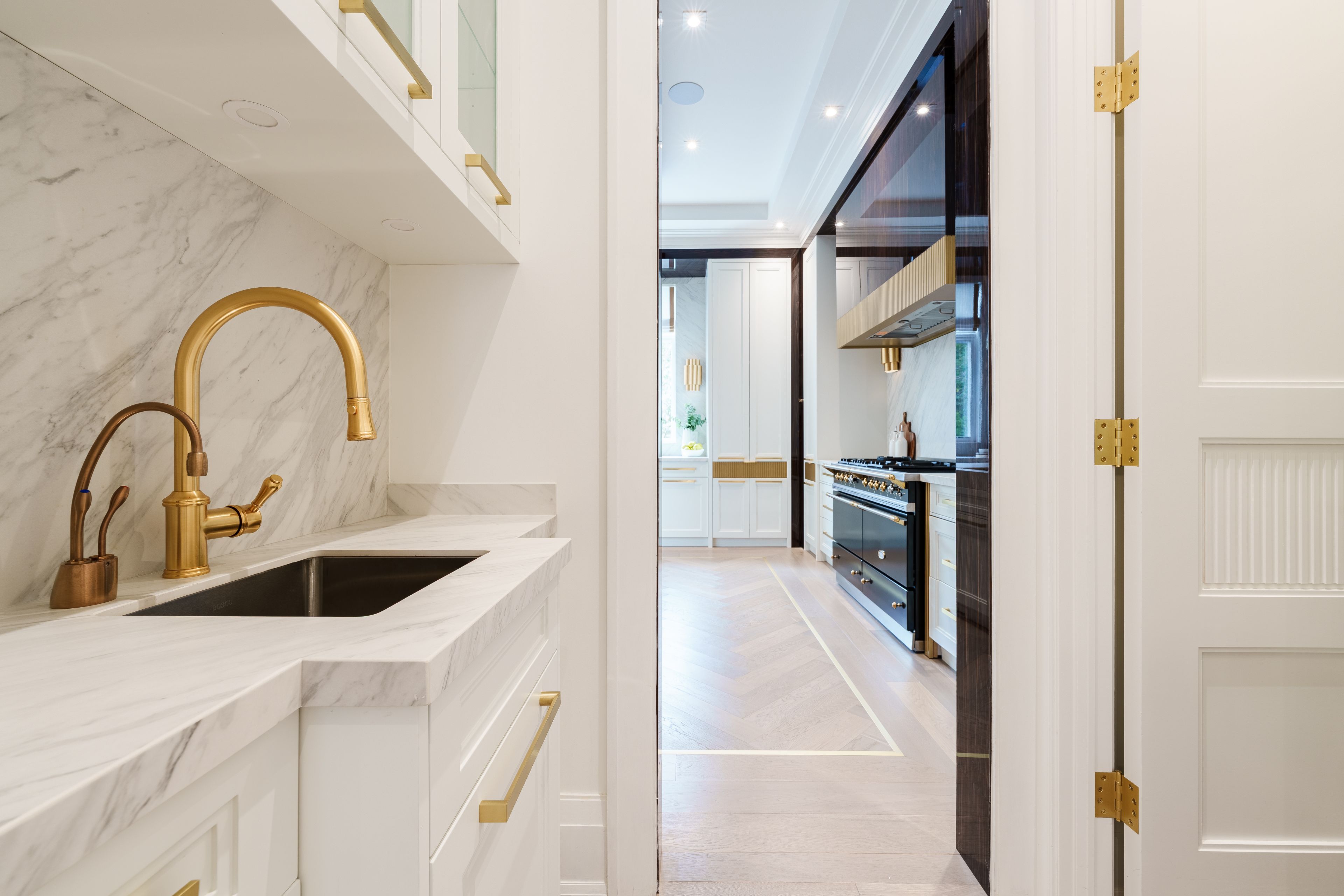 Neighbourhood of banbury only about 650 homes in this neighborhood, right next to the bridle path, considered one of toronto's premiere neighbourhoods. Welcome to 55 leacroft, showcasing a 5 bedroom 9 bathroom, multiple fireplaces throughout the home, pool, a cabana, wine cellar, a sauna, movie theatre, gym, courtyard, a library, and even your own elevator. 11 ft main, 11 upstairs. Entire house is automated. 8,800 square feet of living space 10,000 sq ft land area 62 feet pies out to 117 ft at the back. Roof is synthetic slate, downspouts, gutters, coated copper, not aluminum. Designed by a renowned toronto-based architectural firm created by lorne rose who has designed beautiful homes across the gta. Main floor with transitional entryway, dolomite marble in this really unique almost chevron like pattern, pairs well with the herringbone hardwood flooring throughout the house, elements of brass woven throughout the home. Kitchen featuring a huge pantry, 30 inch standing fridge and another 30 inch standing freezer, ebony coloured cabinets, bookmatch marble throughout including over the island, ribbed brass accents, metal coated accents, la canche stovetop, waterstone fixtures.