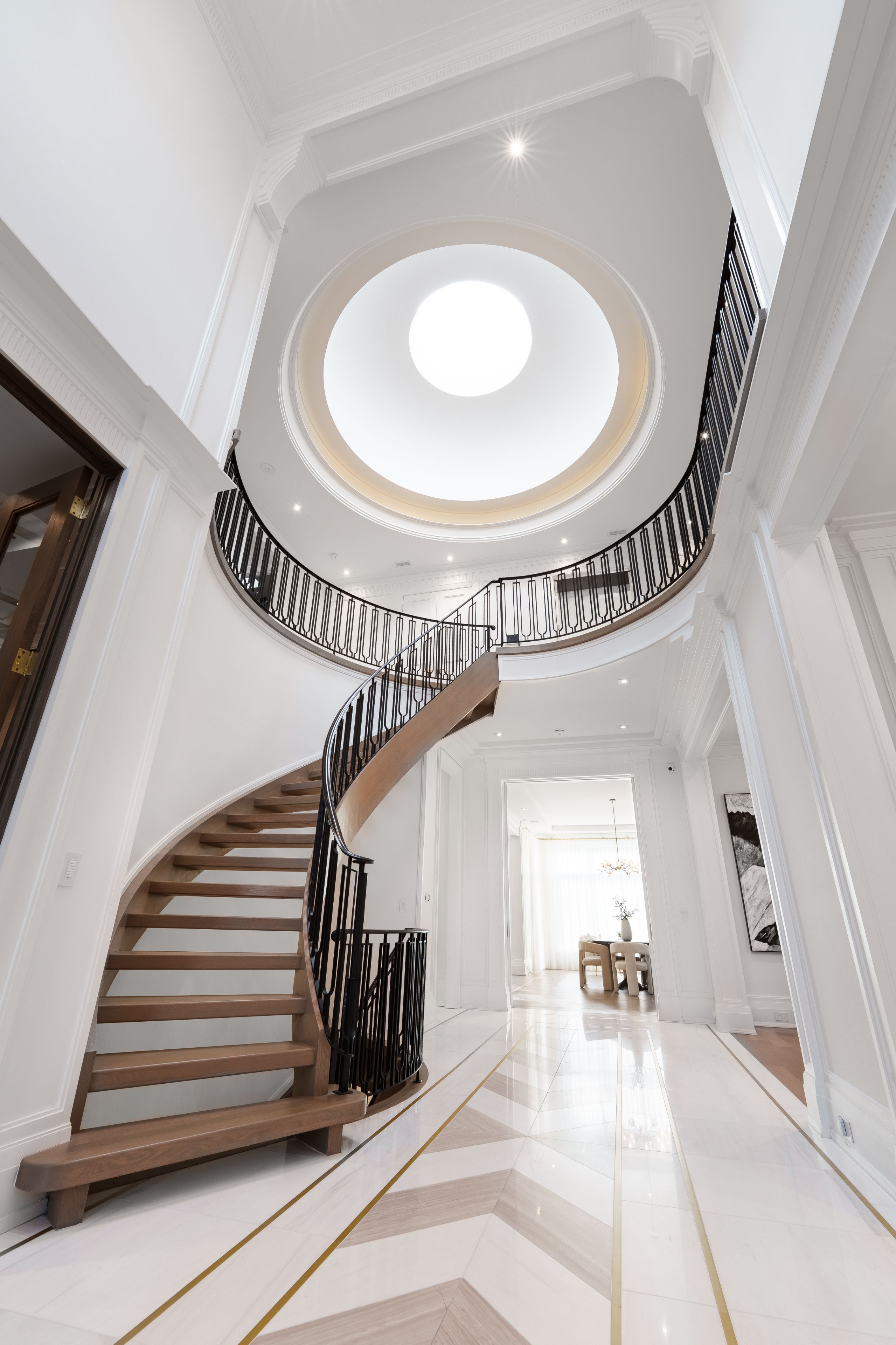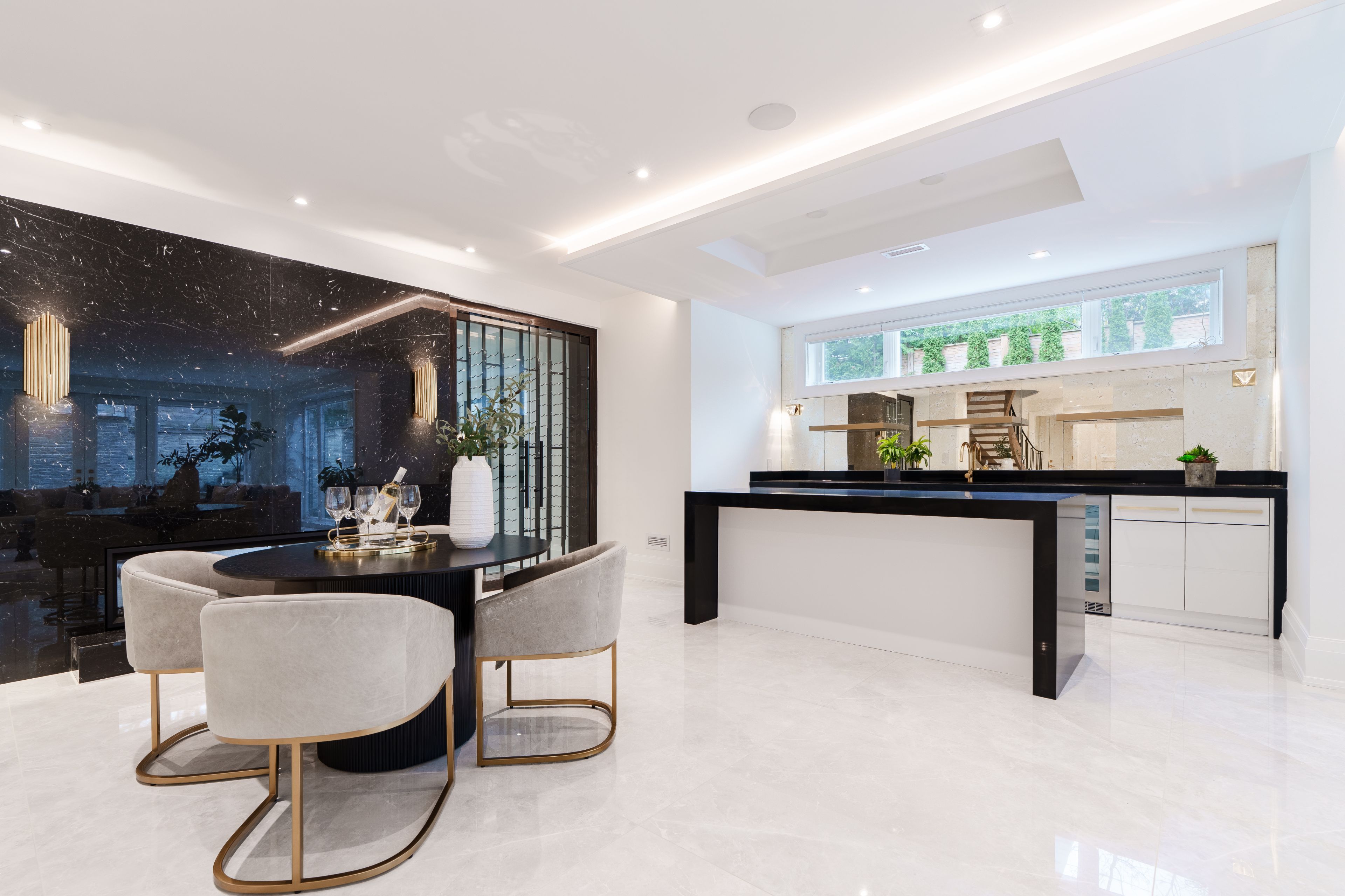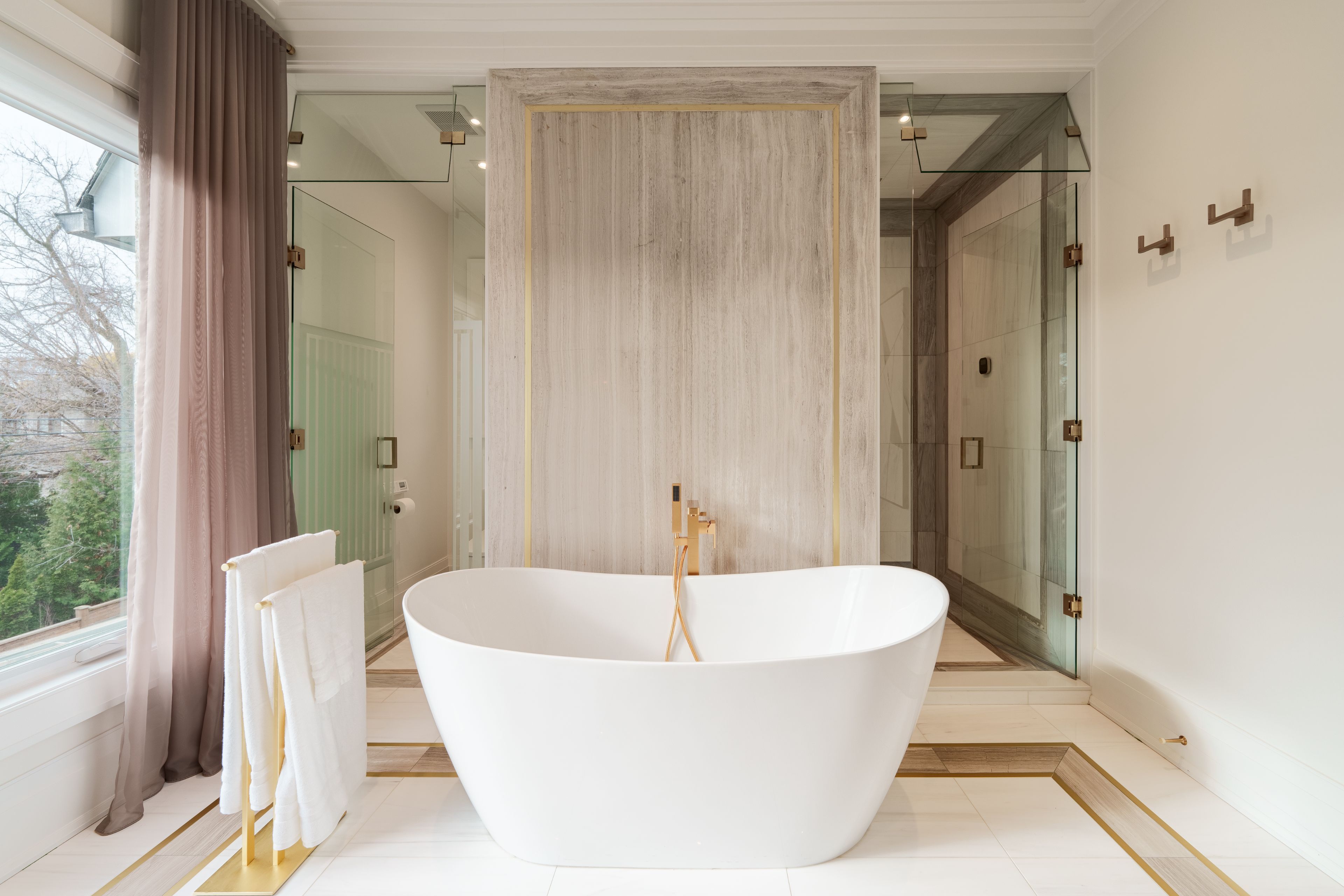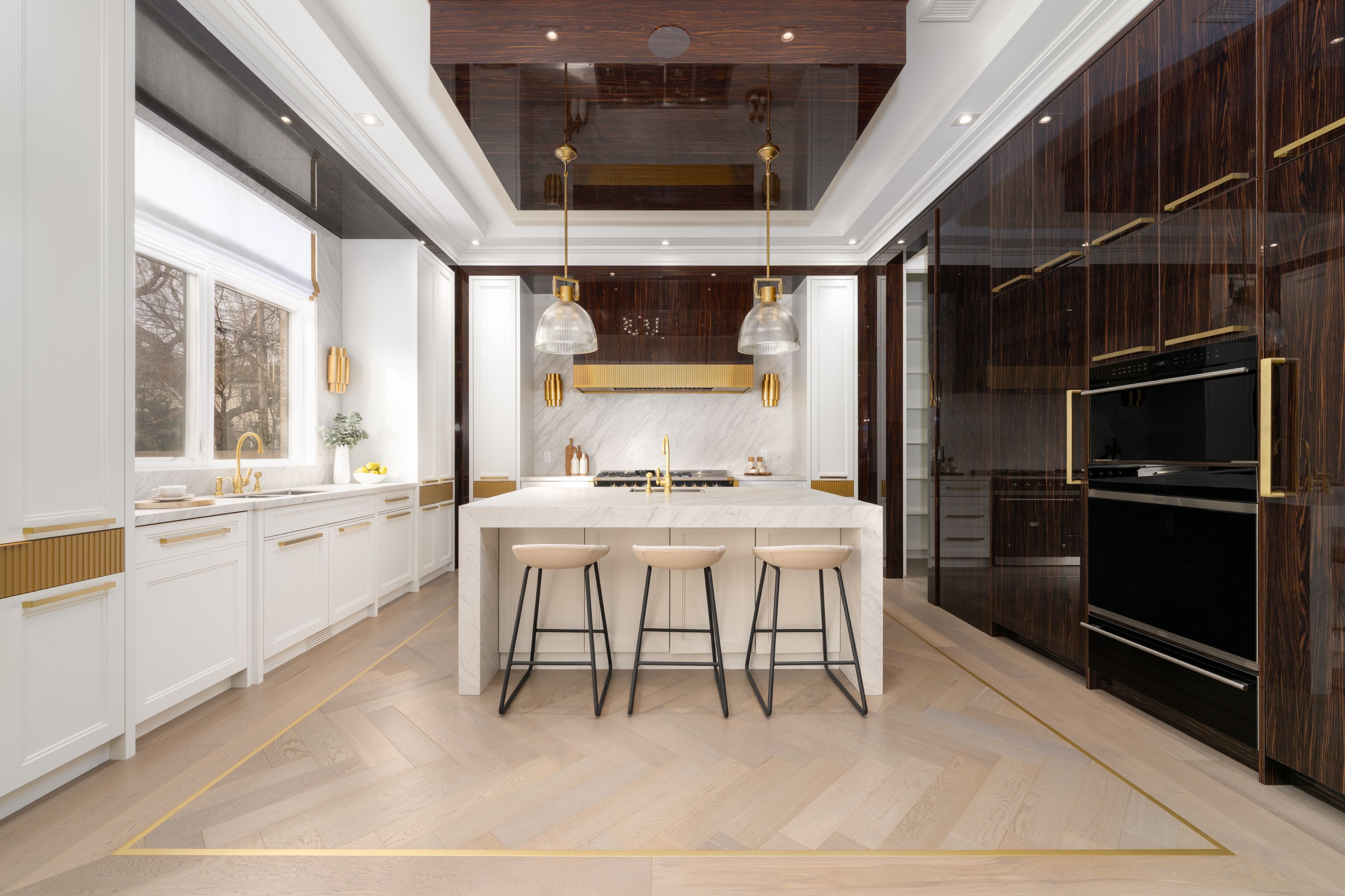 Neighbourhood of banbury only about 650 homes in this neighborhood, right next to the bridle path, considered one of toronto's premiere neighbourhoods. Welcome to 55 leacroft, showcasing a 5 bedroom 9 bathroom, multiple fireplaces throughout the home, pool, a cabana, wine cellar, a sauna, movie theatre, gym, courtyard, a library, and even your own elevator. 11 ft main, 11 upstairs. Entire house is automated. 8,800 square feet of living space 10,000 sq ft land area 62 feet pies out to 117 ft at the back. Roof is synthetic slate, downspouts, gutters, coated copper, not aluminum. Designed by a renowned toronto-based architectural firm created by lorne rose who has designed beautiful homes across the gta. Main floor with transitional entryway, dolomite marble in this really unique almost chevron like pattern, pairs well with the herringbone hardwood flooring throughout the house, elements of brass woven throughout the home. Kitchen featuring a huge pantry, 30 inch standing fridge and another 30 inch standing freezer, ebony coloured cabinets, bookmatch marble throughout including over the island, ribbed brass accents, metal coated accents, la canche stovetop, waterstone fixtures.