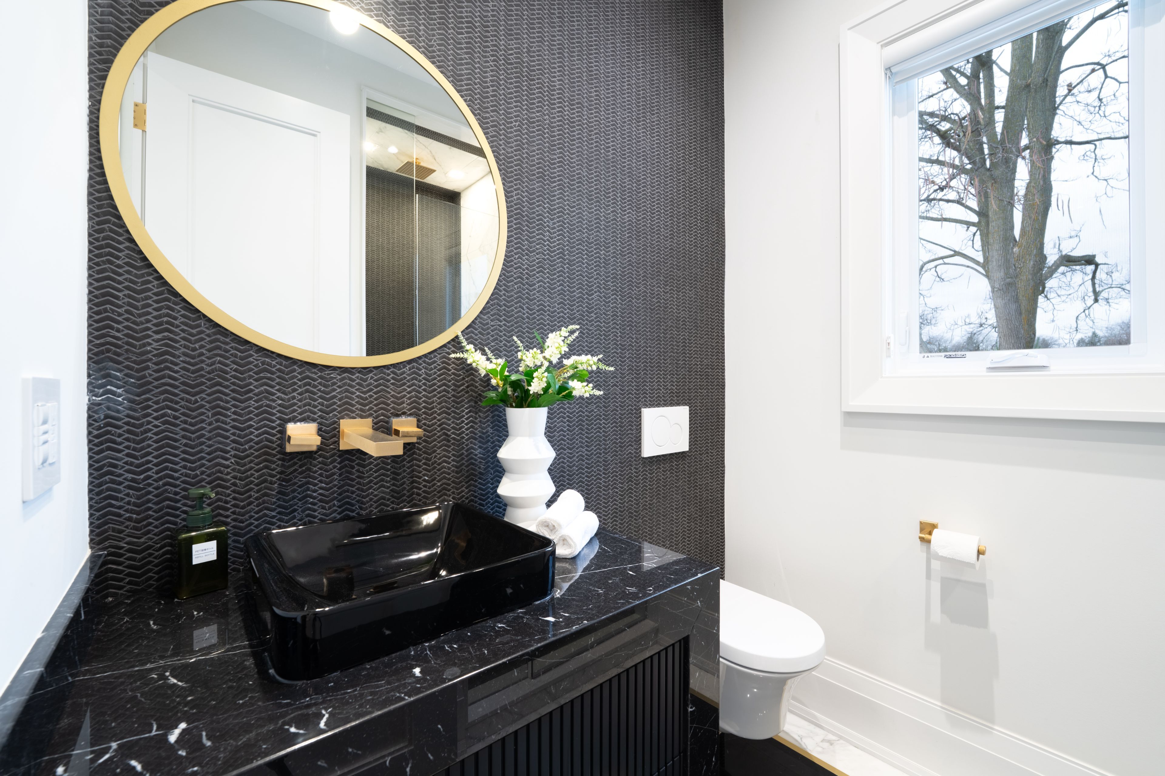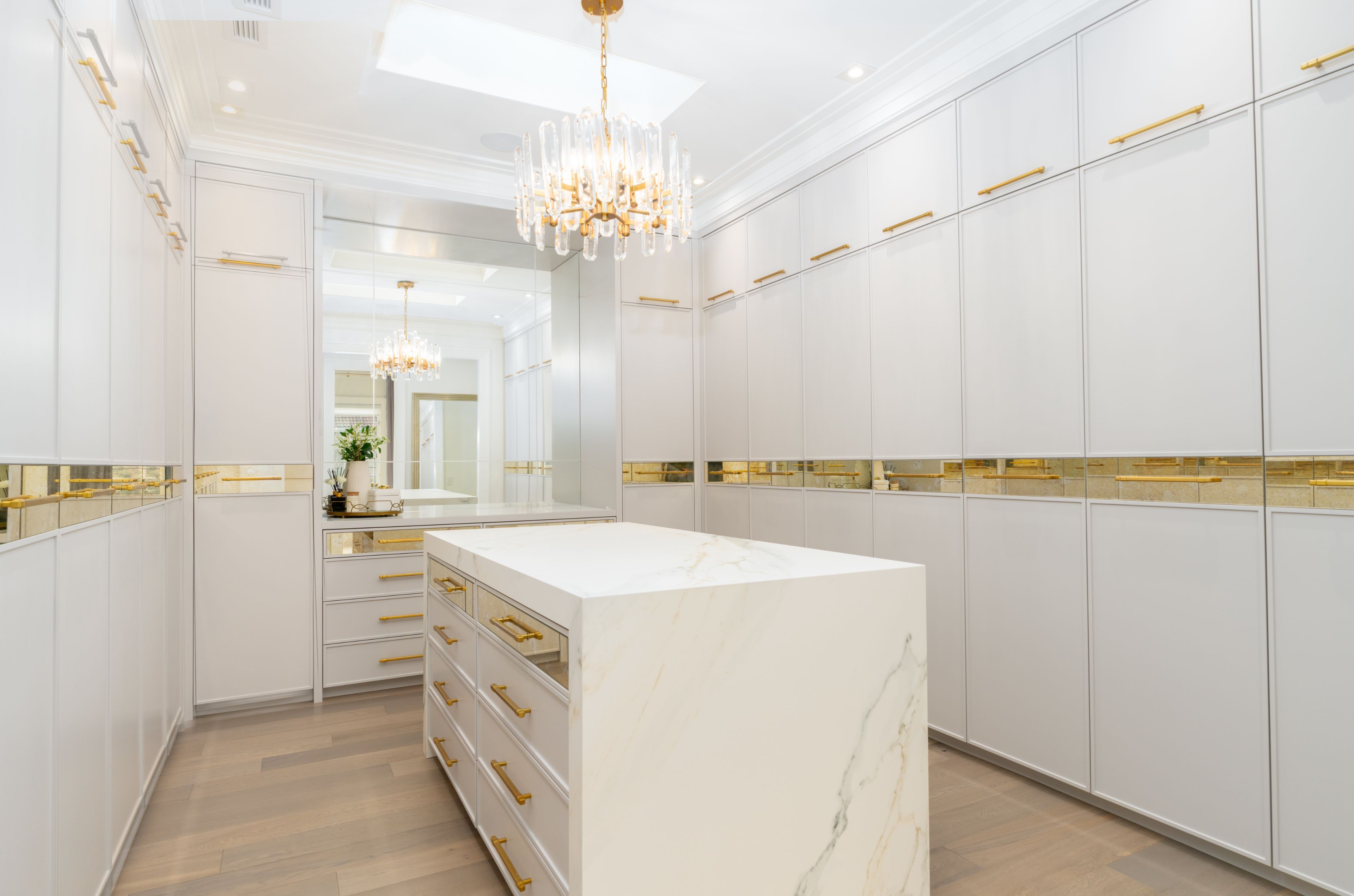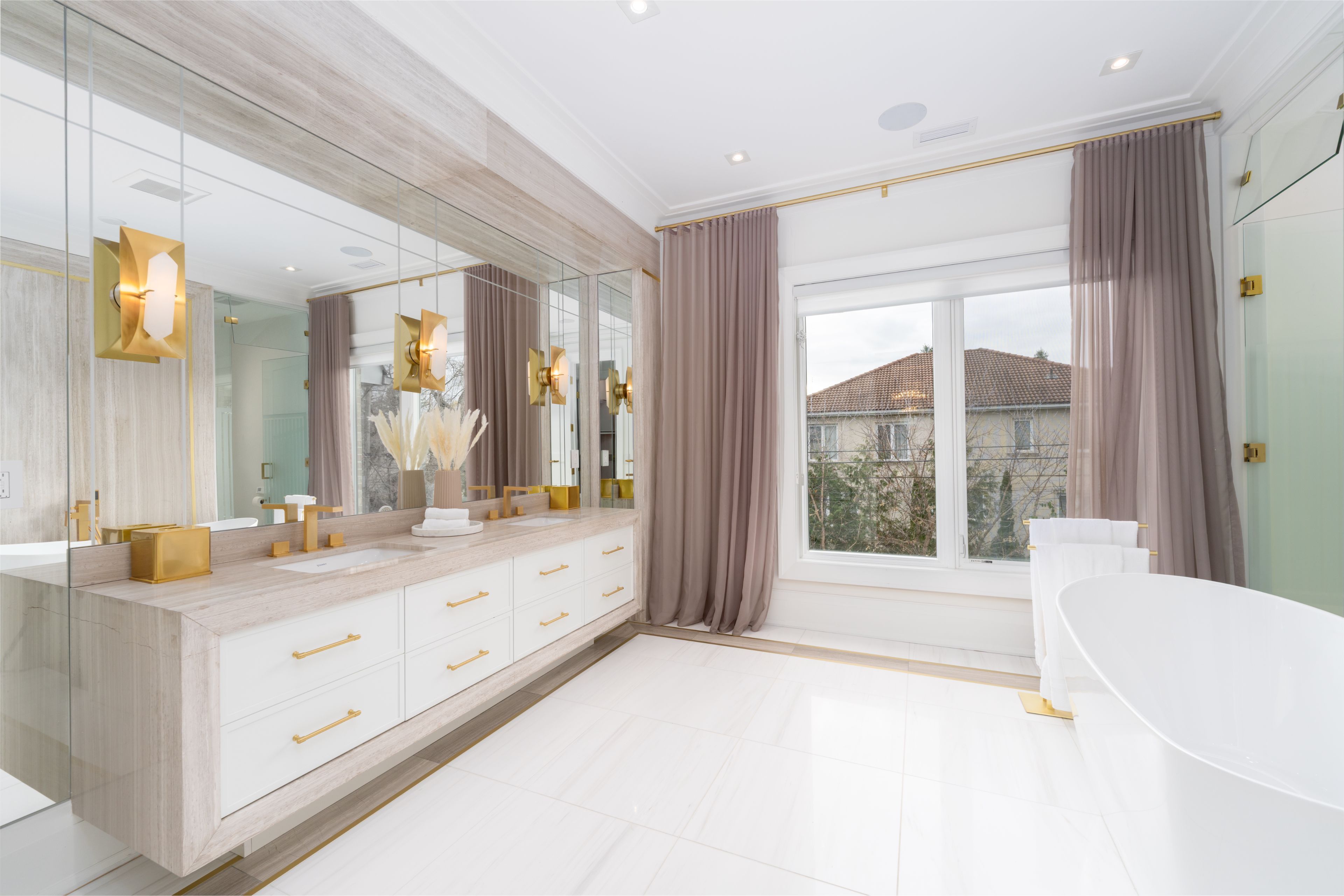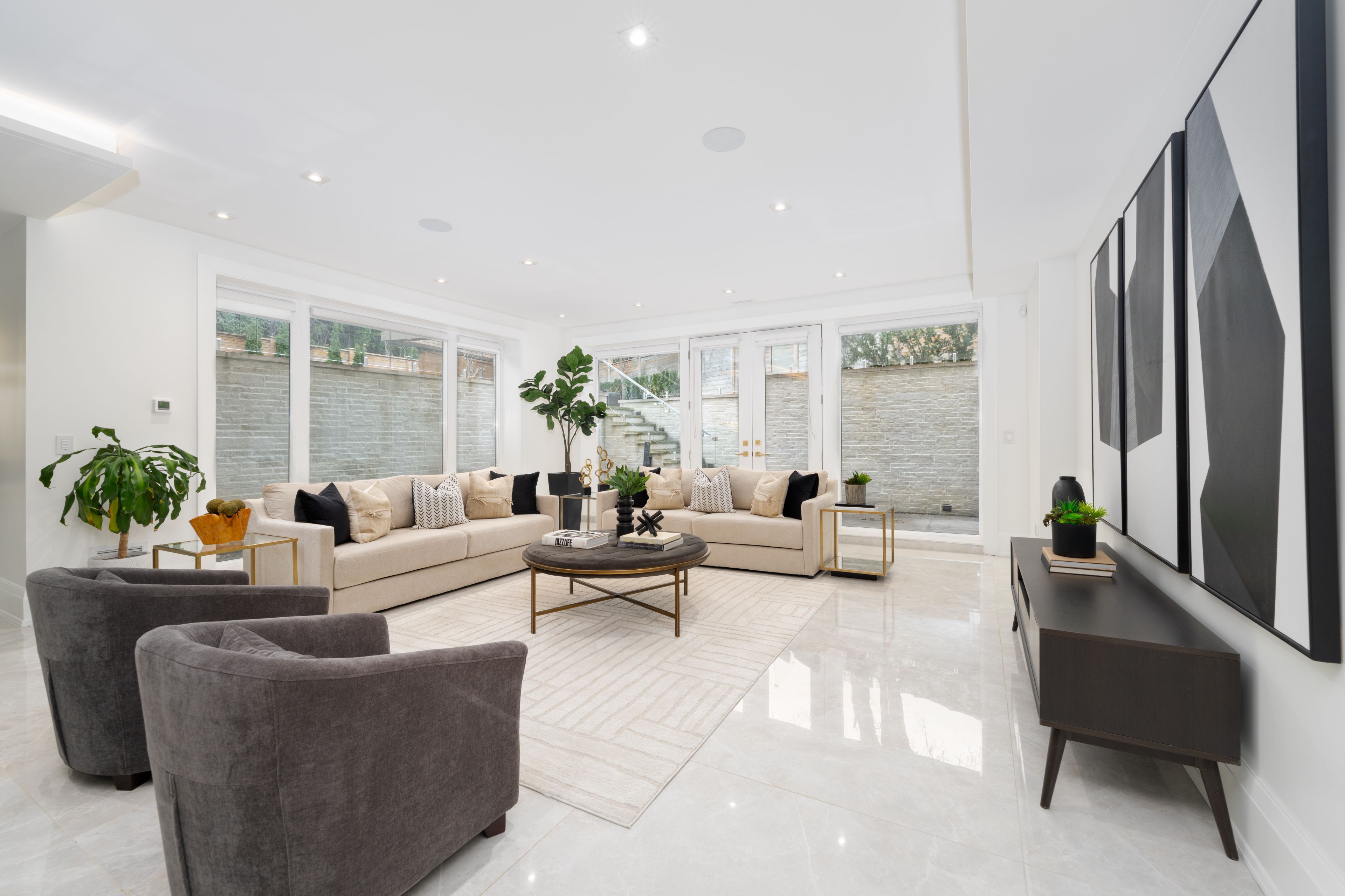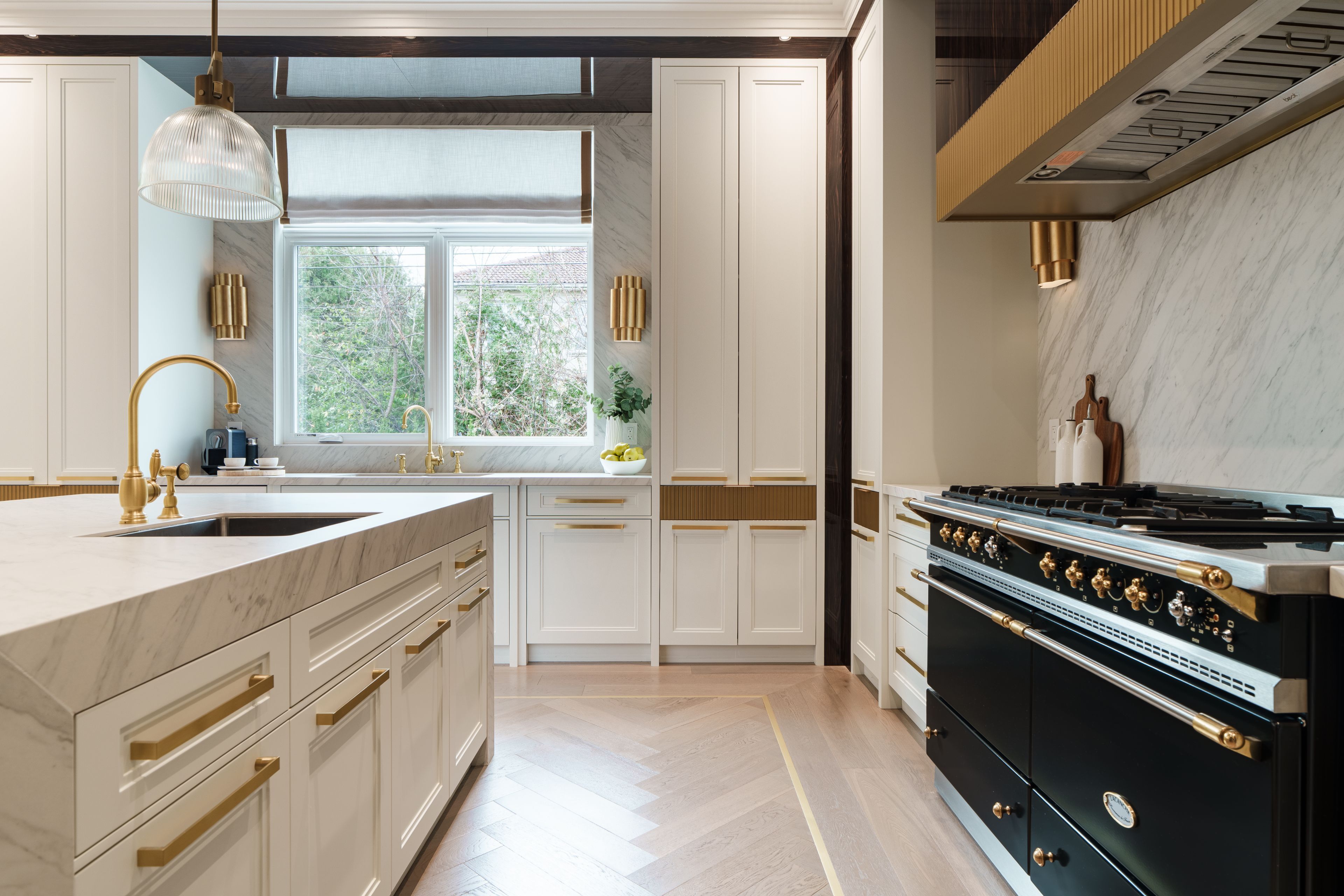 Neighbourhood of banbury only about 650 homes in this neighborhood, right next to the bridle path, considered one of toronto's premiere neighbourhoods. Welcome to 55 leacroft, showcasing a 5 bedroom 9 bathroom, multiple fireplaces throughout the home, pool, a cabana, wine cellar, a sauna, movie theatre, gym, courtyard, a library, and even your own elevator. 11 ft main, 11 upstairs. Entire house is automated. 8,800 square feet of living space 10,000 sq ft land area 62 feet pies out to 117 ft at the back. Roof is synthetic slate, downspouts, gutters, coated copper, not aluminum. Designed by a renowned toronto-based architectural firm created by lorne rose who has designed beautiful homes across the gta. Main floor with transitional entryway, dolomite marble in this really unique almost chevron like pattern, pairs well with the herringbone hardwood flooring throughout the house, elements of brass woven throughout the home. Kitchen featuring a huge pantry, 30 inch standing fridge and another 30 inch standing freezer, ebony coloured cabinets, bookmatch marble throughout including over the island, ribbed brass accents, metal coated accents, la canche stovetop, waterstone fixtures.