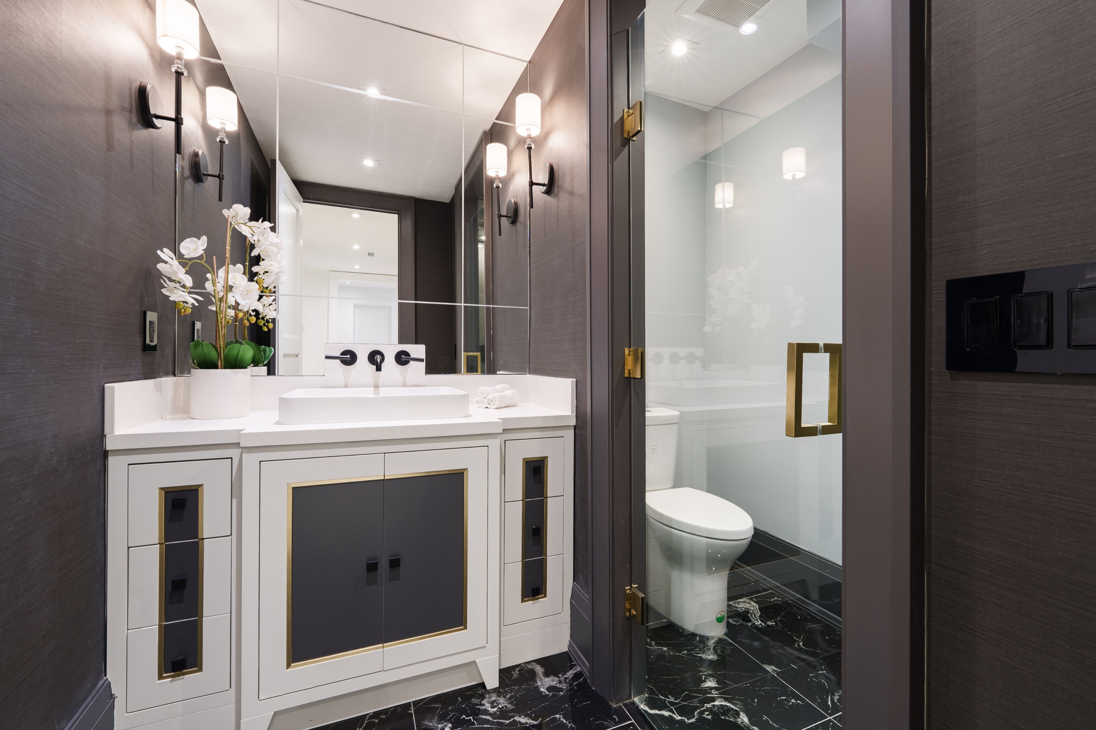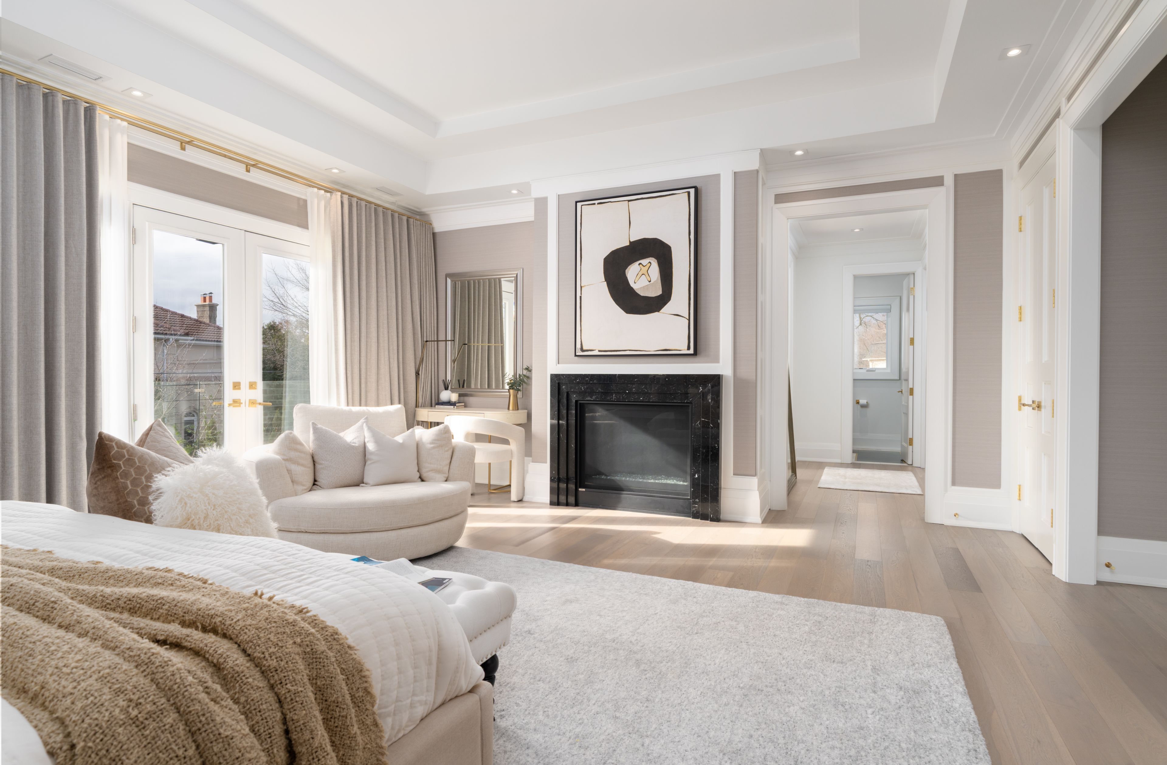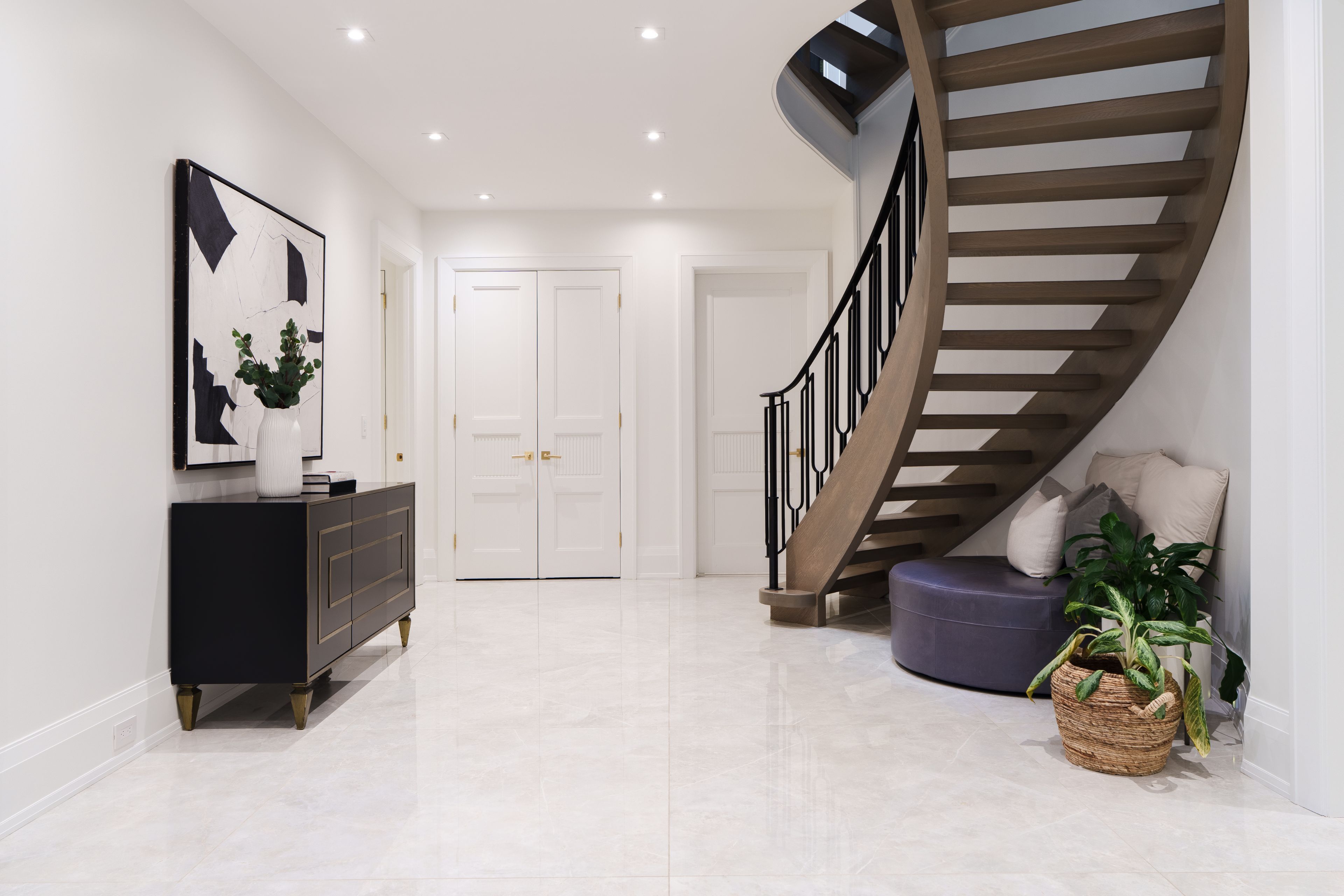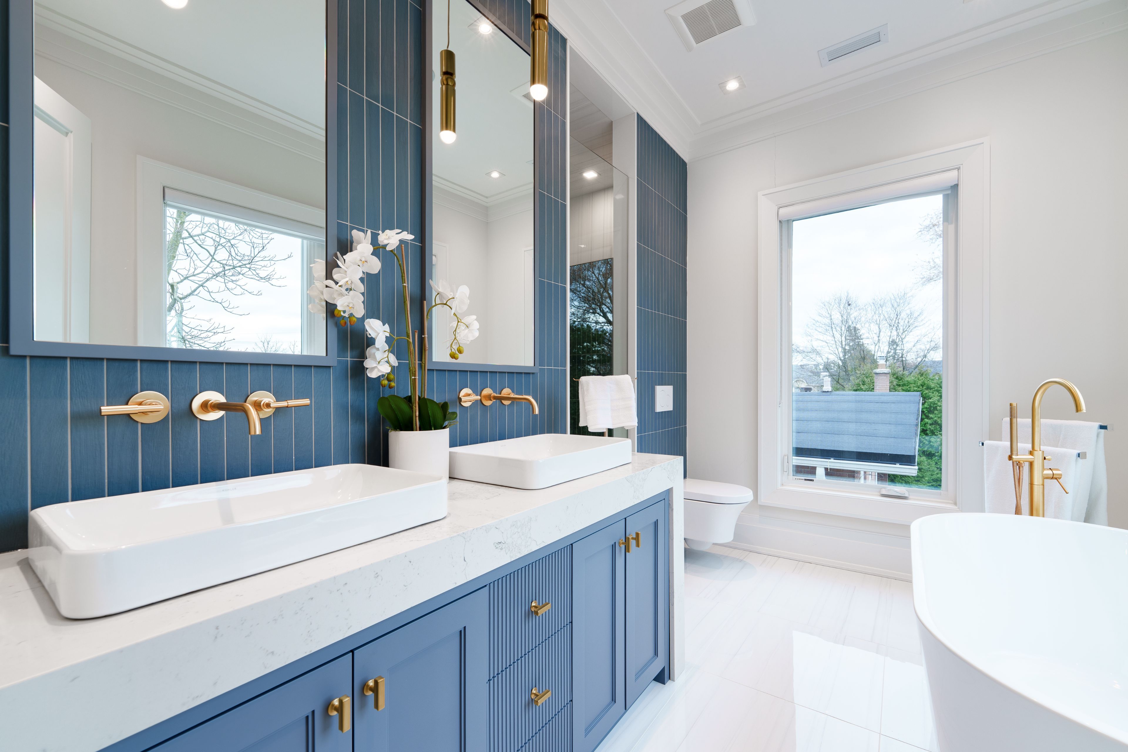 Neighbourhood of banbury only about 650 homes in this neighborhood, right next to the bridle path, considered one of toronto's premiere neighbourhoods. Welcome to 55 leacroft, showcasing a 5 bedroom 9 bathroom, multiple fireplaces throughout the home, pool, a cabana, wine cellar, a sauna, movie theatre, gym, courtyard, a library, and even your own elevator. 11 ft main, 11 upstairs. Entire house is automated. 8,800 square feet of living space 10,000 sq ft land area 62 feet pies out to 117 ft at the back. Roof is synthetic slate, downspouts, gutters, coated copper, not aluminum. Designed by a renowned toronto-based architectural firm created by lorne rose who has designed beautiful homes across the gta. Main floor with transitional entryway, dolomite marble in this really unique almost chevron like pattern, pairs well with the herringbone hardwood flooring throughout the house, elements of brass woven throughout the home. Kitchen featuring a huge pantry, 30 inch standing fridge and another 30 inch standing freezer, ebony coloured cabinets, bookmatch marble throughout including over the island, ribbed brass accents, metal coated accents, la canche stovetop, waterstone fixtures.