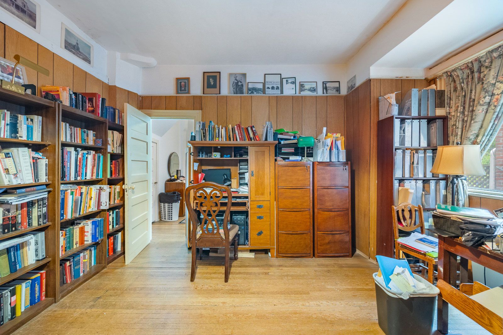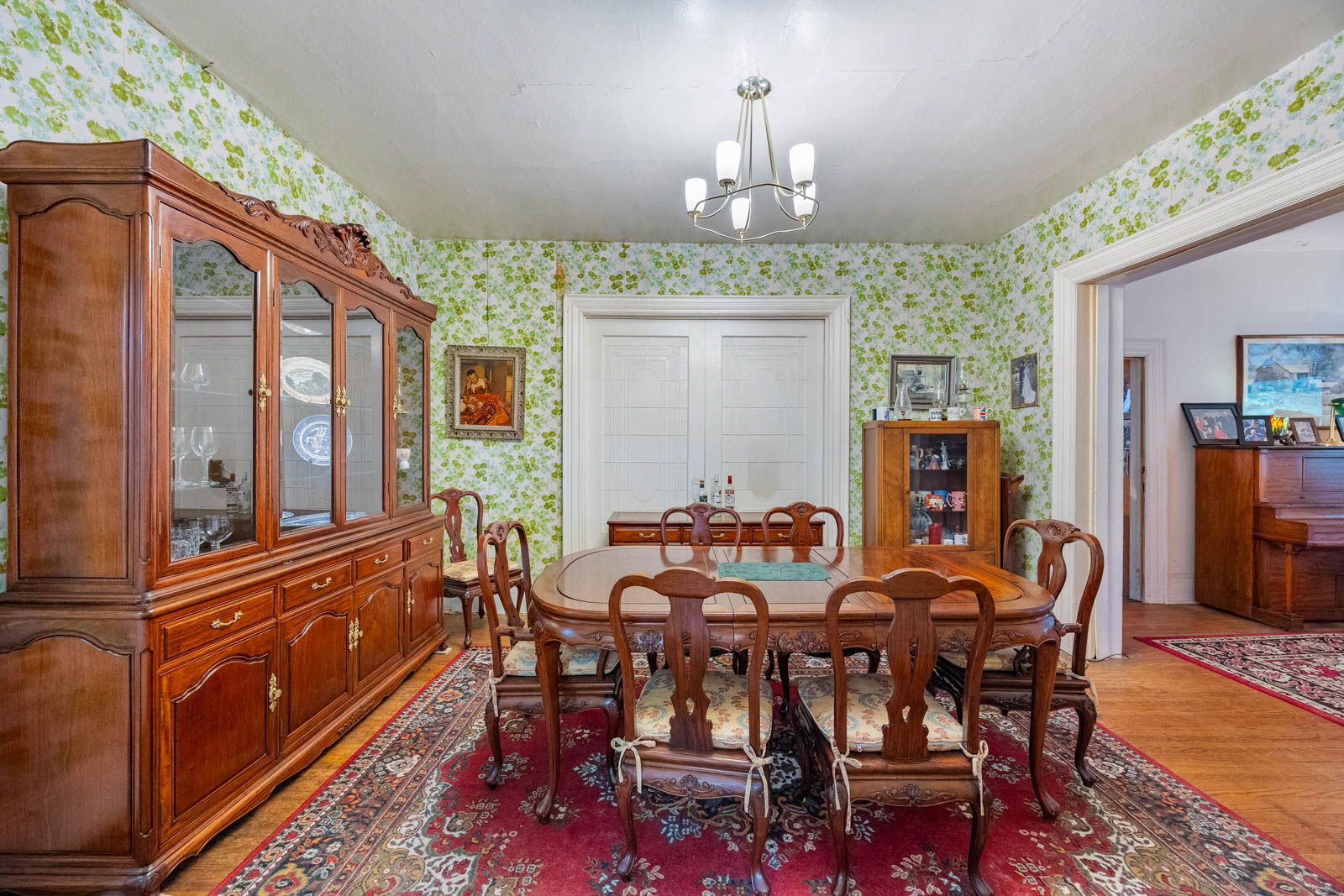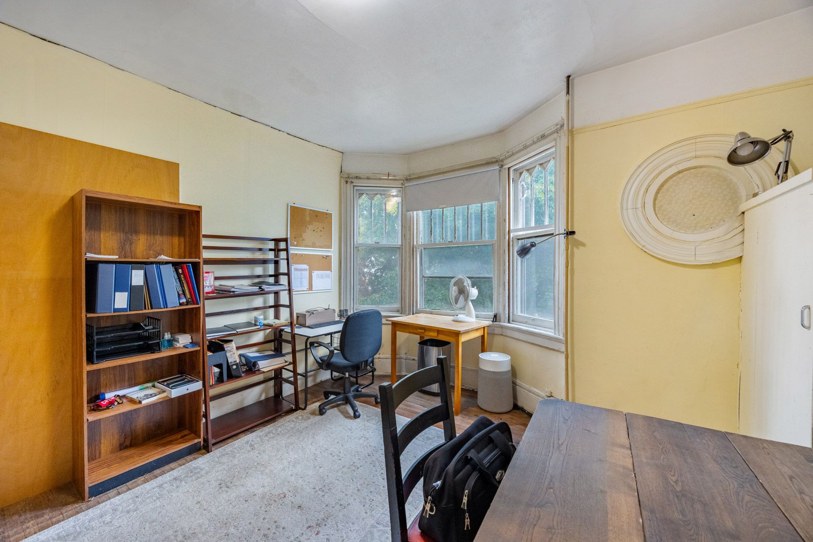 • Original features like stained glass and floating staircase await renovation.