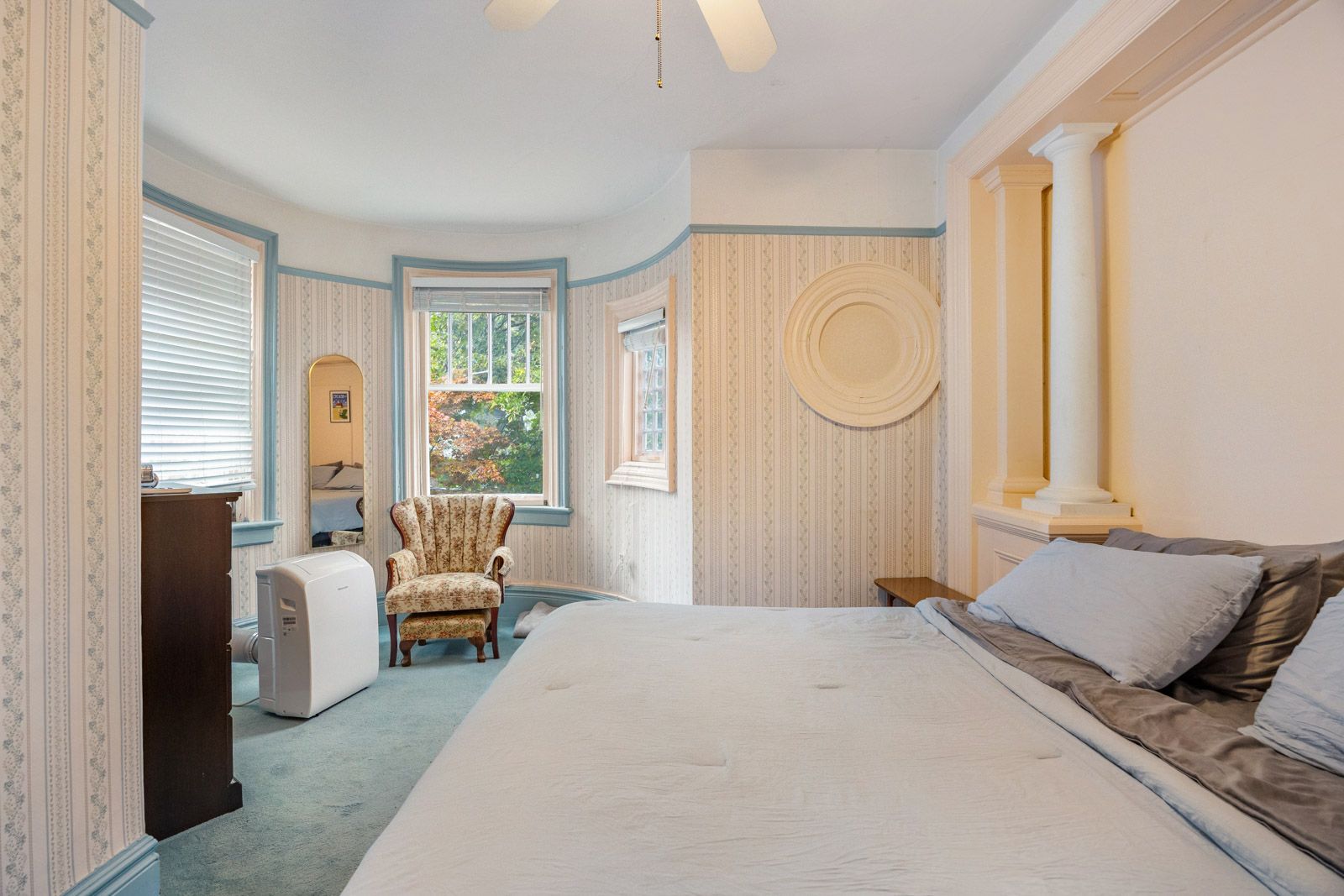 • Unique architecture featuring a grand porch and turret adds character.