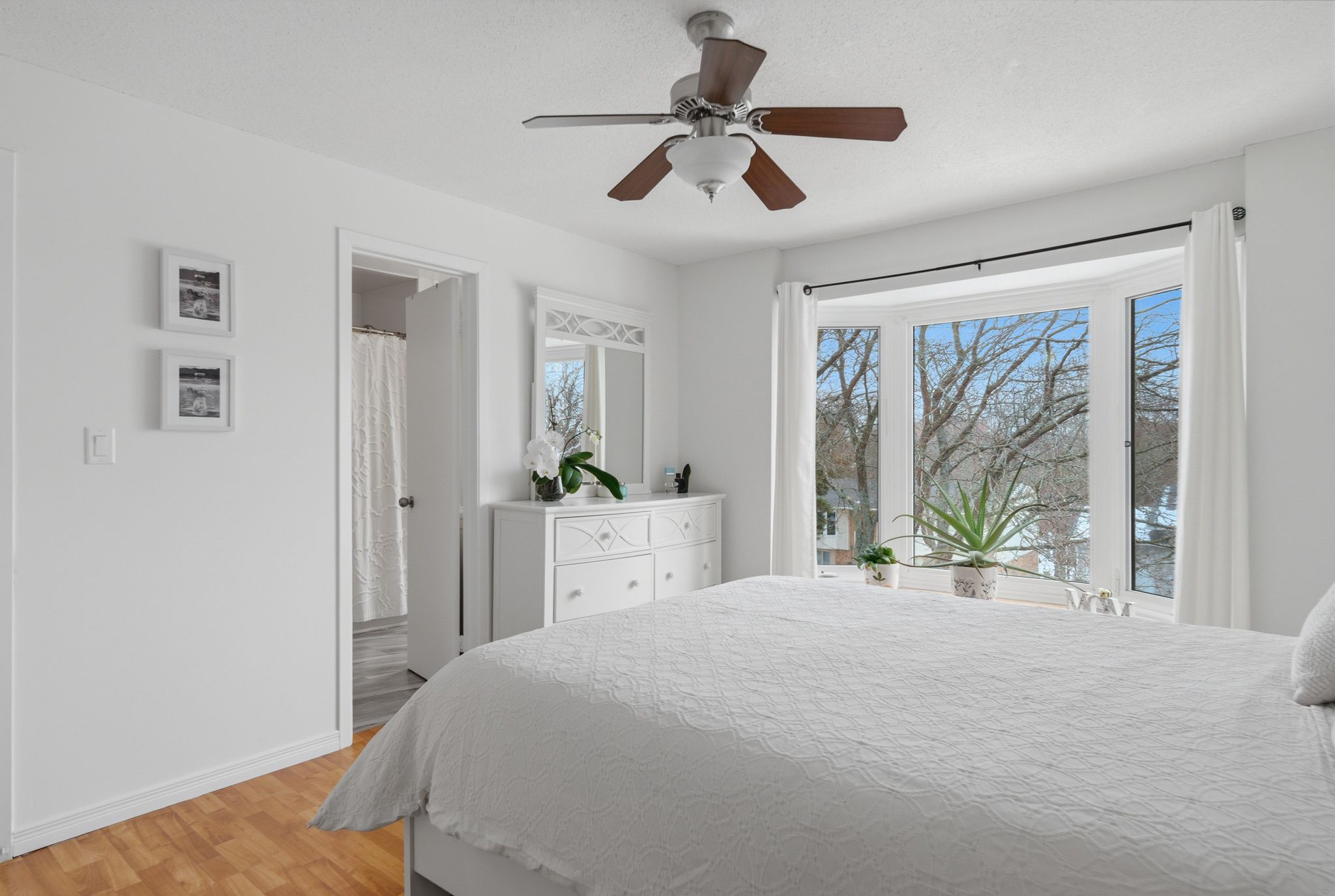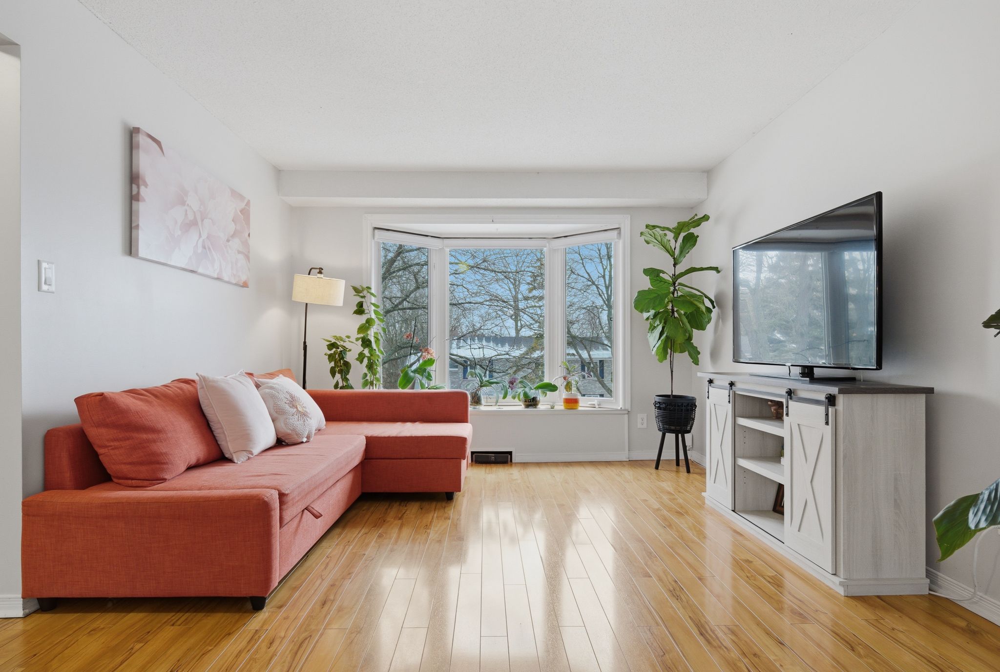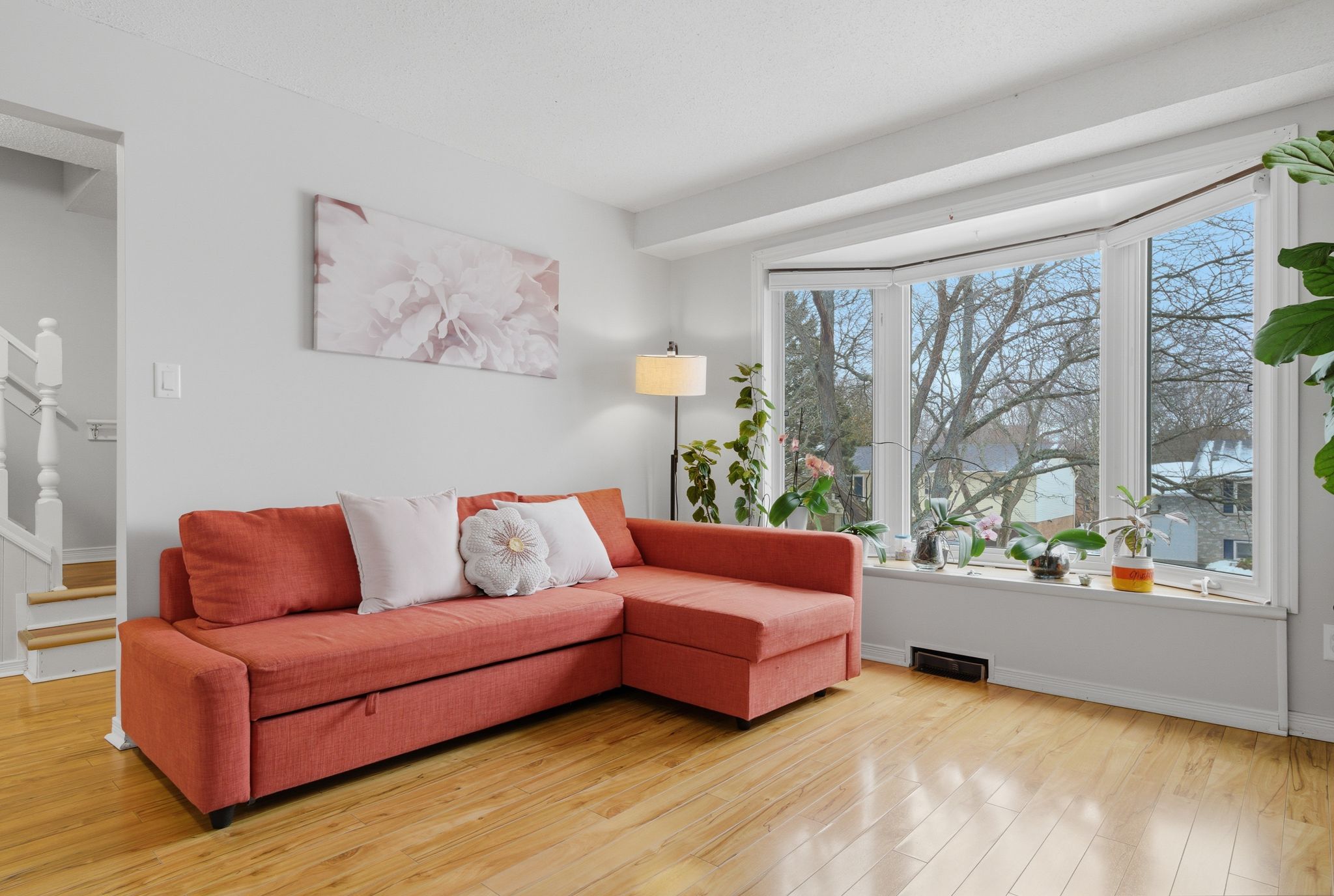 • Bright open-concept living area with large bay window and built-in ledge.