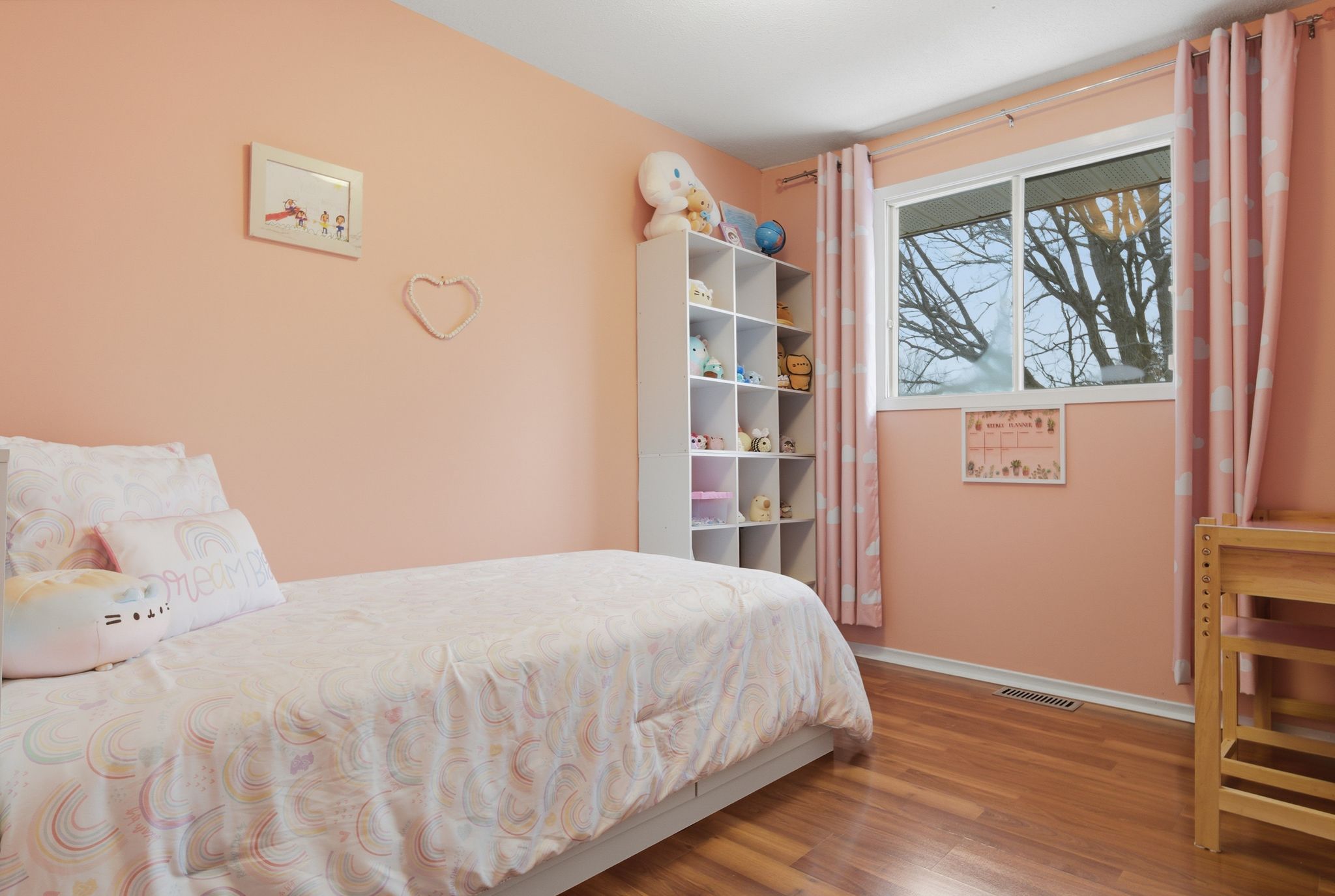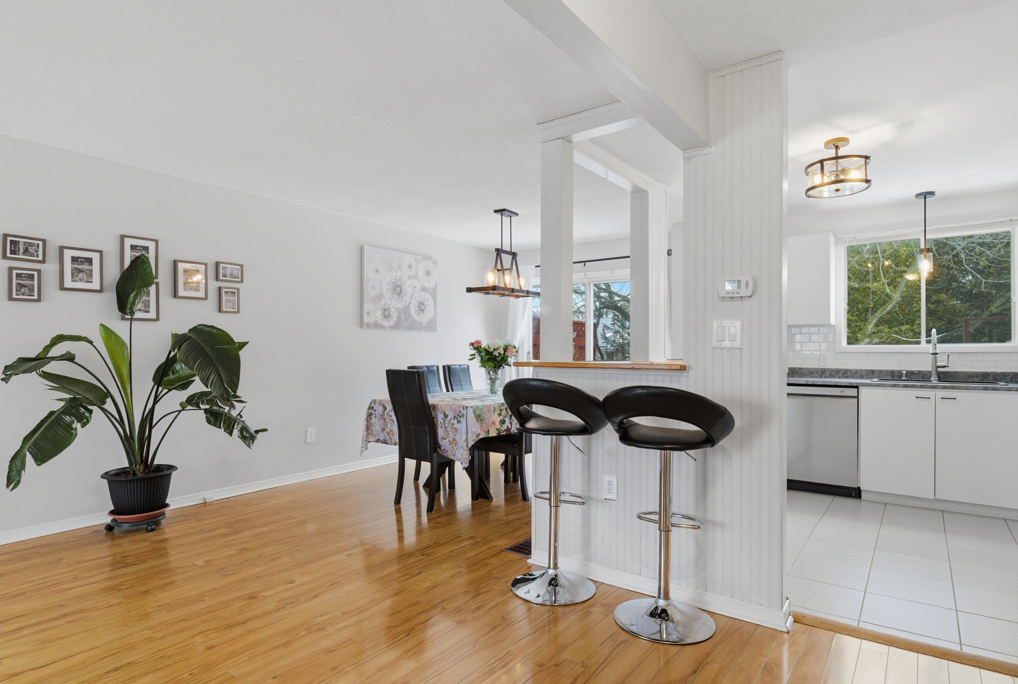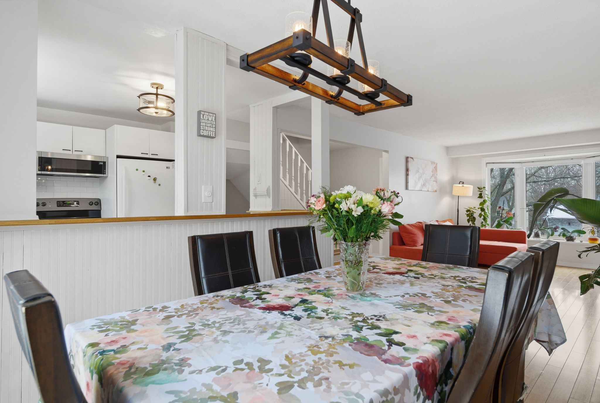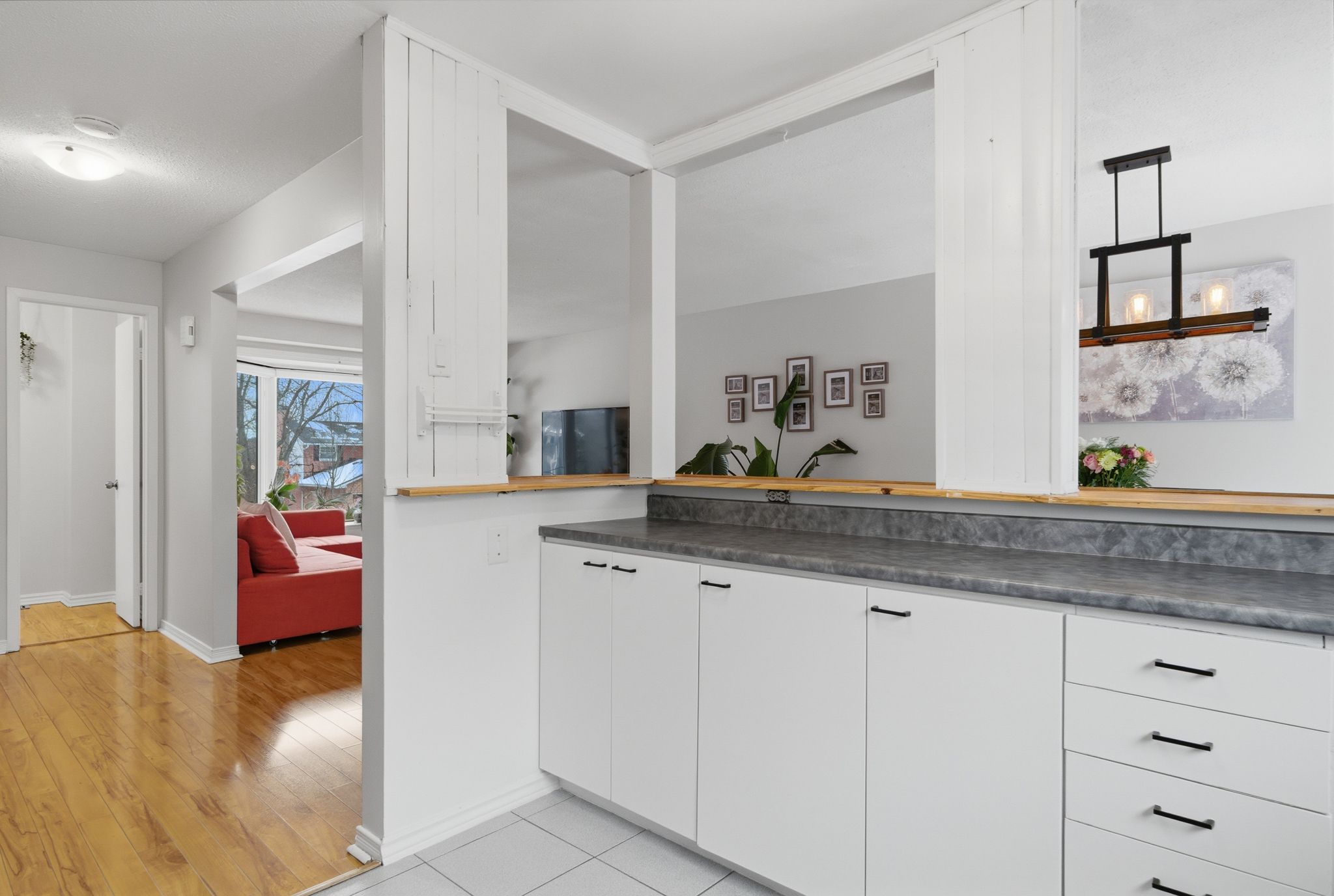 • Bright open-concept living area with large bay window and built-in ledge.