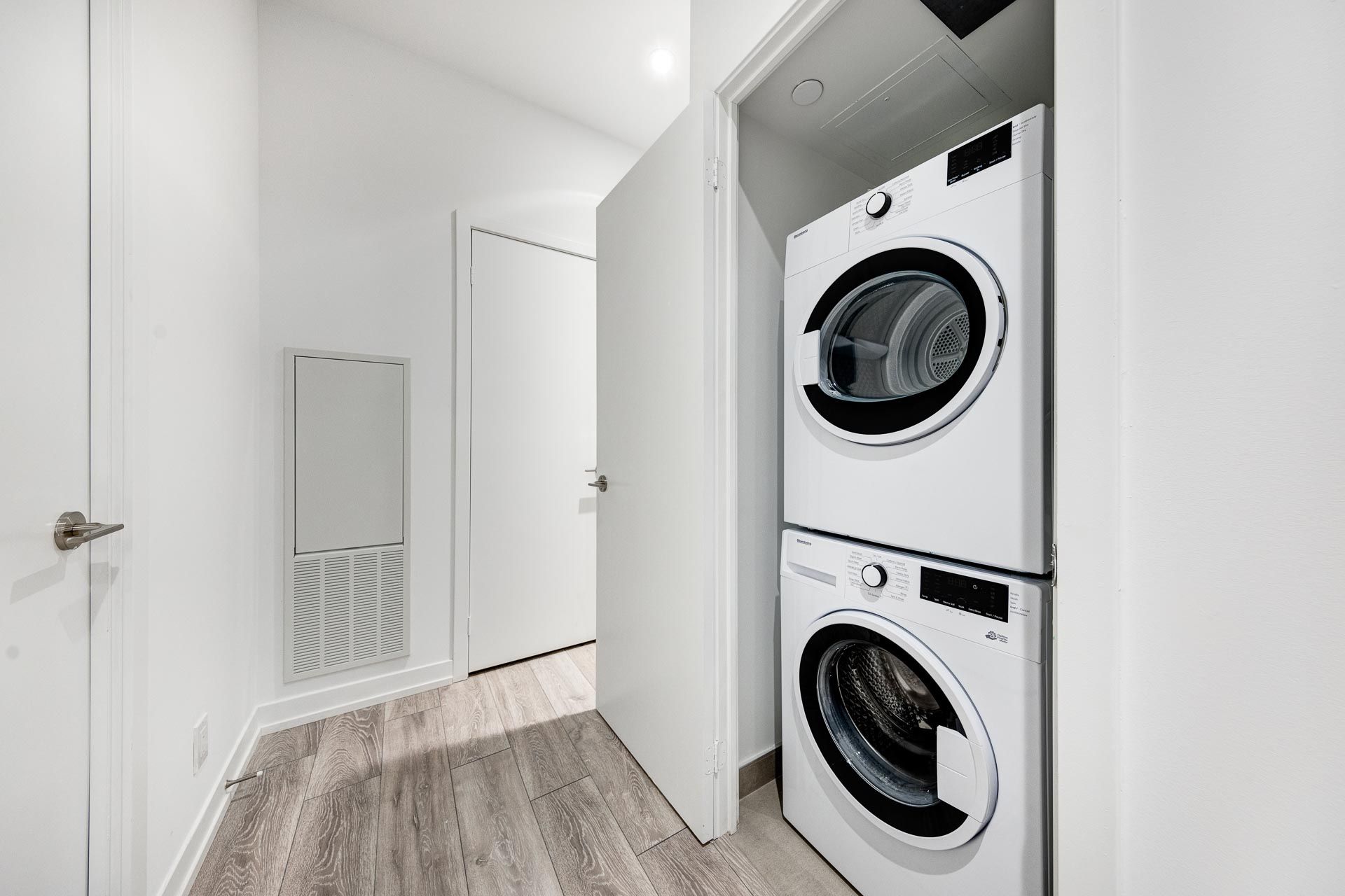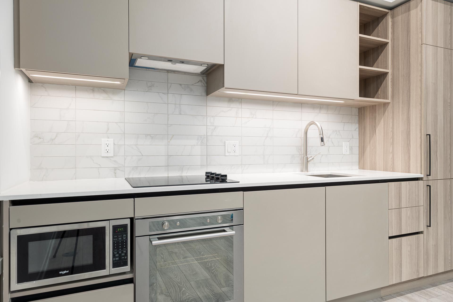 • Modern kitchen with built-in appliances and in-unit washer/dryer.