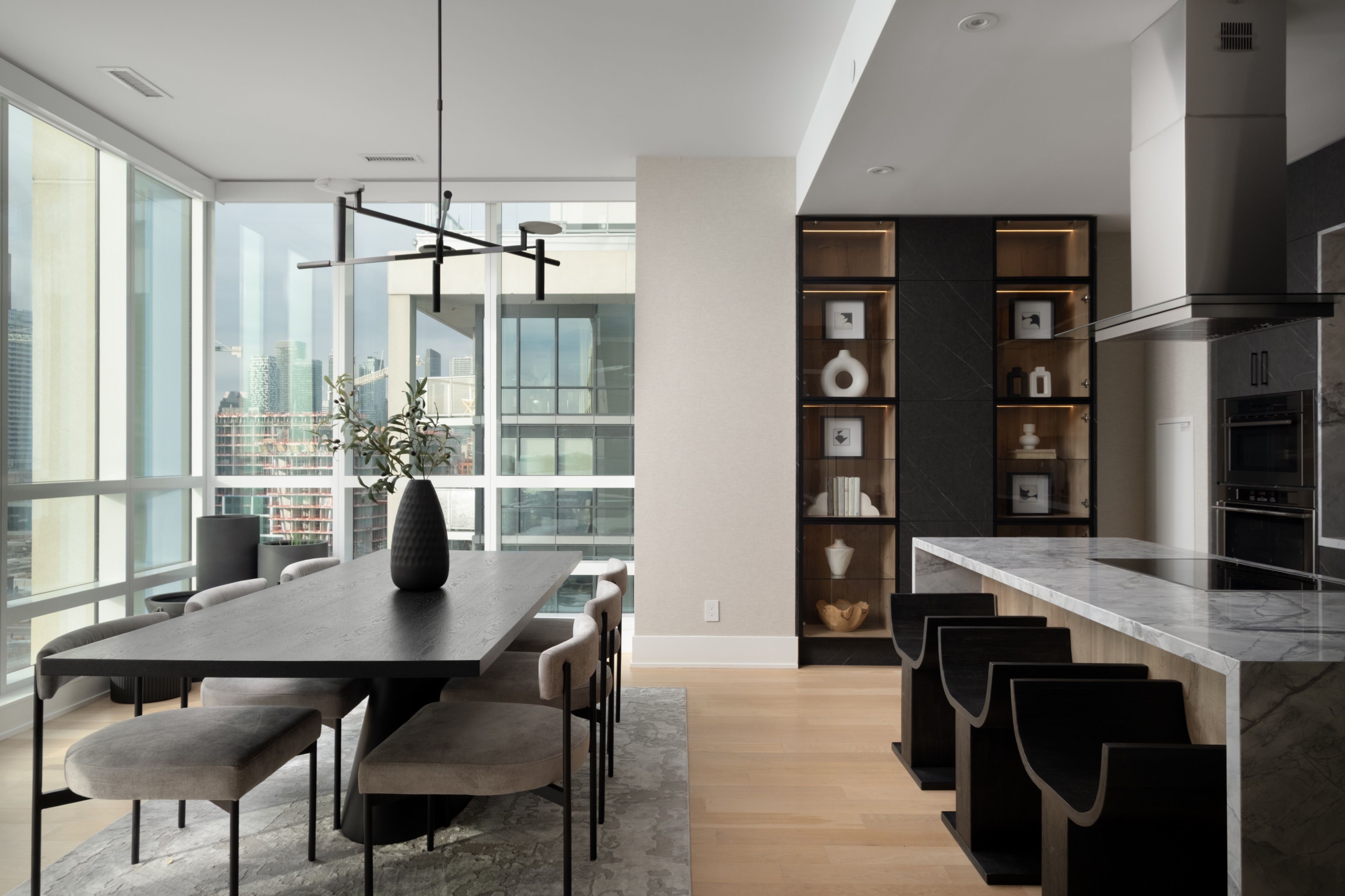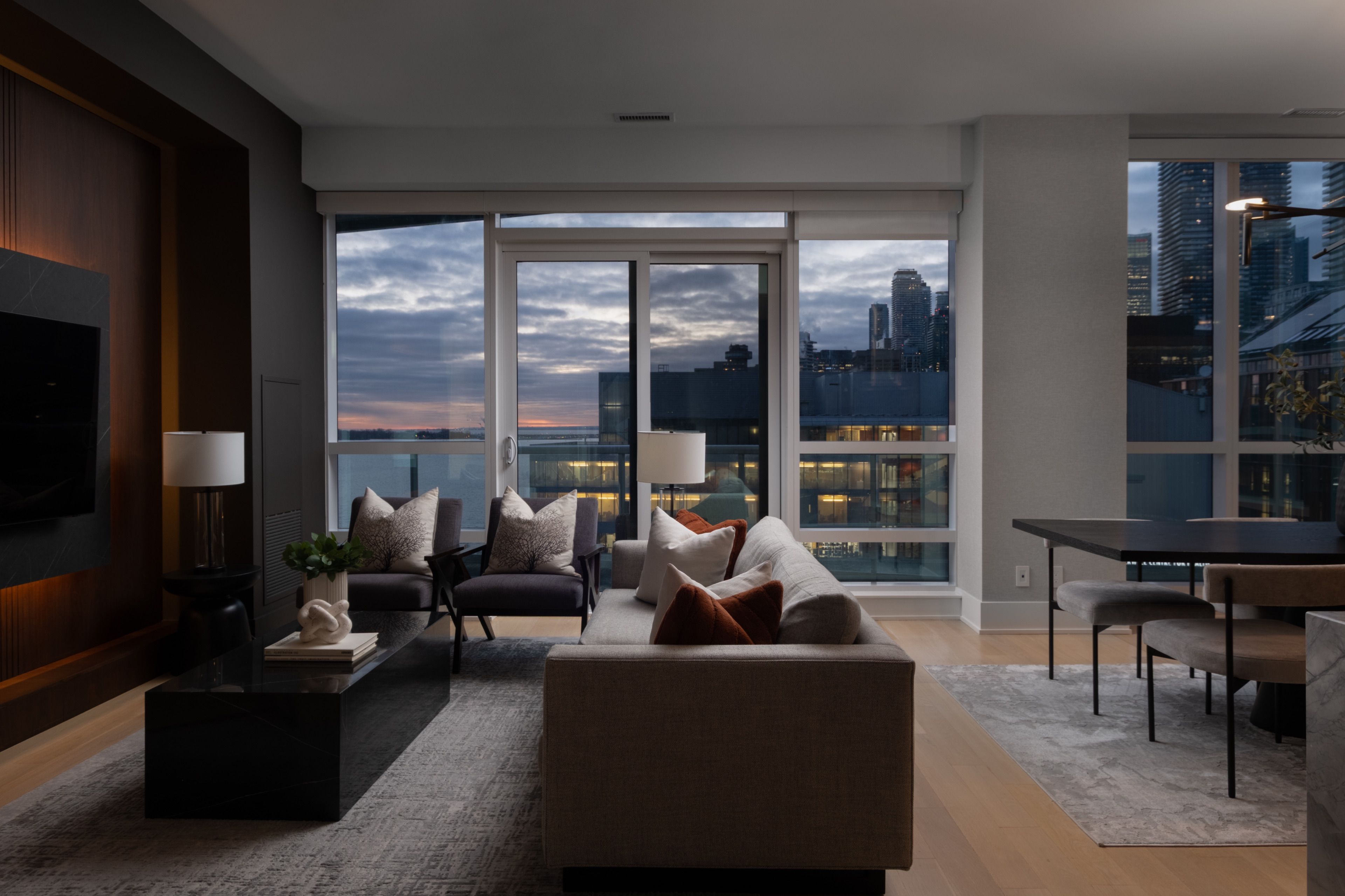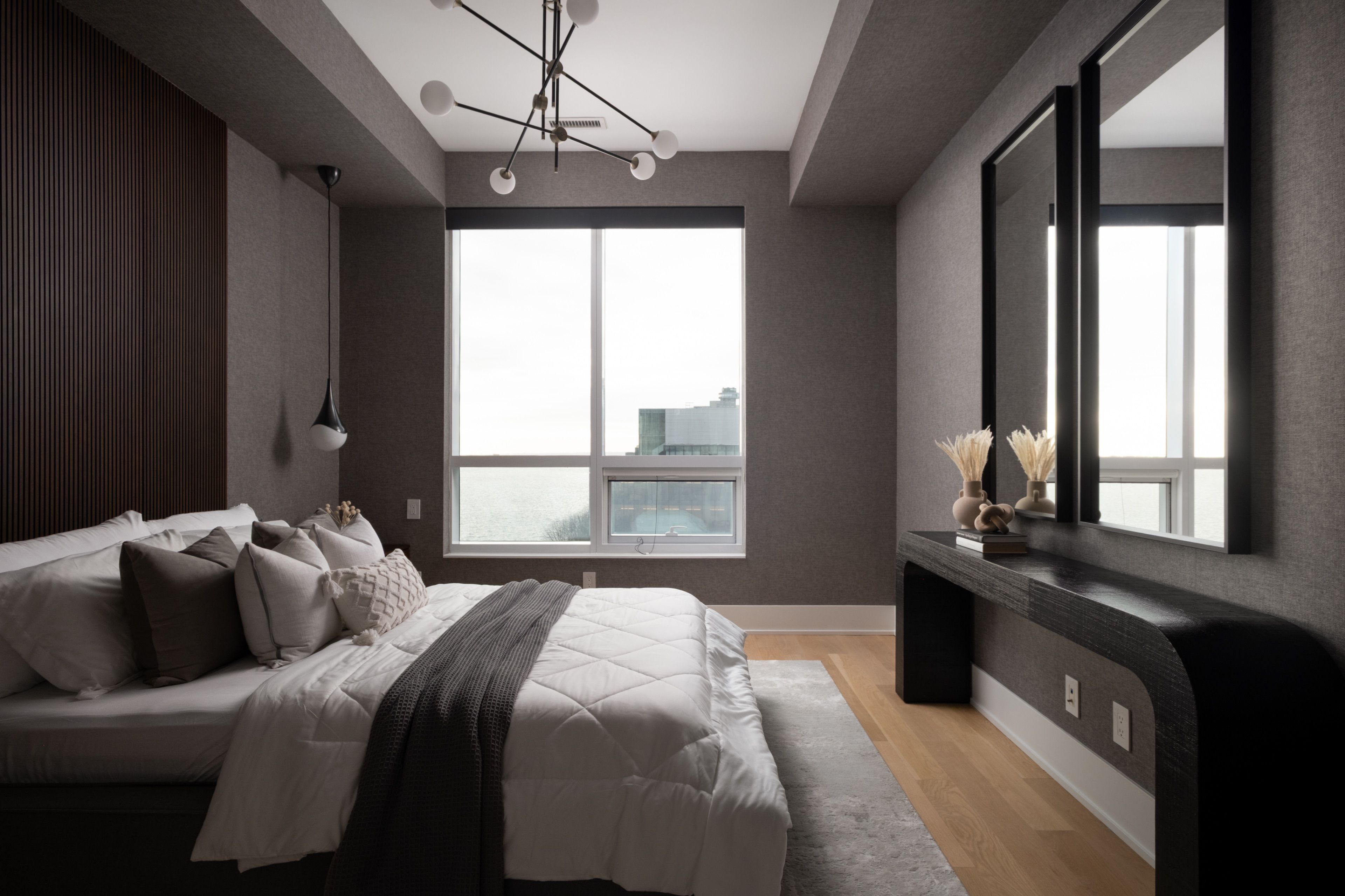 Welcome to 55 merchants' wharf, an exceptional waterfront residence where sophisticated design, bespoke finishes, and sweeping lake and city views define elevated downtown living. Thoughtfully curated throughout, this home offers a seamless blend of modern elegance and timeless craftsmanship. The expansive open-concept living space is anchored by a dramatic custom wood-slat feature wall with integrated ambient lighting and a sleek wall-mounted tv, creating an architectural focal point ideal for both refined entertaining and everyday living. Floor-to-ceiling windows bathe the interior in natural light and frame tranquil water views, while neutral tones, clean lines, and premium finishes create a calm, upscale atmosphere that flows effortlessly into the chef-inspired kitchen featuring a dramatic waterfall island, integrated appliances, bespoke cabinetry and striking architectural details that blend warmth with modern sophistication. The dining area is perfectly positioned beside expansive windows, offering an ever-changing urban and waterfront backdrop for memorable meals and gatherings. He primary bedroom is a serene, hotel-inspired retreat with floor-to-ceiling windows, wide-plank hardwood flooring, designer lighting and detailing. The spa-like ensuite offers a freestanding soaker tub, glass-enclosed rainfall shower, double vanity with stone countertops, and elegant wood and marble finishes. A generously sized second bedroom provides flexibility as a guest suite or executive home office complemented by a private ensuite with sleek modern finishes. Step onto the private balcony and enjoy unobstructed views of lake ontario-perfect for morning coffee or sunset relaxation. Ideally located steps from the waterfront boardwalk and minutes from the financial district, st. Lawrence market, and toronto's premier dining and cultural destinations, this residence delivers a rare opportunity for luxury waterfront living in one of the city's most sought-after addresses.