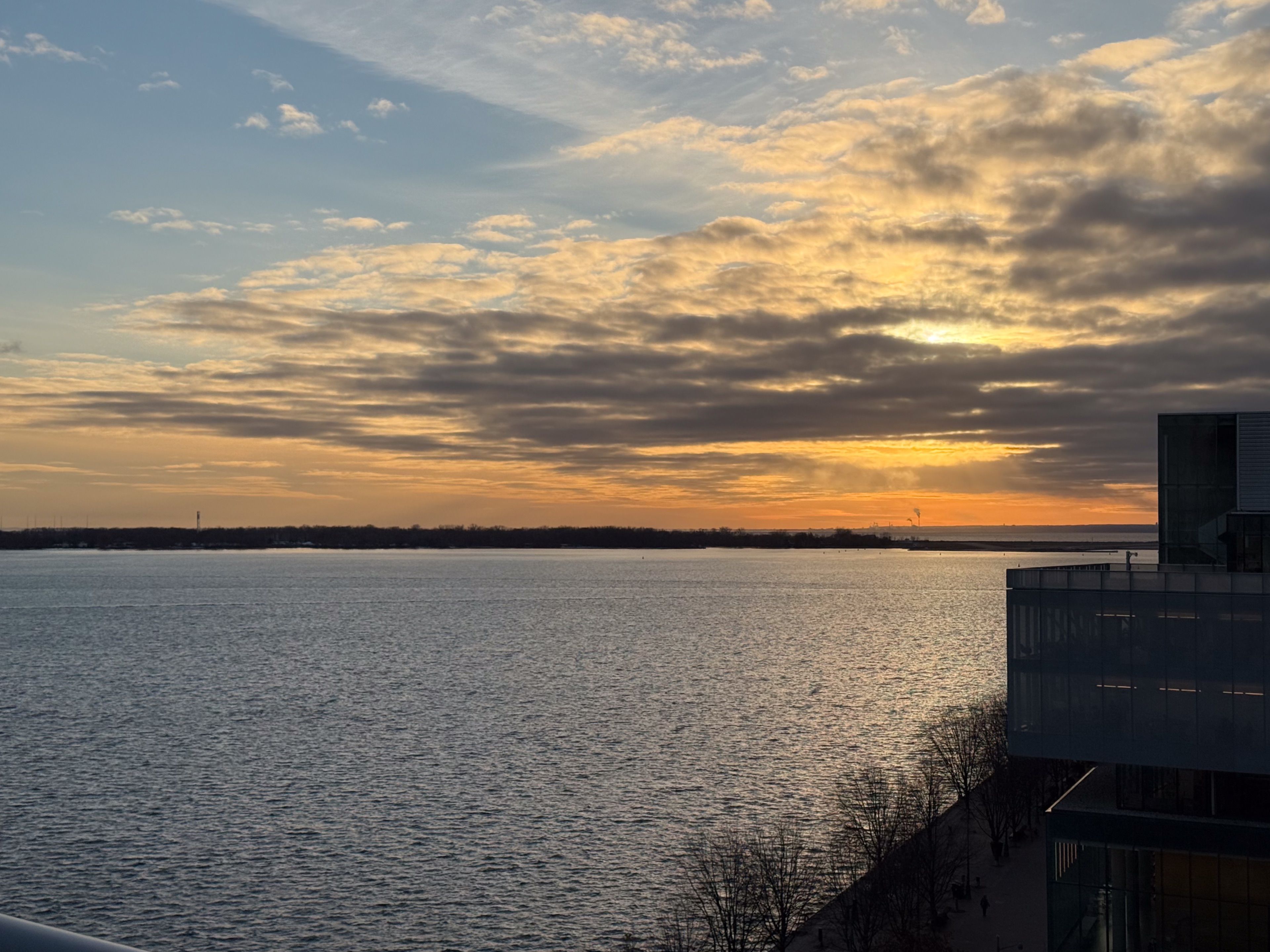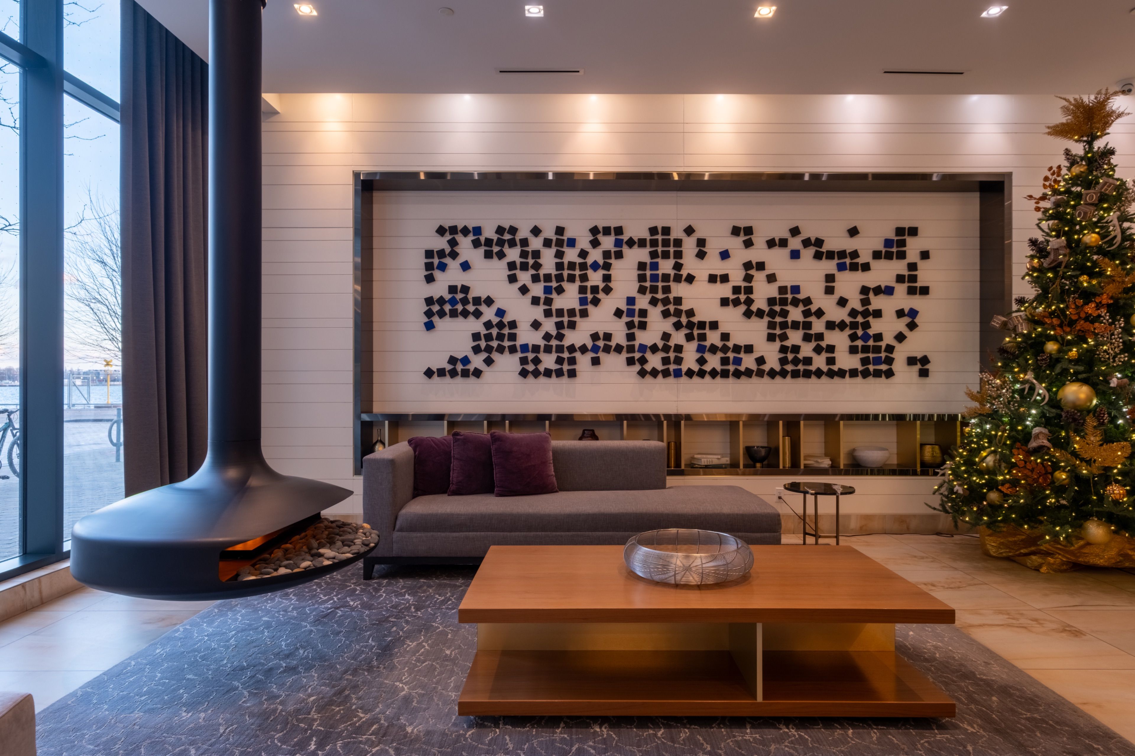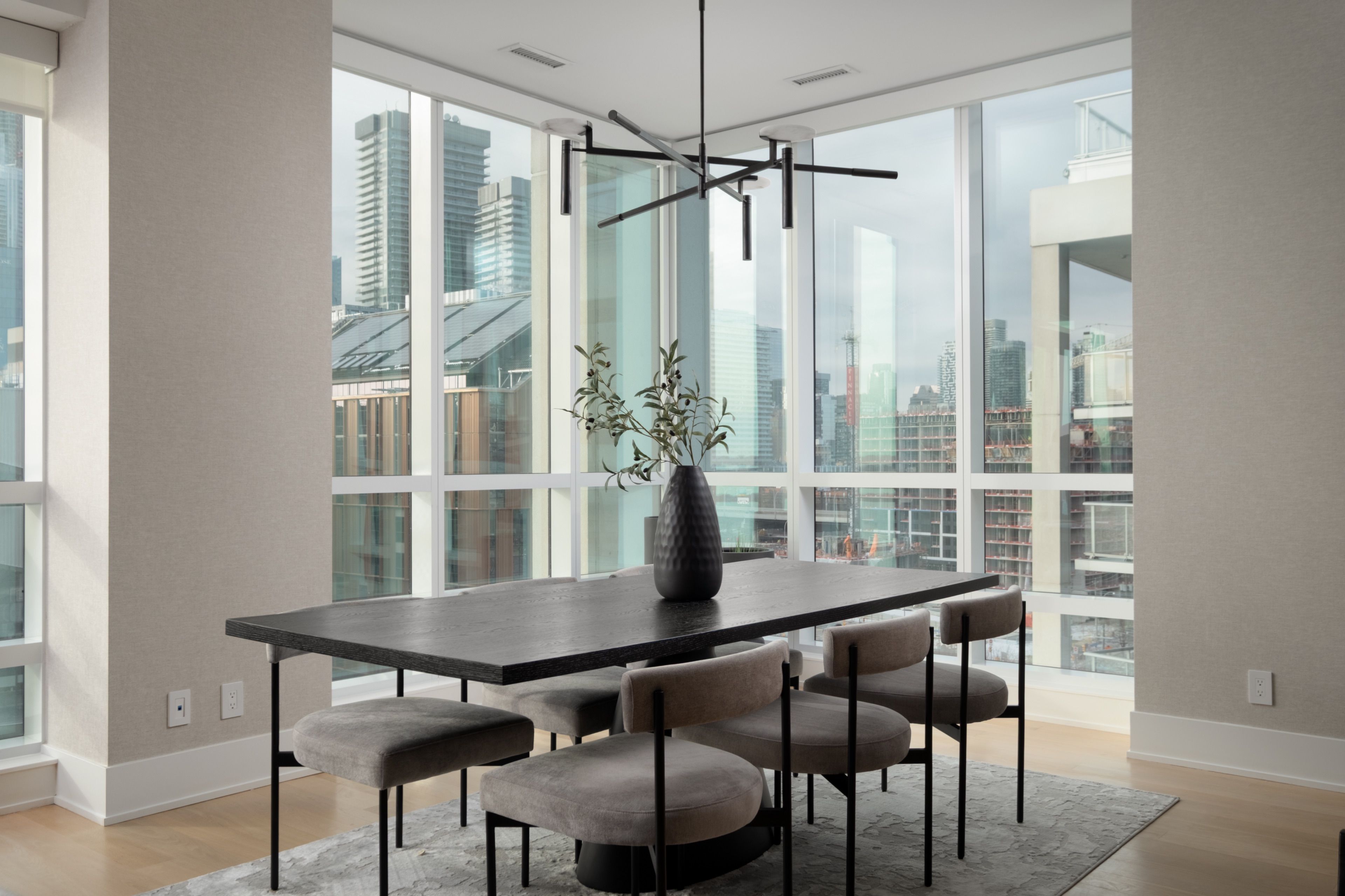 Welcome to 55 merchants' wharf, an exceptional waterfront residence where sophisticated design, bespoke finishes, and sweeping lake and city views define elevated downtown living. Thoughtfully curated throughout, this home offers a seamless blend of modern elegance and timeless craftsmanship. The expansive open-concept living space is anchored by a dramatic custom wood-slat feature wall with integrated ambient lighting and a sleek wall-mounted tv, creating an architectural focal point ideal for both refined entertaining and everyday living. Floor-to-ceiling windows bathe the interior in natural light and frame tranquil water views, while neutral tones, clean lines, and premium finishes create a calm, upscale atmosphere that flows effortlessly into the chef-inspired kitchen featuring a dramatic waterfall island, integrated appliances, bespoke cabinetry and striking architectural details that blend warmth with modern sophistication. The dining area is perfectly positioned beside expansive windows, offering an ever-changing urban and waterfront backdrop for memorable meals and gatherings. He primary bedroom is a serene, hotel-inspired retreat with floor-to-ceiling windows, wide-plank hardwood flooring, designer lighting and detailing. The spa-like ensuite offers a freestanding soaker tub, glass-enclosed rainfall shower, double vanity with stone countertops, and elegant wood and marble finishes. A generously sized second bedroom provides flexibility as a guest suite or executive home office complemented by a private ensuite with sleek modern finishes. Step onto the private balcony and enjoy unobstructed views of lake ontario-perfect for morning coffee or sunset relaxation. Ideally located steps from the waterfront boardwalk and minutes from the financial district, st. Lawrence market, and toronto's premier dining and cultural destinations, this residence delivers a rare opportunity for luxury waterfront living in one of the city's most sought-after addresses.