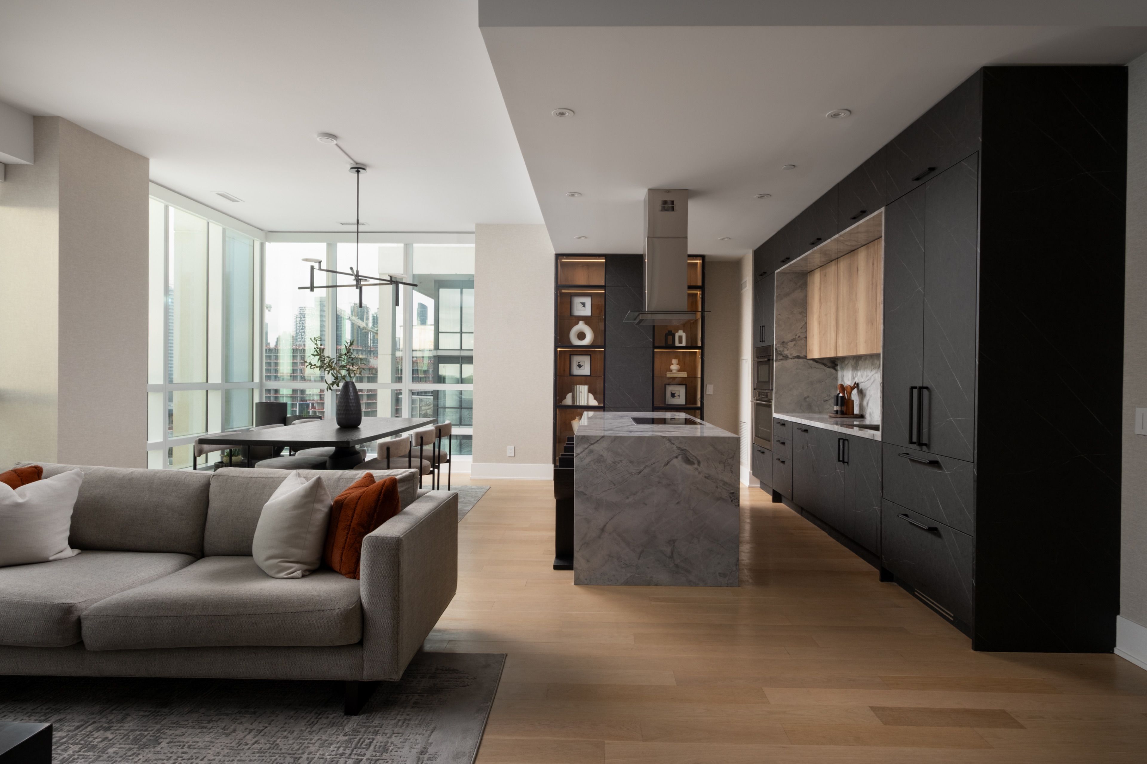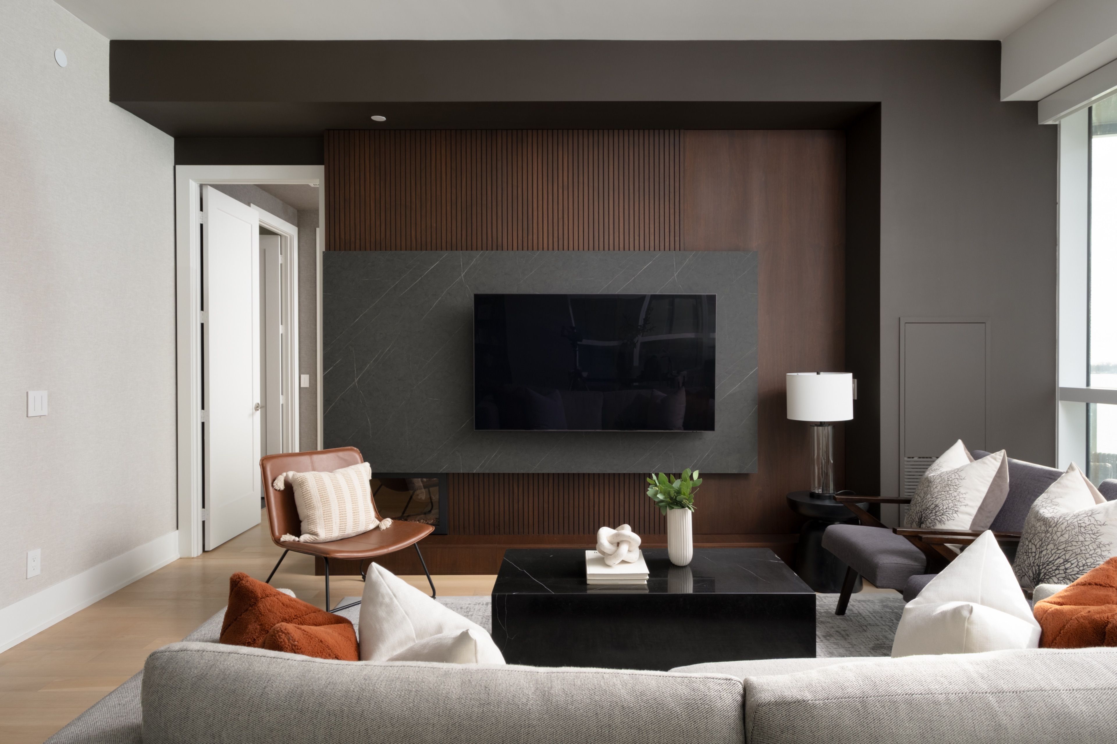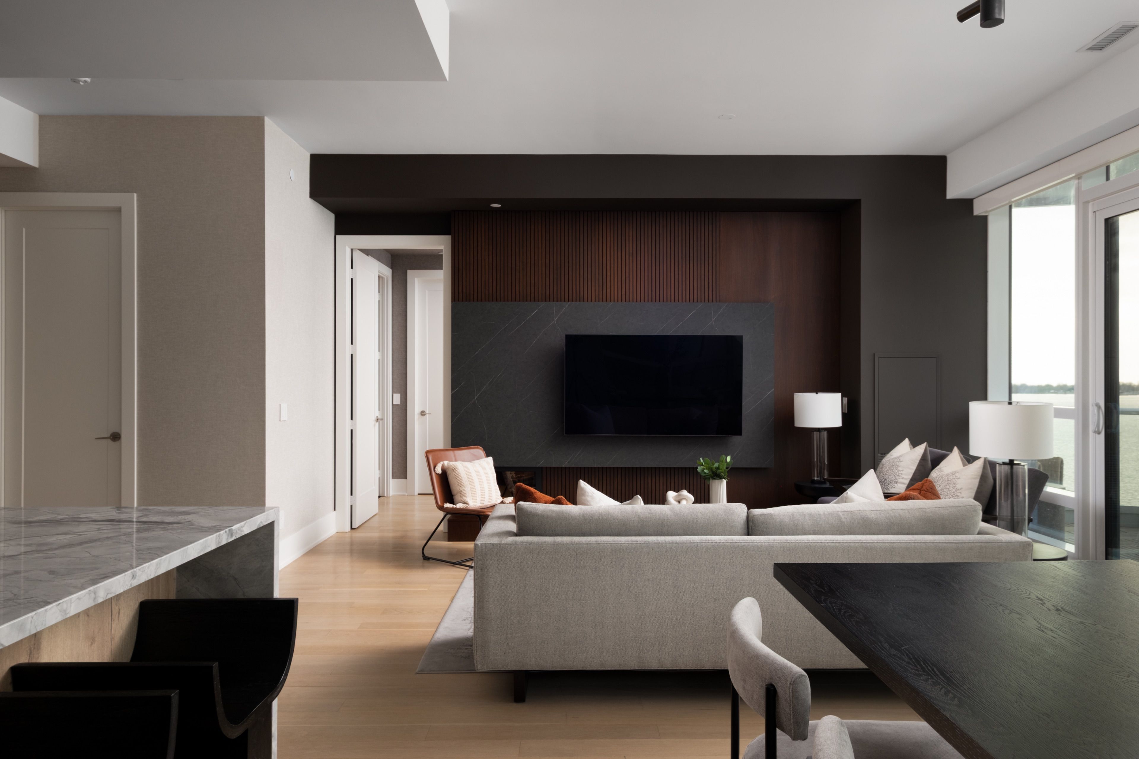 • Open-concept living space features floor-to-ceiling windows and a custom wood wall.