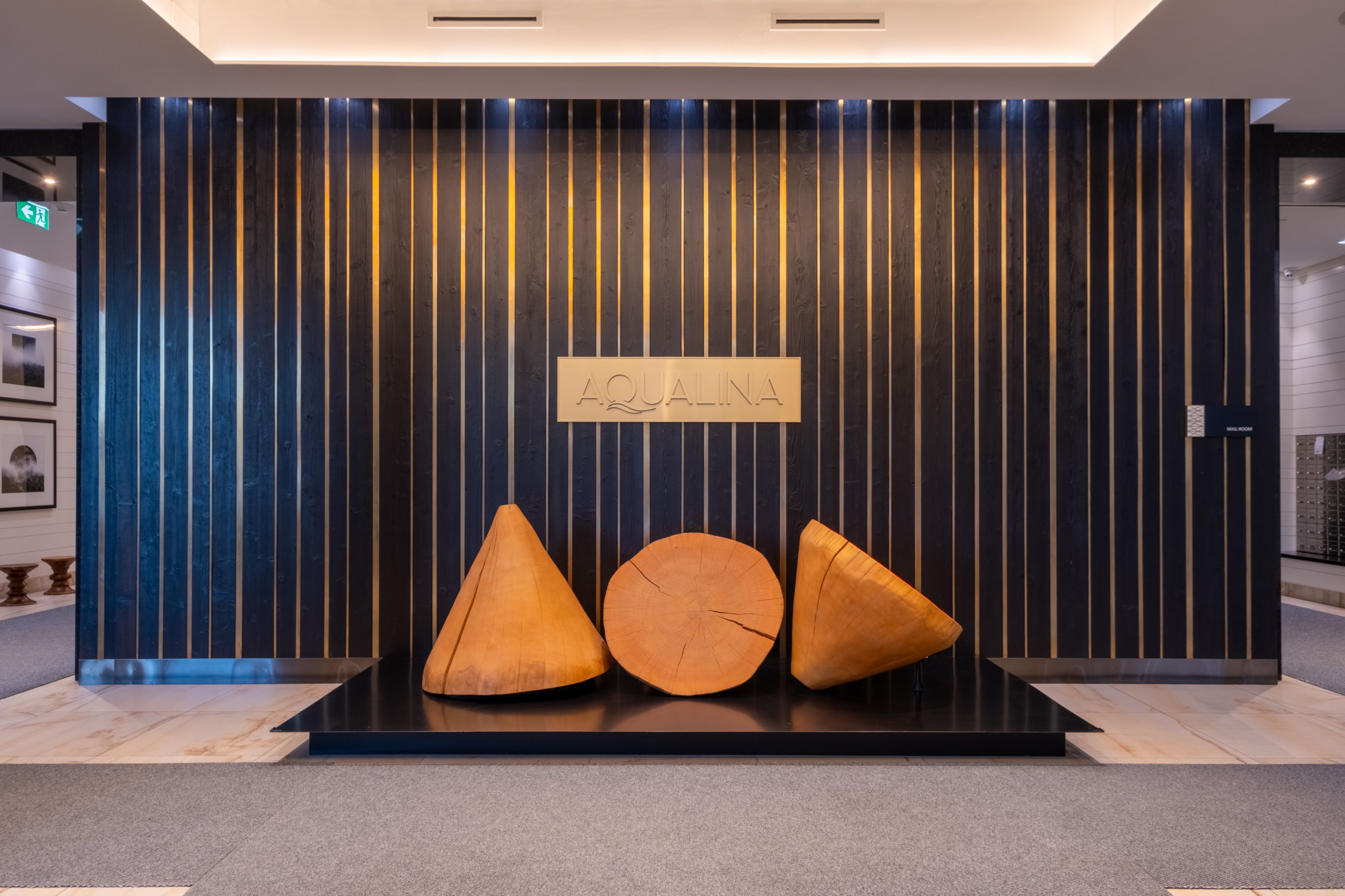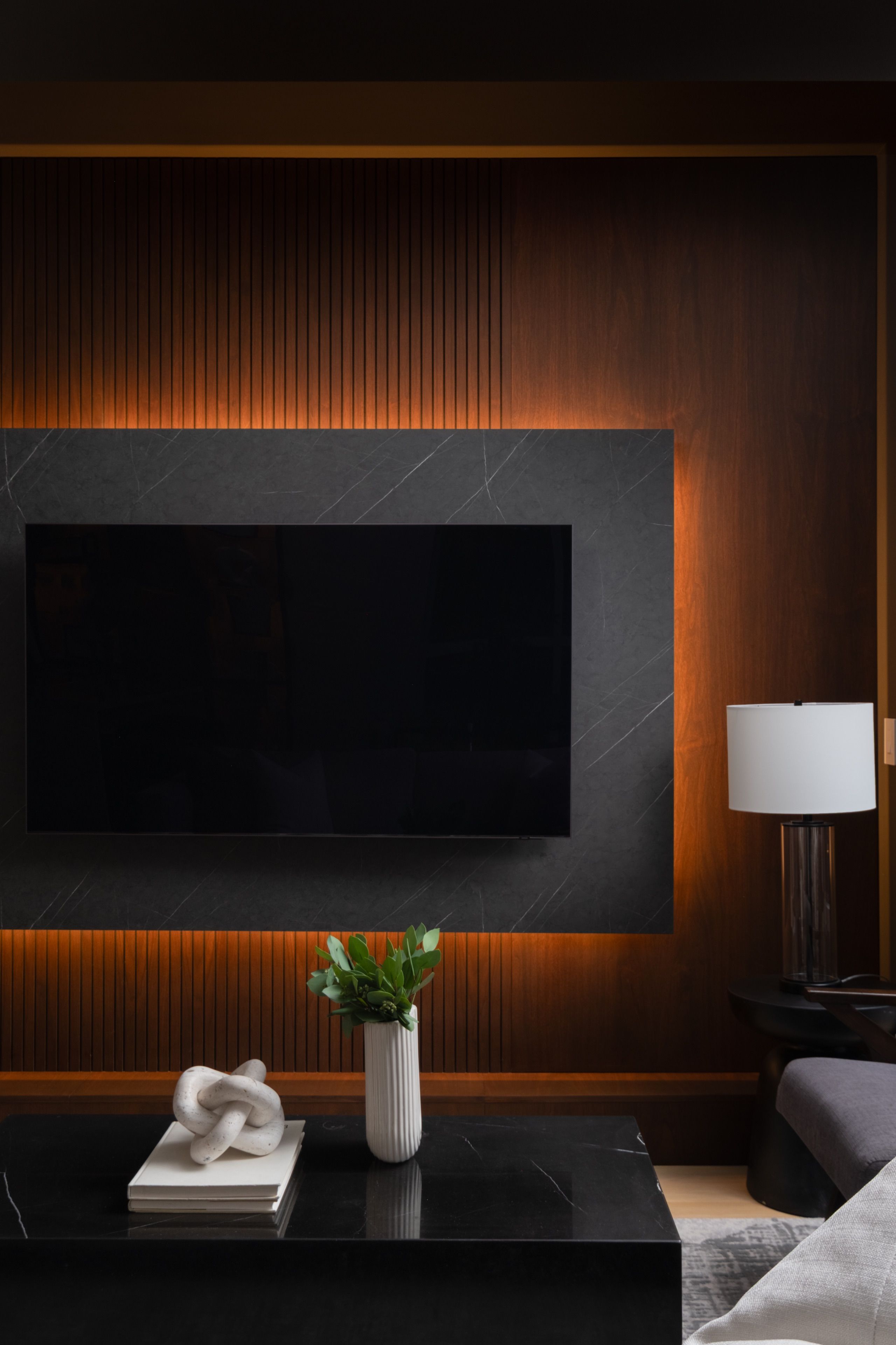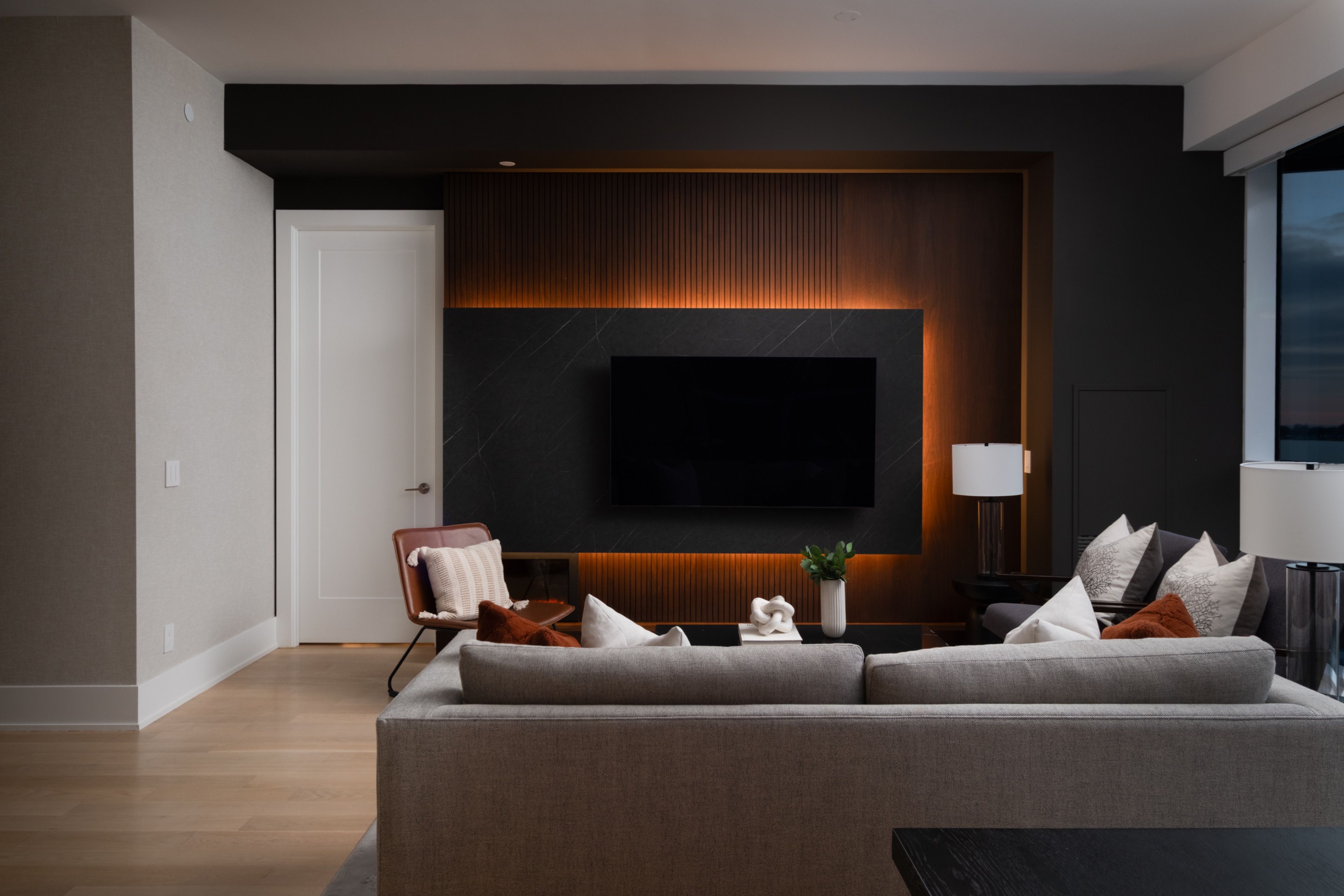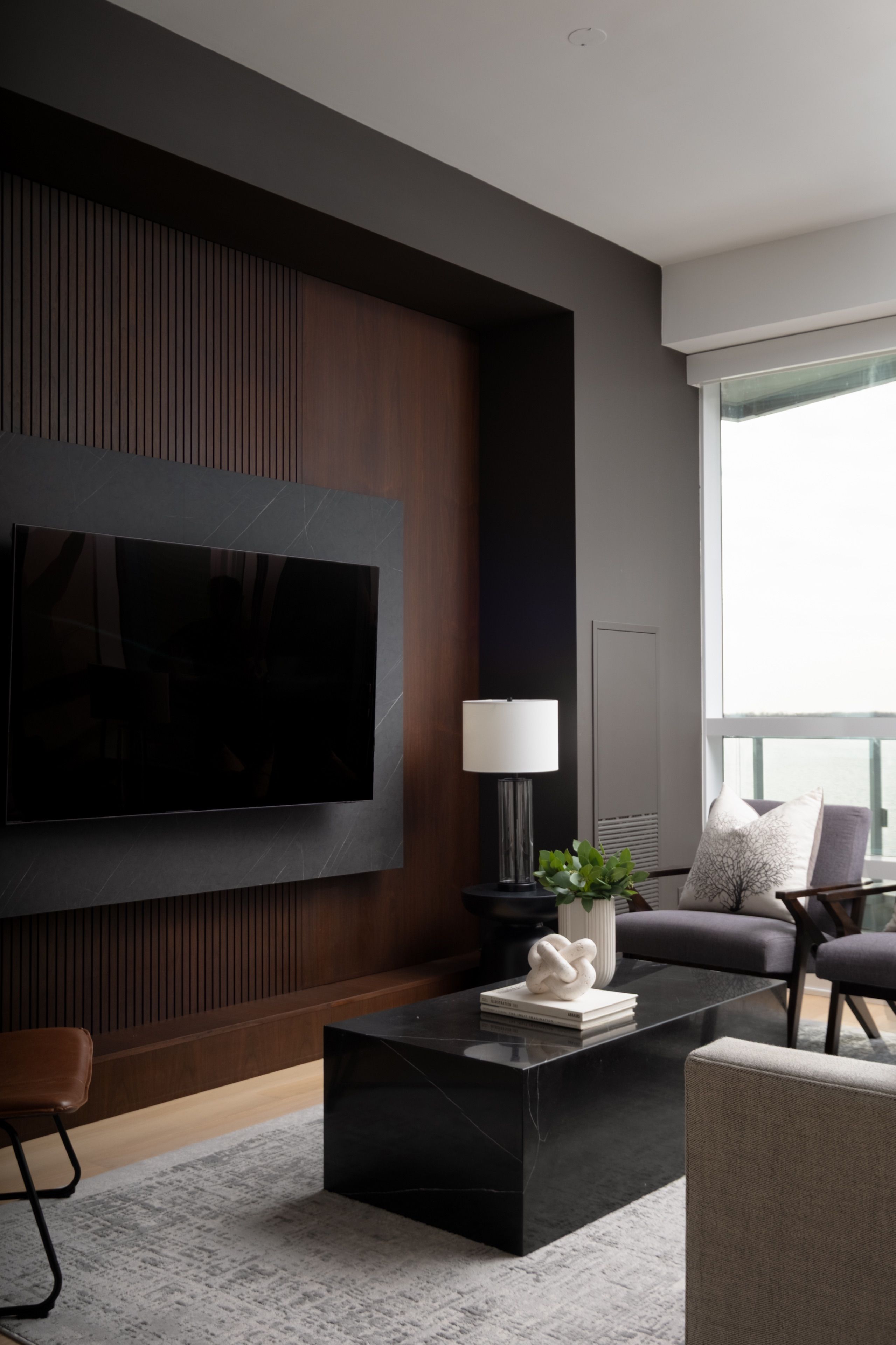 • Open-concept living space features floor-to-ceiling windows and a custom wood wall.
