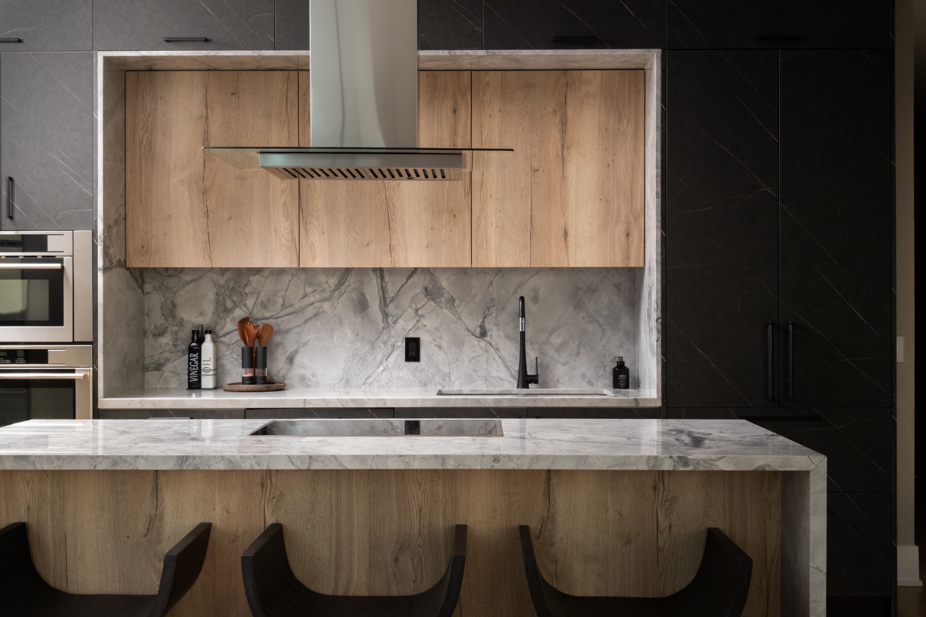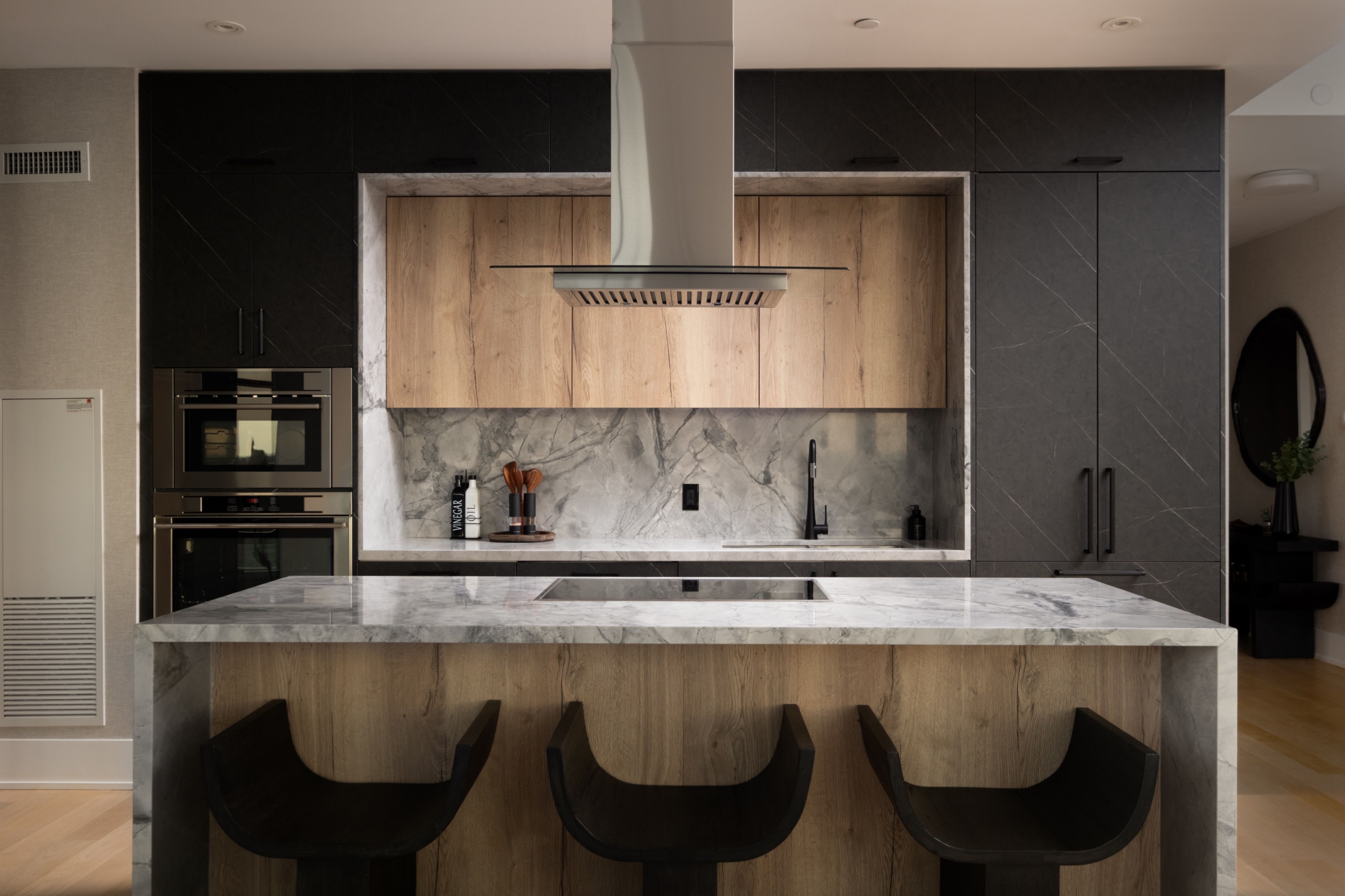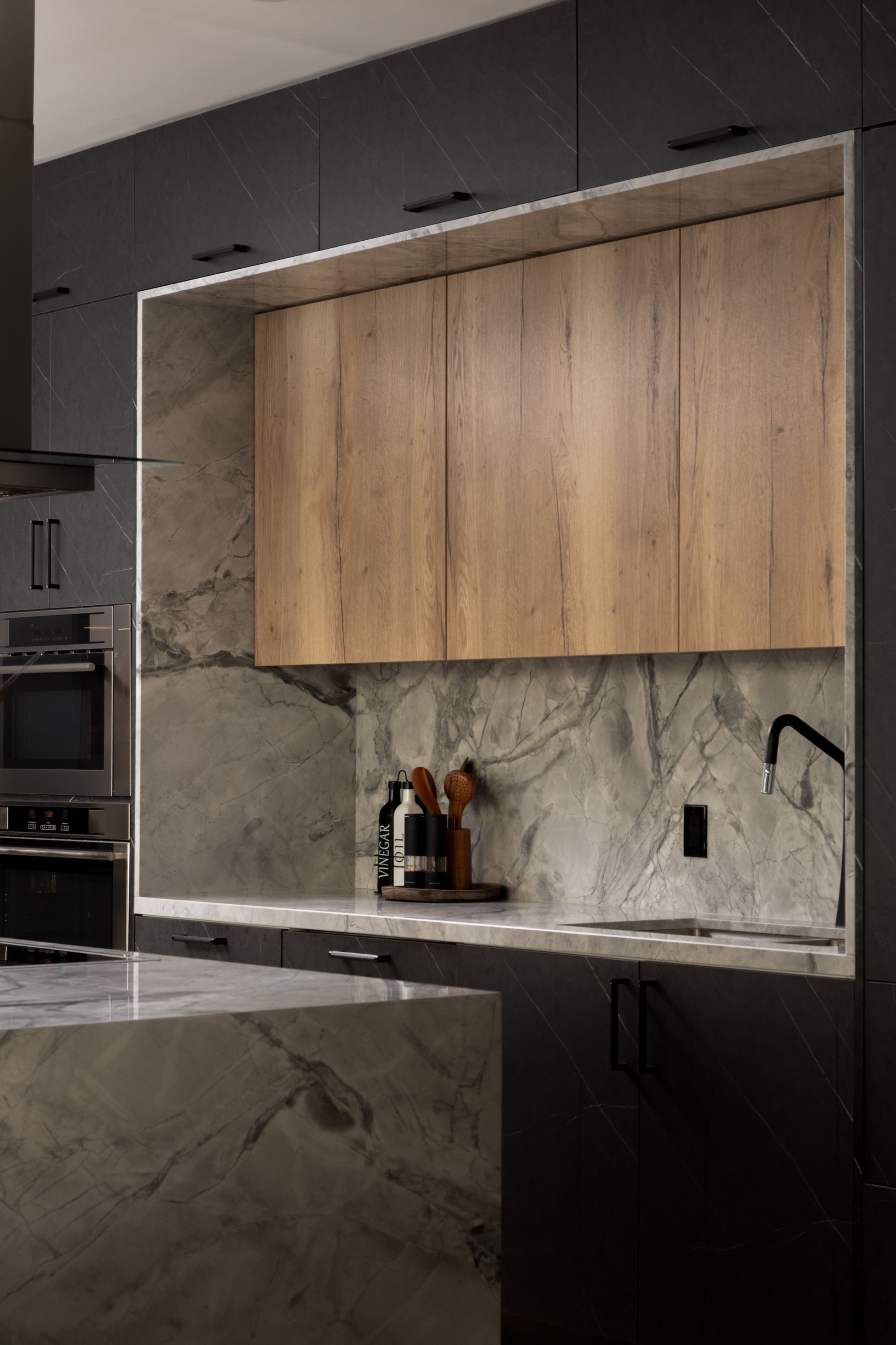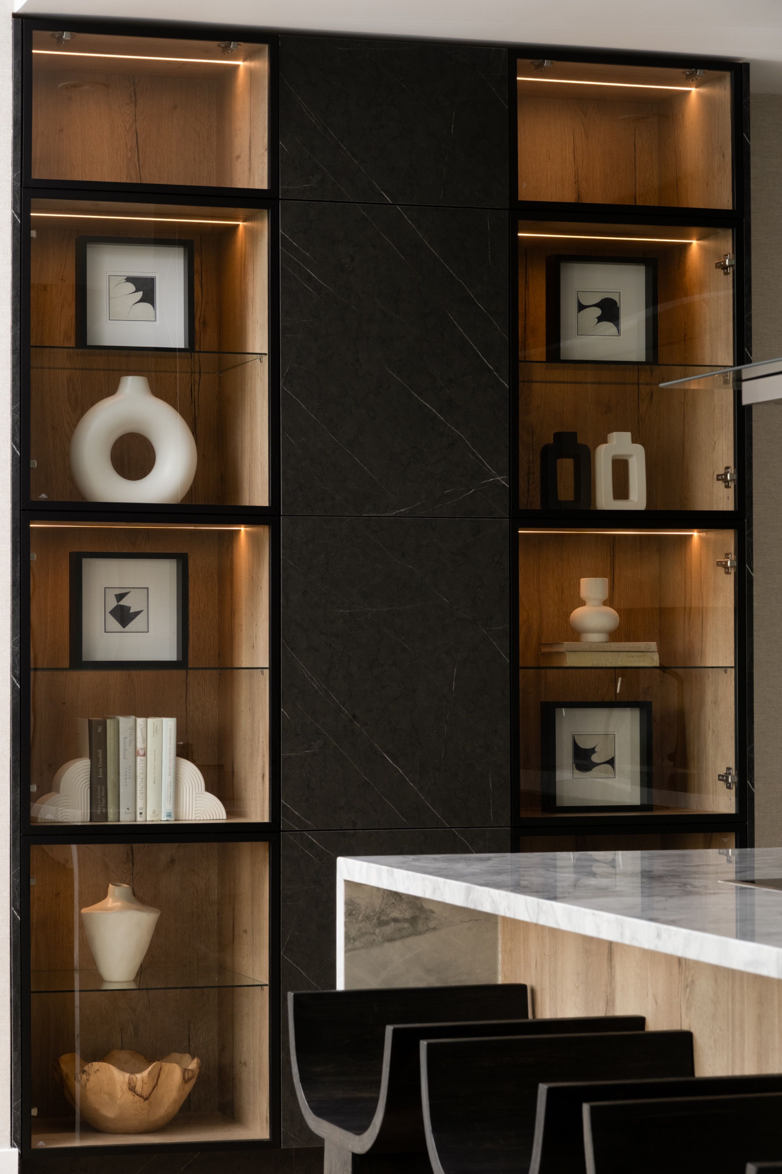 • Chef-inspired kitchen with a dramatic waterfall island and integrated appliances.