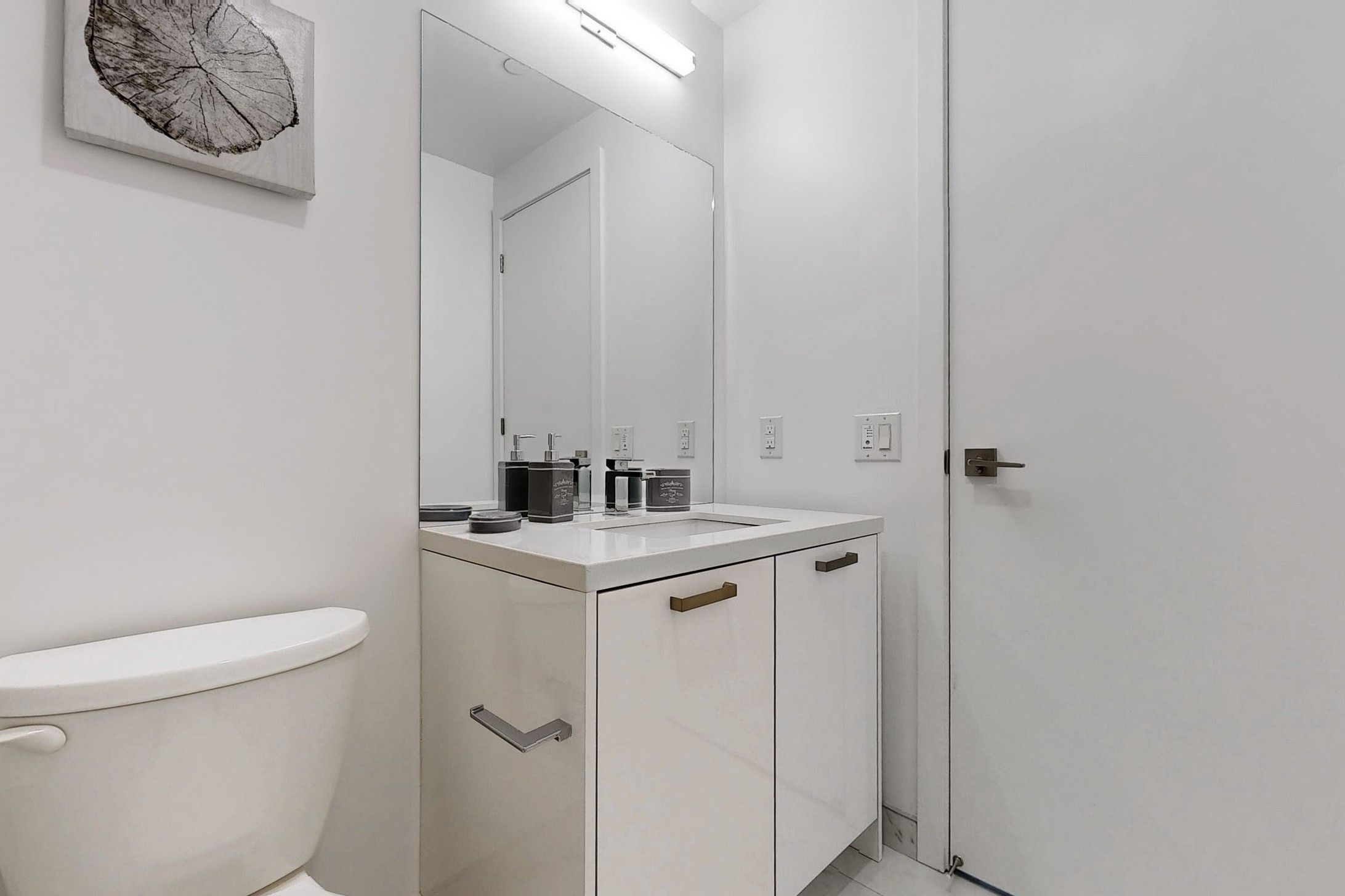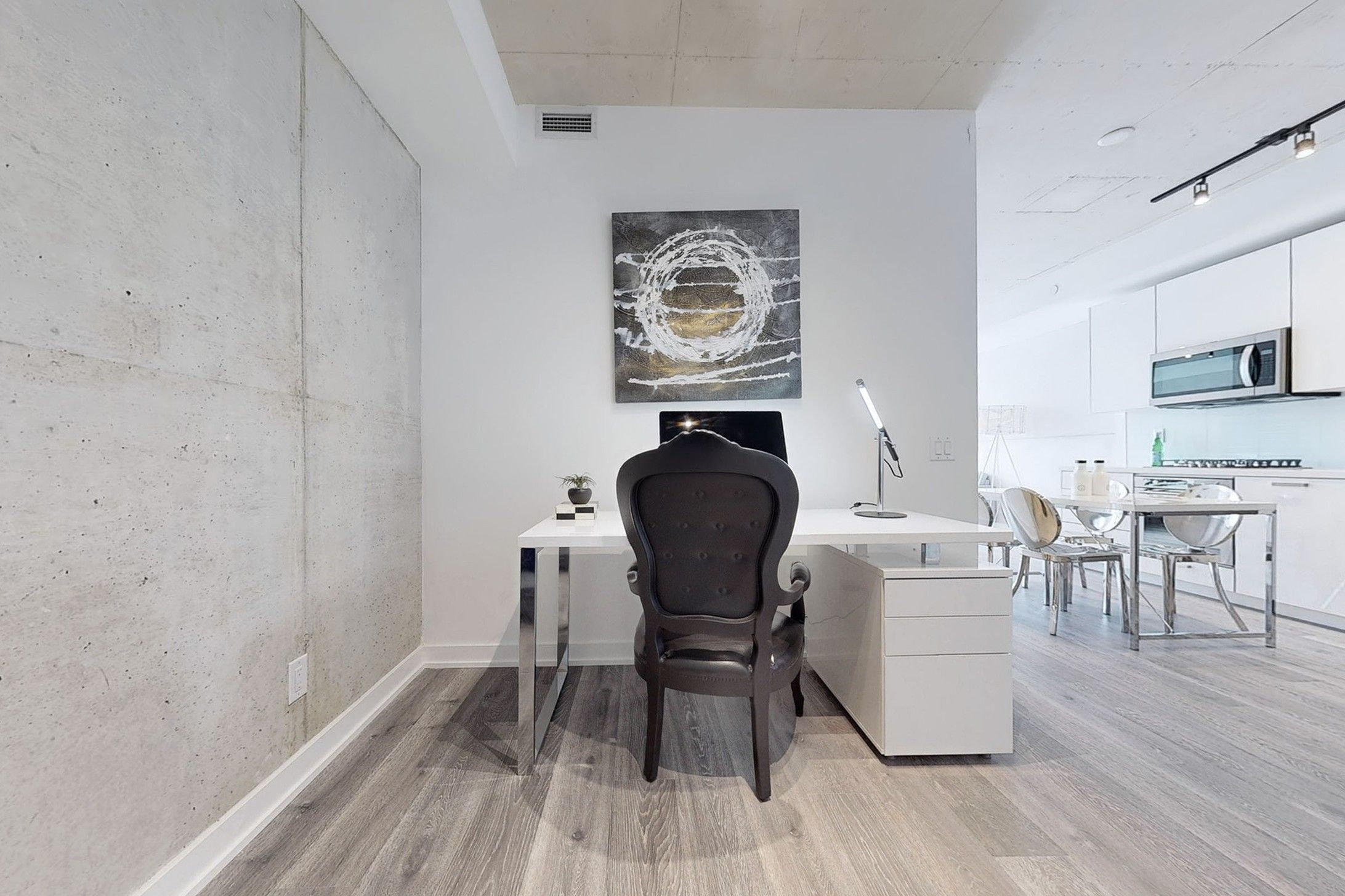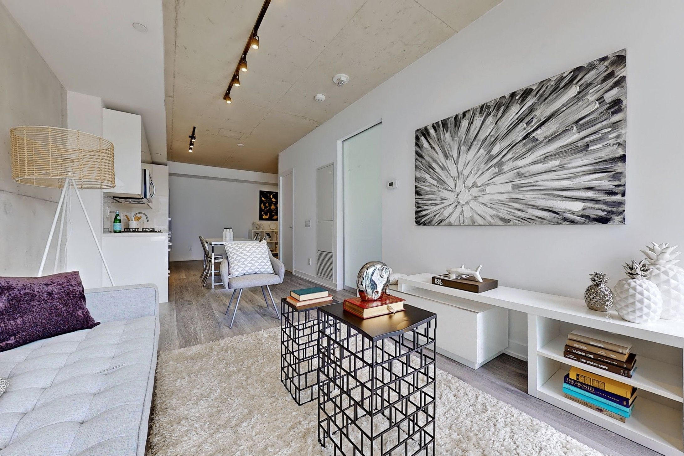 Brand new, never lived in at east 55. Perfect 739 sq ft. One bedroom + den floorplan with soaring 9 ft high ceilings, gas cooking inside, quartz countertops, ultra modern finishes. Ultra chic building with great outdoor pool, gym, party room & visitor parking. Actual finishes and furnishings in unit may differ from those shown in photos.